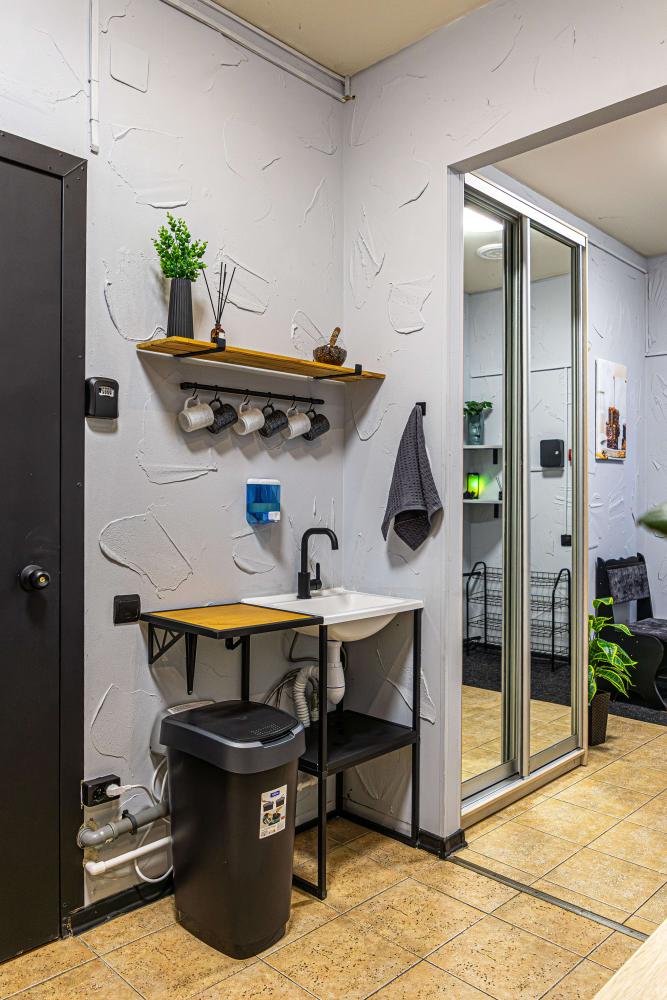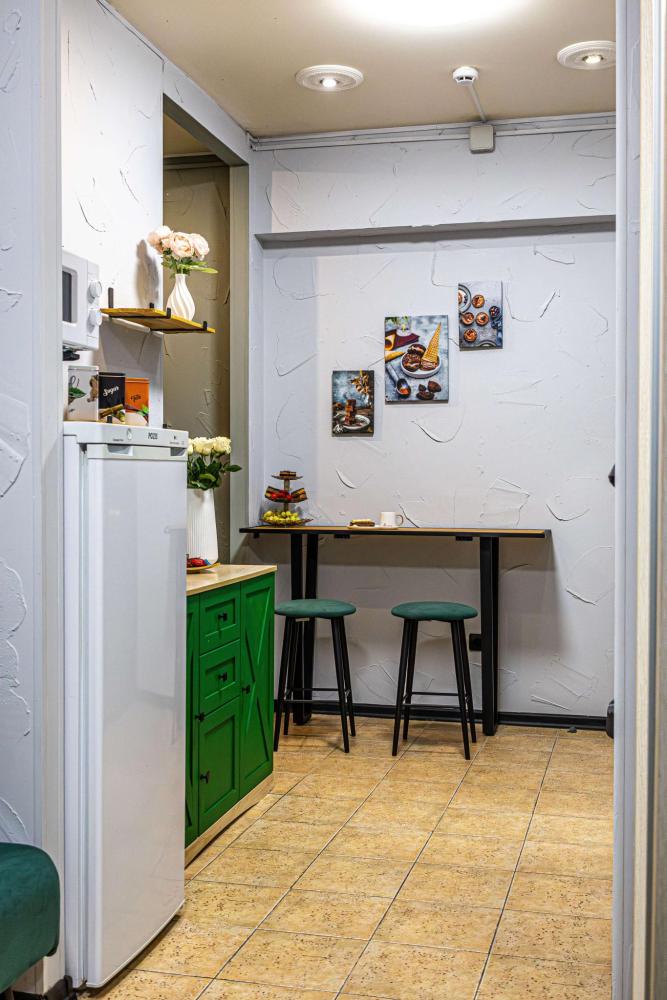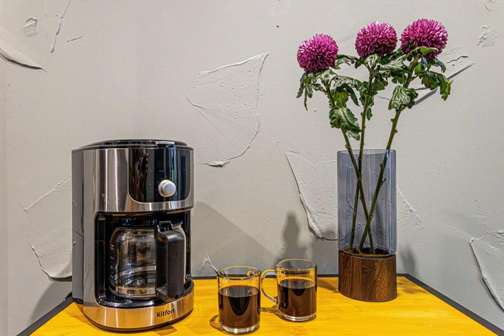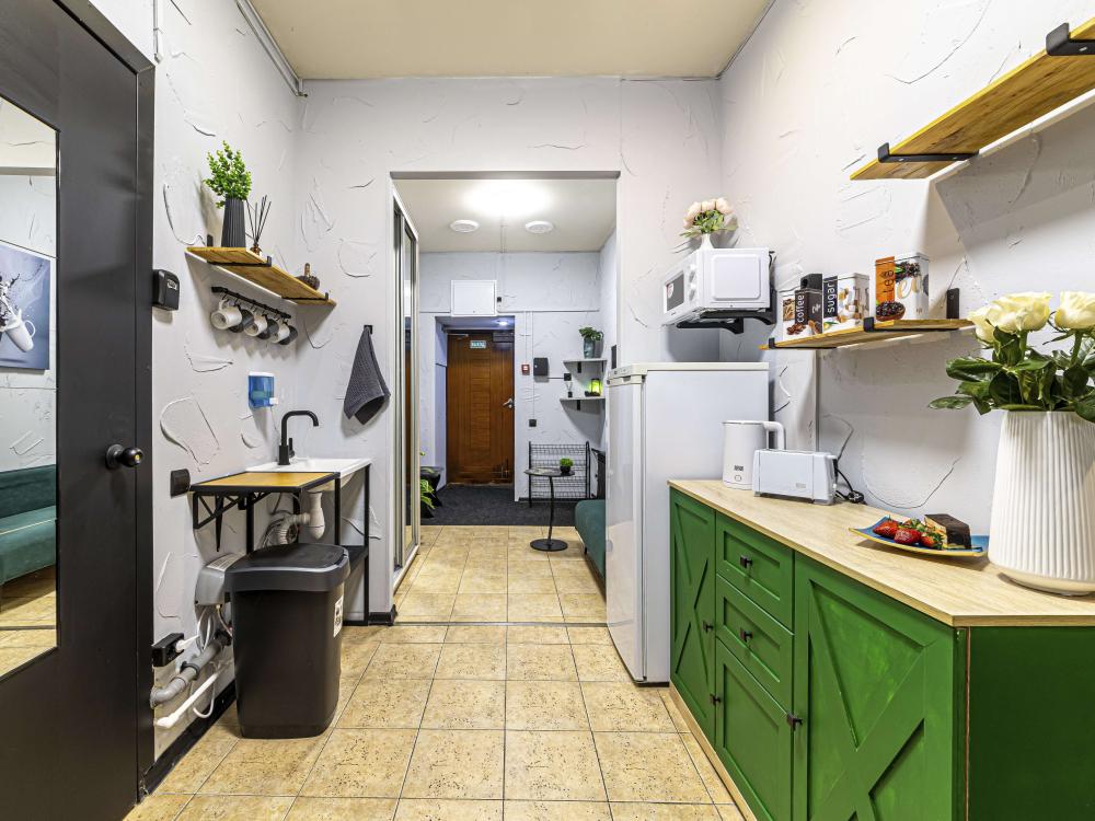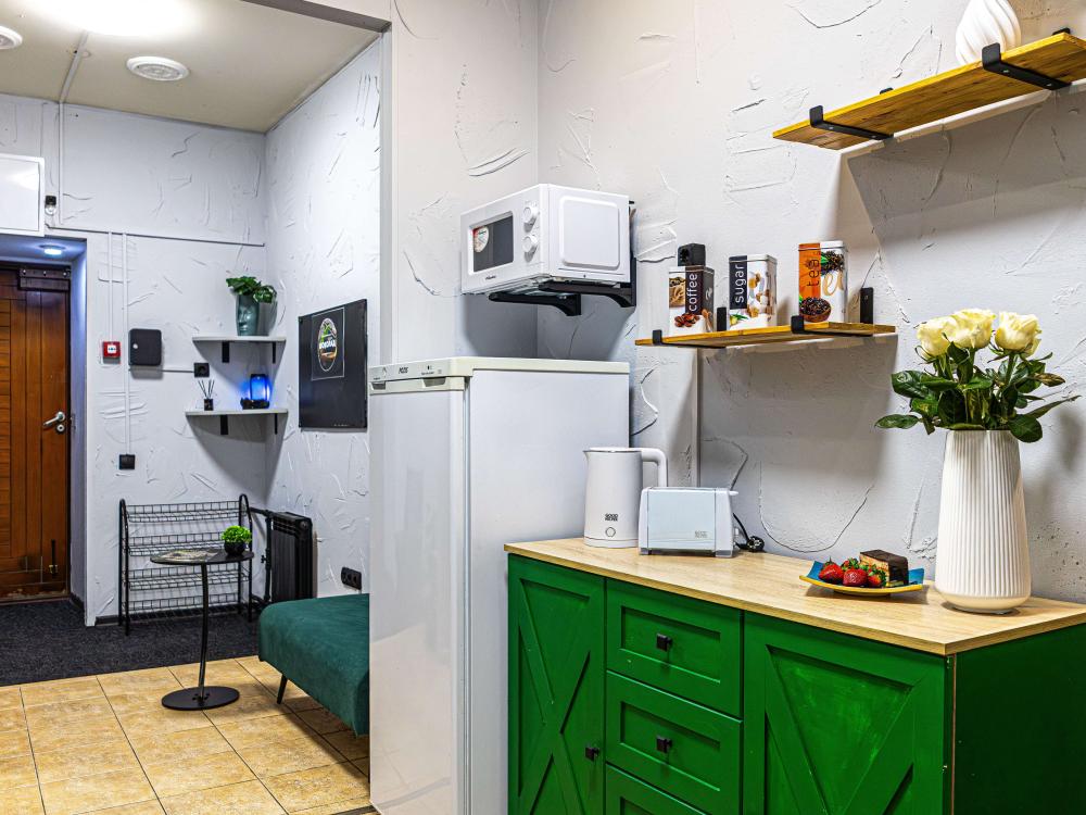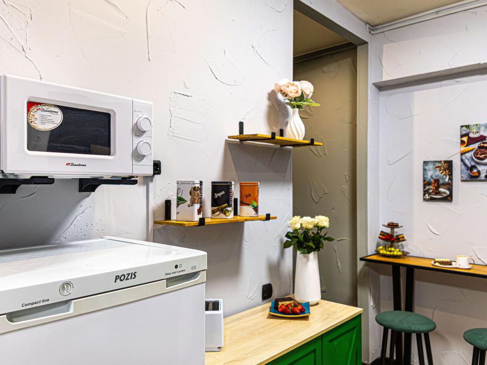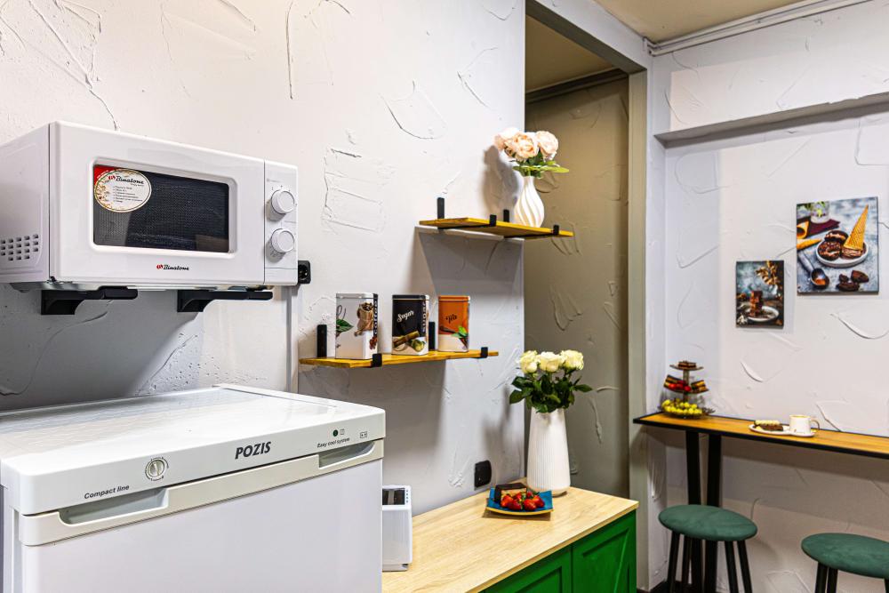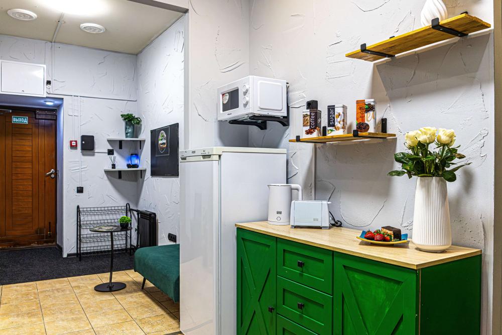 - Чайная зона с посудой, микроволновой печью, холодильником, электрочайником, кофемашиной, тостером.