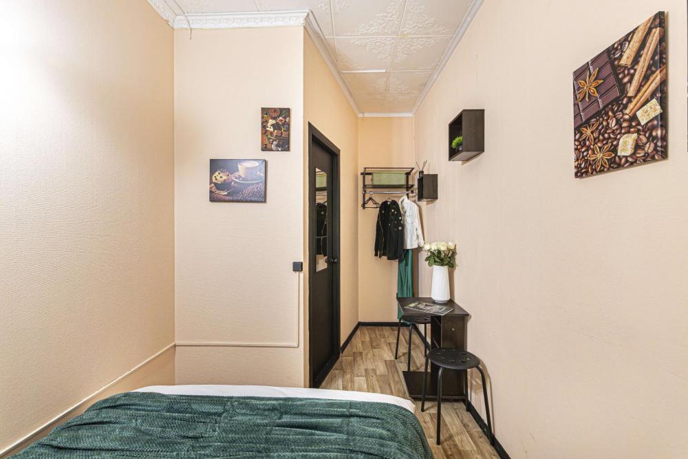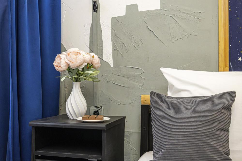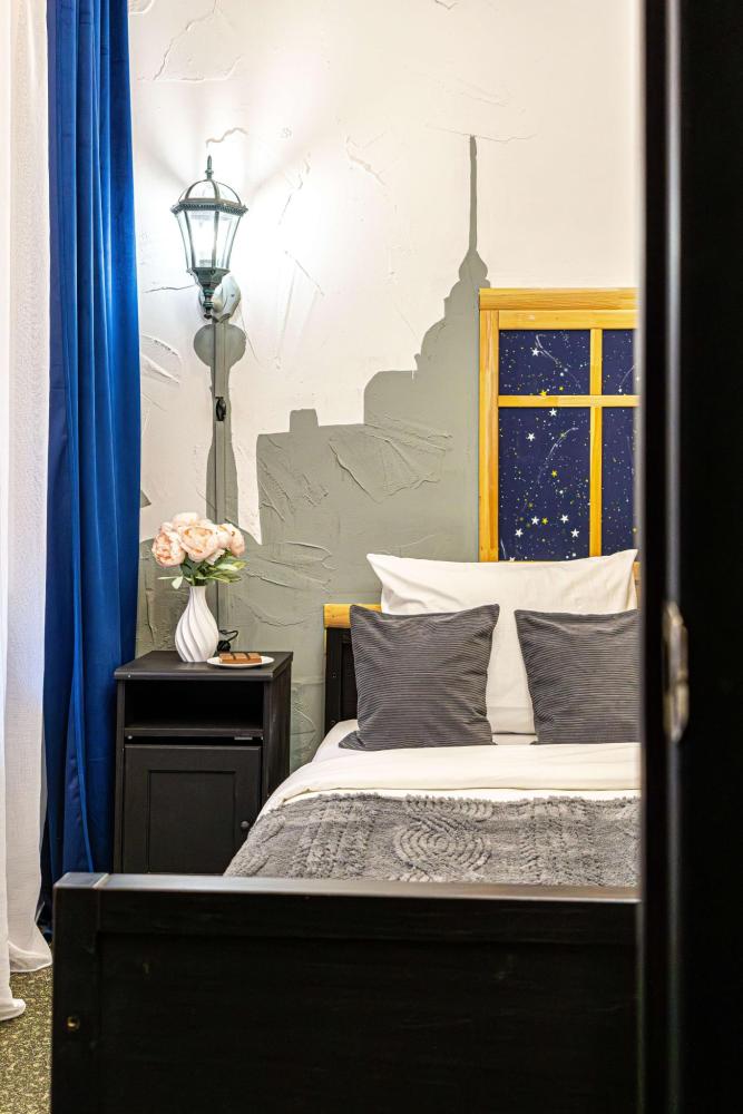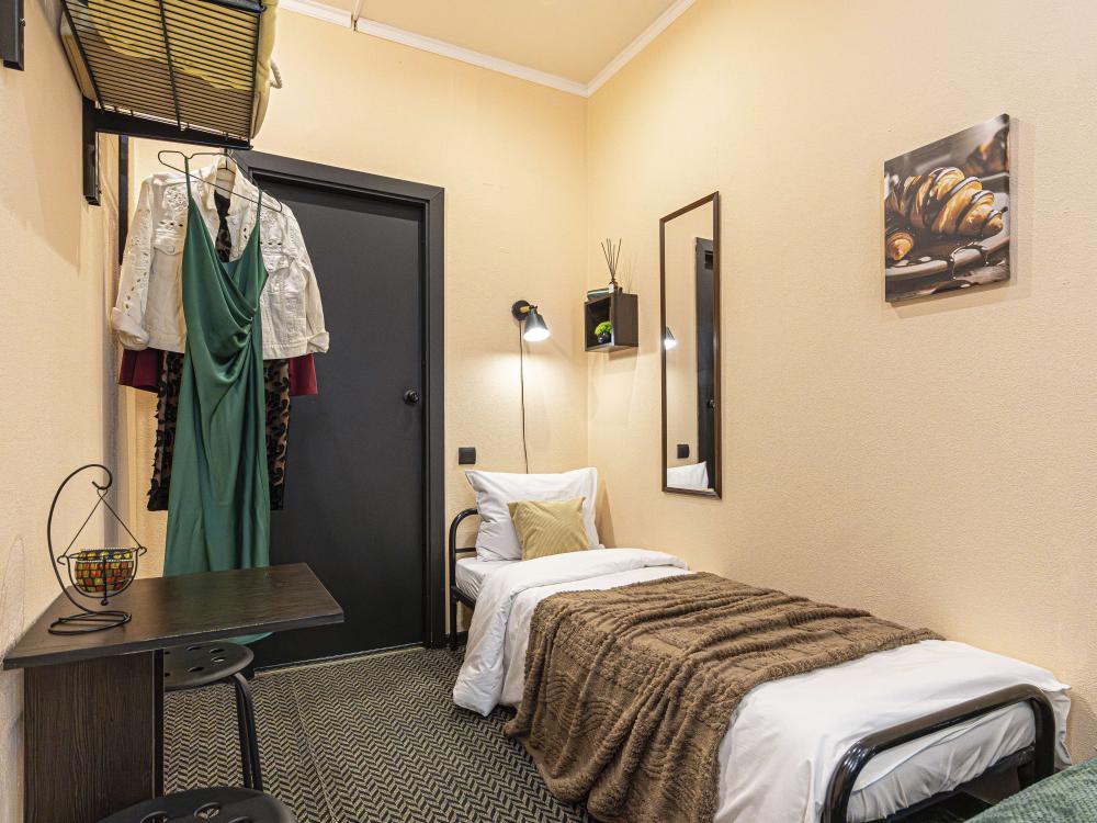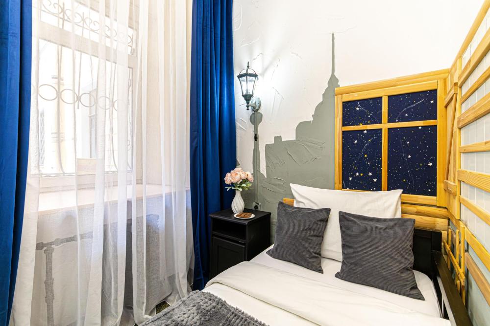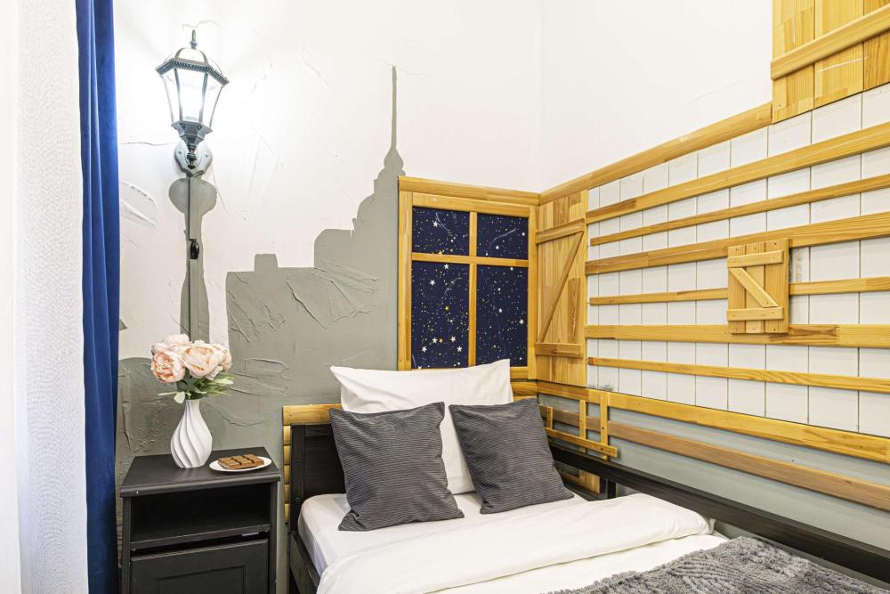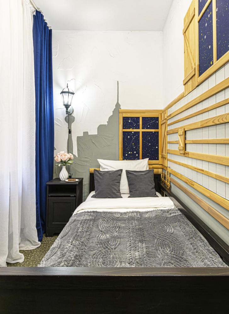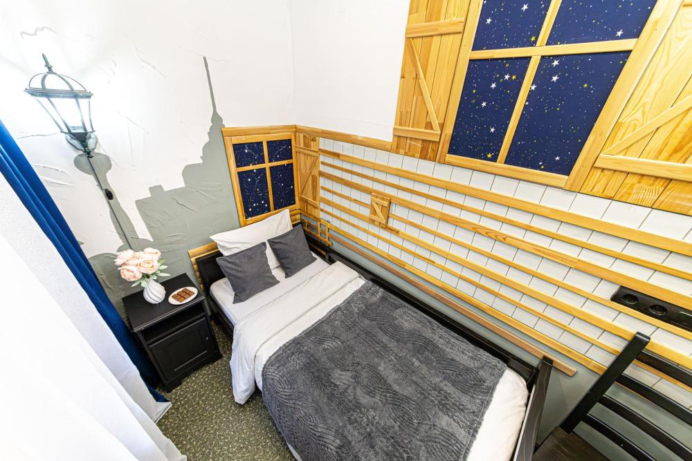 В этой комнате необычное оформление стен с деревянными вставками и милыми окошками, через которые будто видны звезды. В стенах чувствуется атмосфера уюта, подсвеченная теплым светом настольной лампы. Довершает картину мягкое постельное бельё, приглашающее к отдыху. Оборудование комнаты: Уютная односпальная кровать, Прикроватная тумбочка с лампой, Шторы, пропускающие мягкий свет, Полка для одежды и вещей, Розетки для удобной зарядки гаджетов, Сан узел общий.