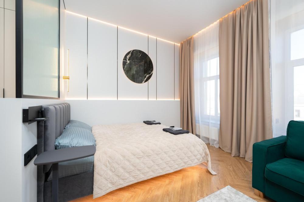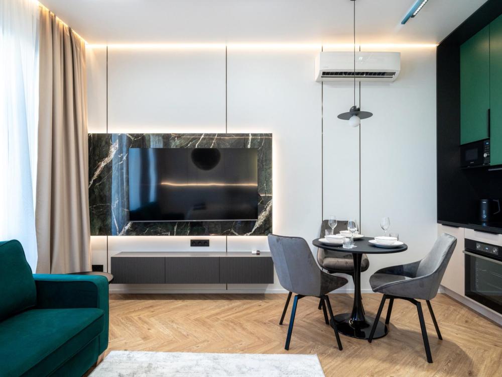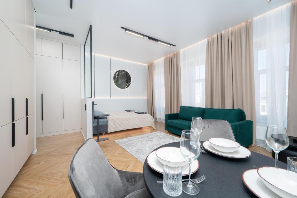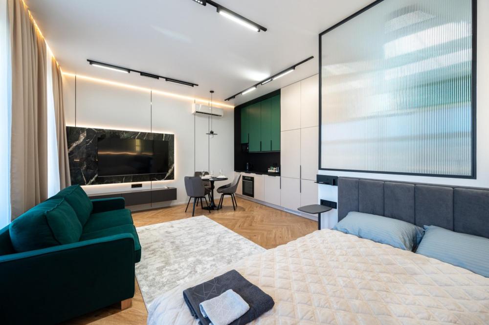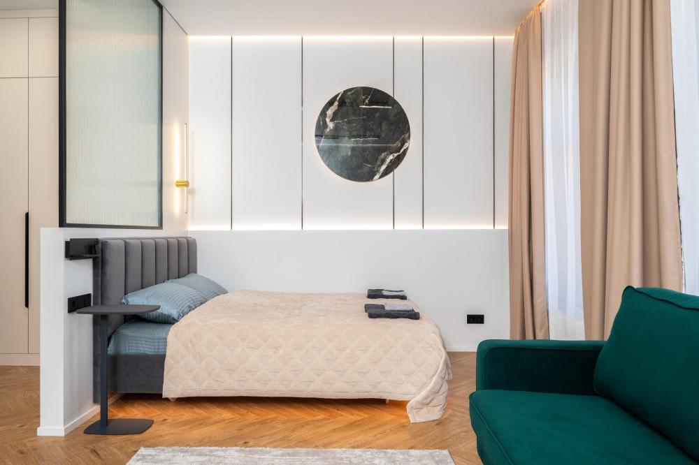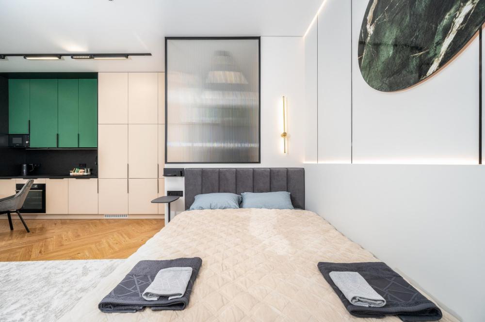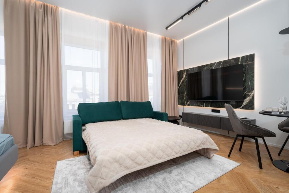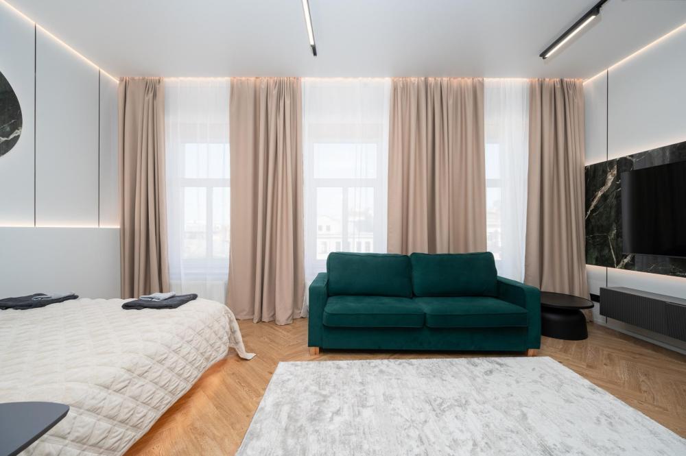 Комфортное размещение для 4 человек: двуспальная кровать (160х200) и двуспальный раскладной диван (160х200). Квартира полностью соответствует всем фото. В кухонной зоне: посудомоечная машина, микроволновая печь, плита, холодильник, чайник, посуда и столовые приборы на любой случай. Чай, кофе, сахар, соль, конфеты. В ванной комнате: туалет, ванна, фен, утюг, стиральная машина, набор гигиенических средств, тапочки, полотенца для ног, рук и тела на каждого гостя. В местах отдыха: постельное белье на каждого гостя, ЖК телевизор со Smart TV, высокоскоростной Wi-Fi в номере бесплатно, кондиционер, зеркало в полный рост.