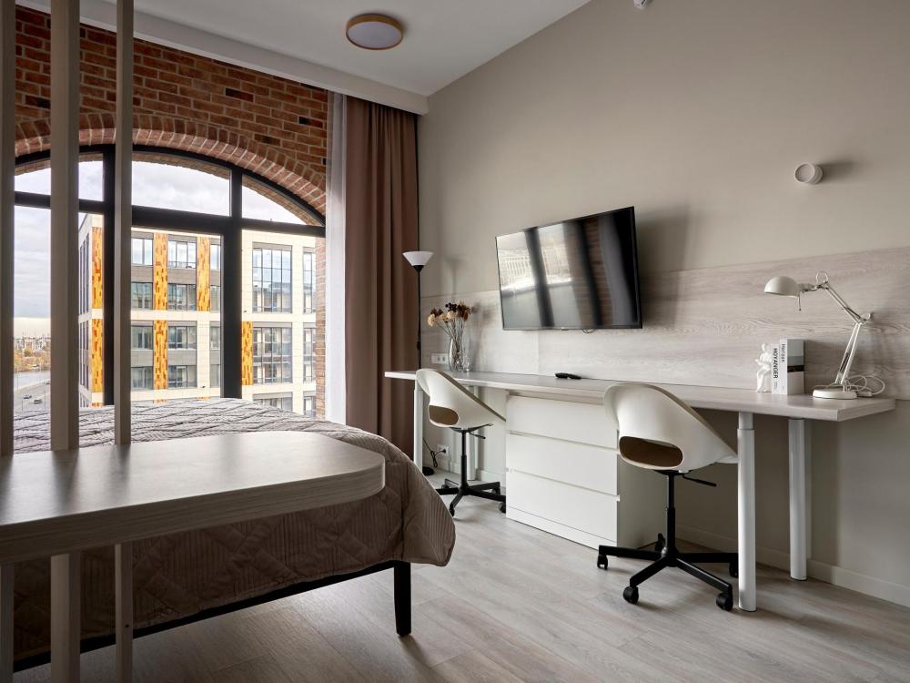 ◼ Студия с панорамными окнами — прекрасный выбор для одного или двух гостей Санкт-Петербурга! ◼ Высокие потолки, панорамные окна, отделка одной из стен клинкерным кирпичом, климатконтроль. ◼ В апартаментах есть все необходимое: двуспальная кровать Queen size (180см*200см) с удобнейшим матрасом, широкоформатный телевизор с цифровым телевидением, Wi-Fi, обеденная группа, плита, микроволновая печь, холодильник, чайник, посуда, столовые приборы, гардеробная с утюгом и гладильной доской, тапочки, ванная комната (душ) с феном, стиральной машиной, гигиеническими принадлежностями и набором полотенец. ◼ Внимание: корпус введен в эксплуатацию в январе 2024 г., сейчас продолжаются отделочные работы на этажах и работы по благоустройству территории в строго разрешенное законодательством время проведения шумных работ; указанные неудобства компенсируются пониженной стоимостью аренды апартамента!◼ * В стоимость проживания не включена ежедневная уборка со сменой постельного белья и полотенец — оплачивается дополнительно по запросу.