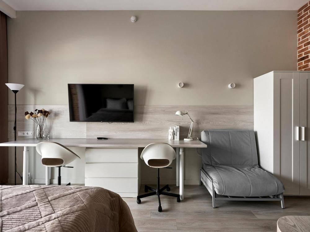 ◼ Студия Супериор с панорамными окнами на 3 и 10 этажах комплекса —прекрасный выбор для для пары или семьи с ребёнком! ◼ Высокие потолки, панорамные окна, отделка одной из стен клинкерным кирпичом, безупречная звукоизоляция, климатконтроль. ◼ В апартаменте сделан дизайнерский ремонт: двуспальная кровать Queen size (160см*200см) с удобнейшим матрасом, дополнительный одноместный диван — удобно для семьи с ребенком ! Широкоформатный телевизор с цифровым телевидением, Wi-Fi, обеденная группа, плита, микроволновая печь, холодильник, чайник, посуда, столовые приборы, капсульная кофемашина Nеsрrеssо с набором капсул, посудомоечная машина, гардеробная с утюгом и гладильной доской, тапочки, ванная комната с феном, стиральной и сушильной машинами, гигиеническими принадлежностями и набором полотенец. ◼ Внимание: корпус введен в эксплуатацию в январе 2024 г., сейчас продолжаются отделочные работы на этажах и работы по благоустройству территории в строго разрешенное законодательством время проведения шумных работ; указанные неудобства компенсируются пониженной стоимостью аренды апартамента! * В стоимость проживания не включена ежедневная уборка со сменой постельного белья и полотенец — оплачивается дополнительно по запросу.