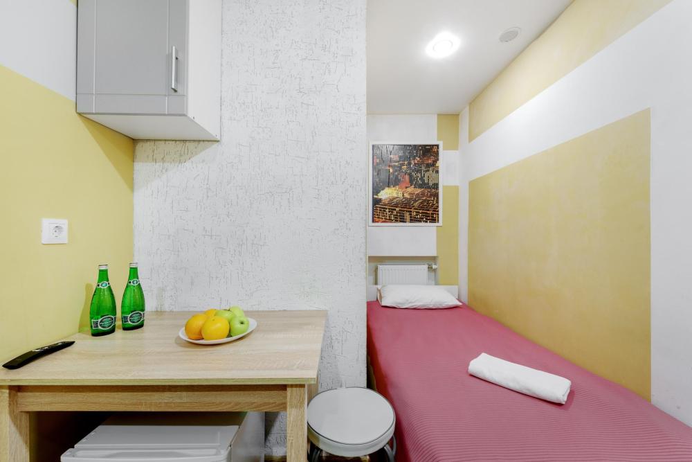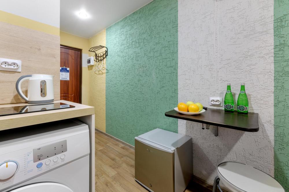 Одноместные апартаменты без окна оснащены всем необходимым для комфортного проживания. Включают в себя спальную зону, кухню и собственную ванную комнату. Совмещенный санузел с душевой кабиной. Кабельное телевидение, WiFi . Кухня оснащена : индукционная плитка, чайник, холодильник и вся необходимая посуда - фен, стиральная машина .