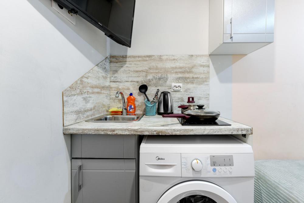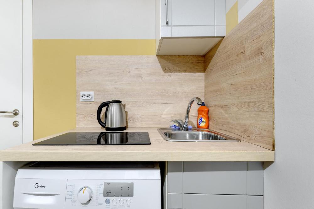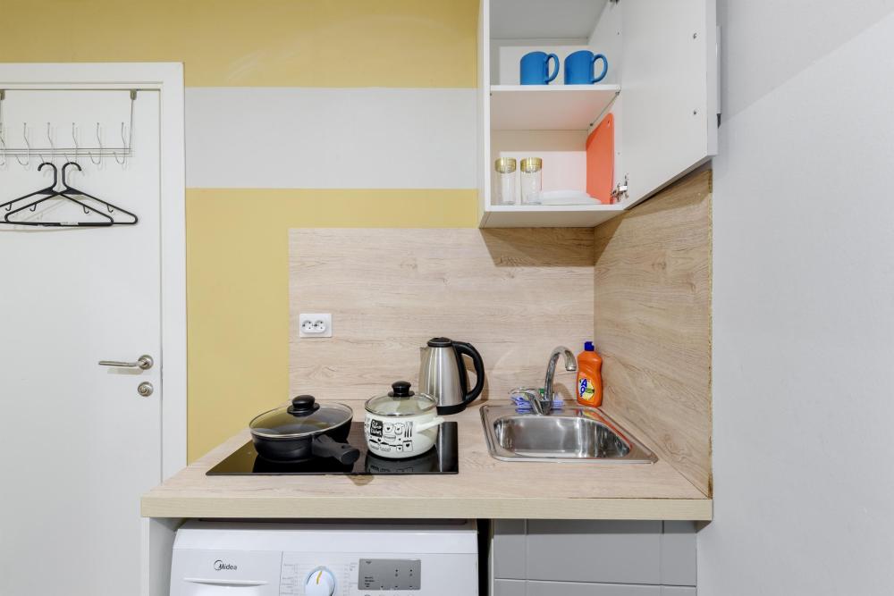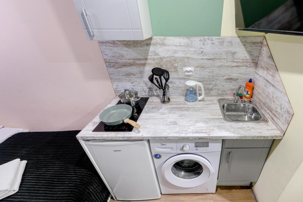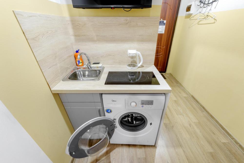 Апартаменты оснащенные всем необходимым для комфортного проживания двоих гостей. Каждые апартаменты включают в себя спальную зону, кухню и собственную ванную комнату. Совмещенный санузел с душевой кабиной. Кабельное телевидение, WiFi . Кухня оснащена : индукционная плитка, чайник, холодильник и вся необходимая посуда - фен, стиральная машина .