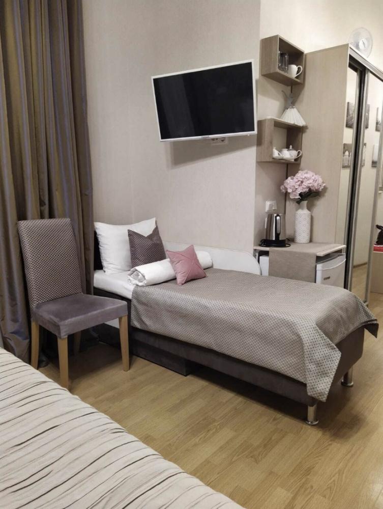# 105 Балерина - так называется эта комната. Изящество и характер. Комната с высокими потолками стилизована под атмосферу венецианской романтики и утонченного аристократизма, особого духа ценимого многими в эпоху Ренессанса. Романтический, элегантный, роскошный венецианский стиль способен превратить жизнь в вечный праздник и зарядить особым настроением города на воде. В комнате одна очень большая двуспальная кровать размера king-size и одноместный раскладной диванчик (дополняется комфортным матрасом). Из окон открывается вид на классический питерский дворик. На окнах москитные сетки и устройство для микровентиляции. Собственная комфортная ванная комната с душем. Предоставляются полотенца, тапочки, фен, гель для душа, шампунь, кондиционер, антибактериальное средство для рук, халаты. В комнате есть холодильник, телевизор, много розеток, сушилка для обуви, сушилка на батарею. Мобильный складной столик для ноутбука. В общей зоне: стиральная машина, микроволновая печь, кофеварка, чайник, чай, кофе, питьевая вода, гладильная доска, утюг. Бесплатный Wi-Fi.