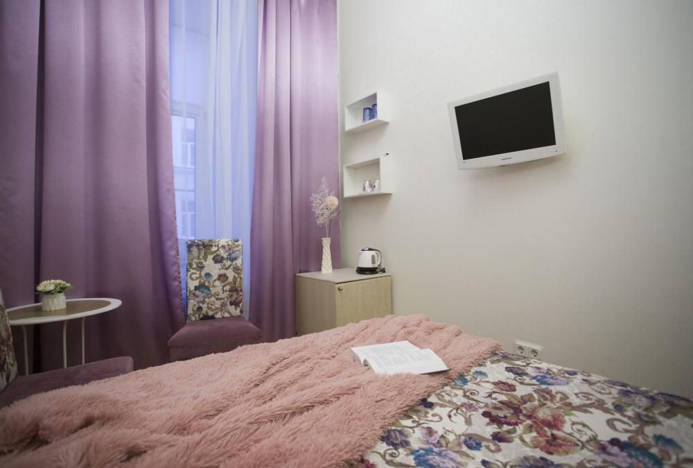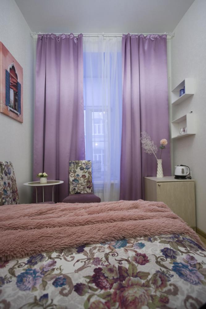 #104 Будуар - так называется эта комната. Будуар это комната для комфортного отдыха и дамского туалета, в которой женщина чувствует себя единственной хозяйкой и сама устанавливает "правила игры". Комната с высокими потолками стилизована под атмосферу венецианской романтики. В комнате одна очень большая двуспальная кровать размера king-size. Из окон открывается ограниченный вид на классический питерский дворик. На окнах москитные сетки и устройство для микровентиляции. Собственная комфортная ванная комната с душем. Предоставляются полотенца, тапочки, фен, гель для душа, шампунь, кондиционер, антибактериальное средство для рук, халаты (по запросу). В комнате есть холодильник, телевизор, много розеток, сушилка для обуви, сушилка на батарею. Мобильный складной столик для ноутбука (по запросу). В общей зоне: стиральная машина, микроволновая печь, кофеварка, чайник, чай, кофе, питьевая вода, гладильная доска, утюг. Бесплатный Wi-Fi.