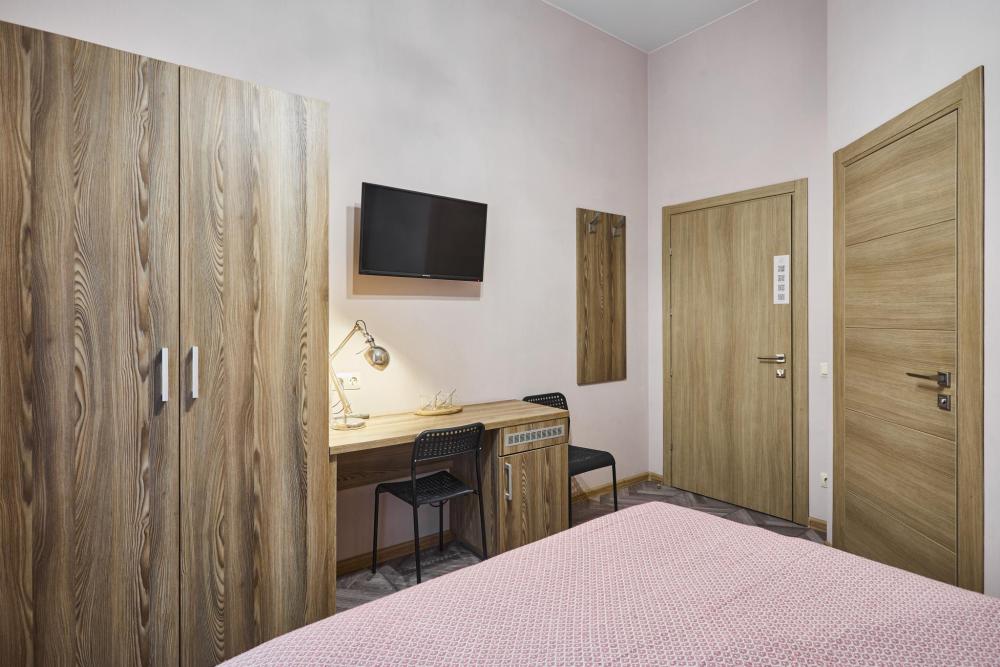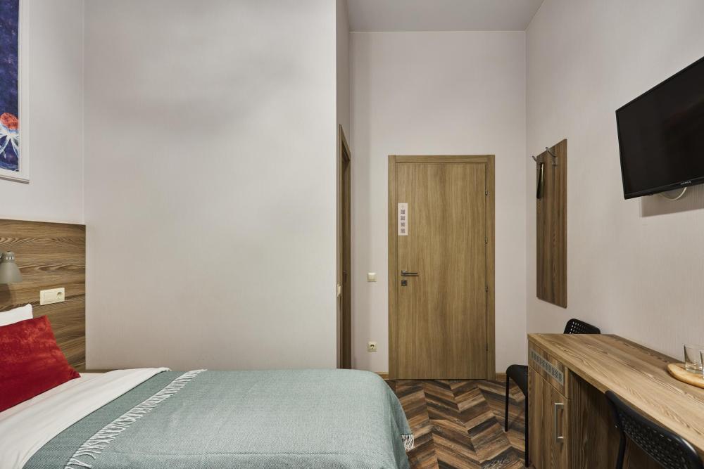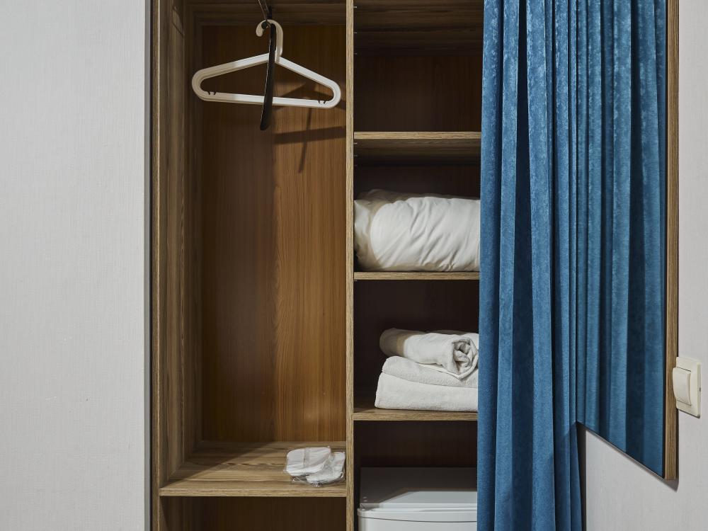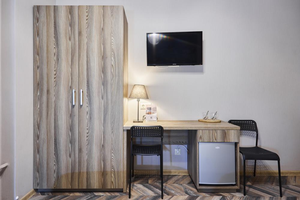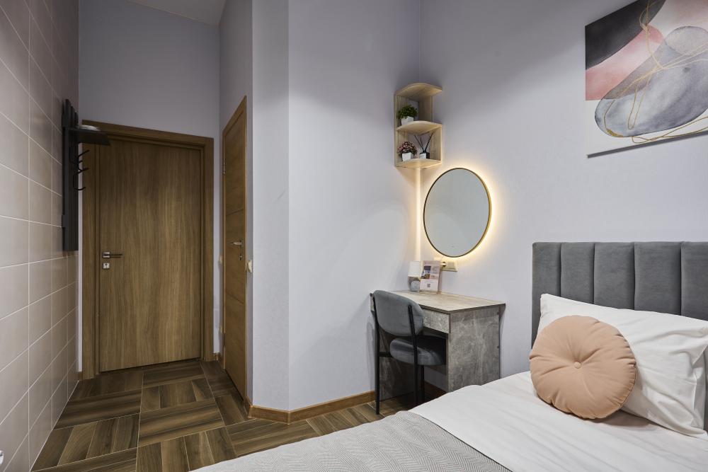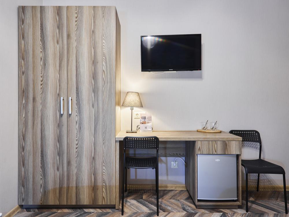 Улучшенный одноместный Площадь 12 кв.м. Наполняемость : Кровать размер 80*190, Прикроватные тумбочки 1шт, Рабочий стол, Шкаф/гардероб, Телевизор с плоским экраном Отдельный санузел с душевой кабиной Комплект полотенец, белье, фен и тапочки предоставляются бесплатно Шампунь, Гель для душа, Мыло, Шапочка для душа предоставляются бесплатно Гладильные принадлежности (гладильная доска и утюг) предоставляются бесплатно по запросу