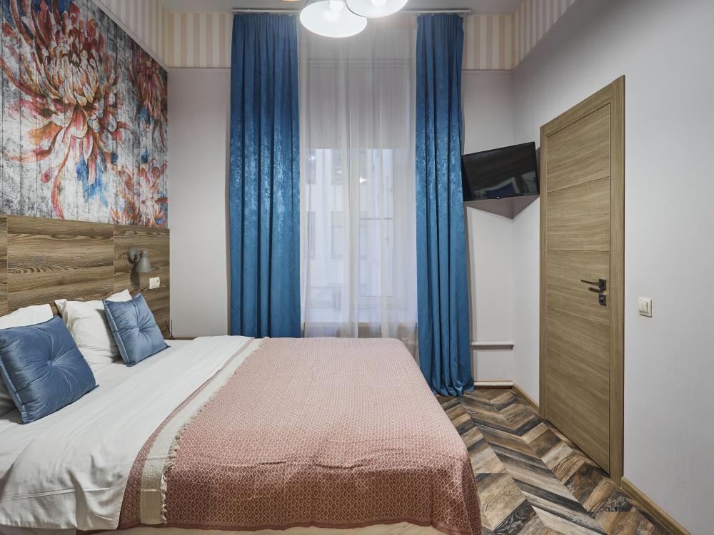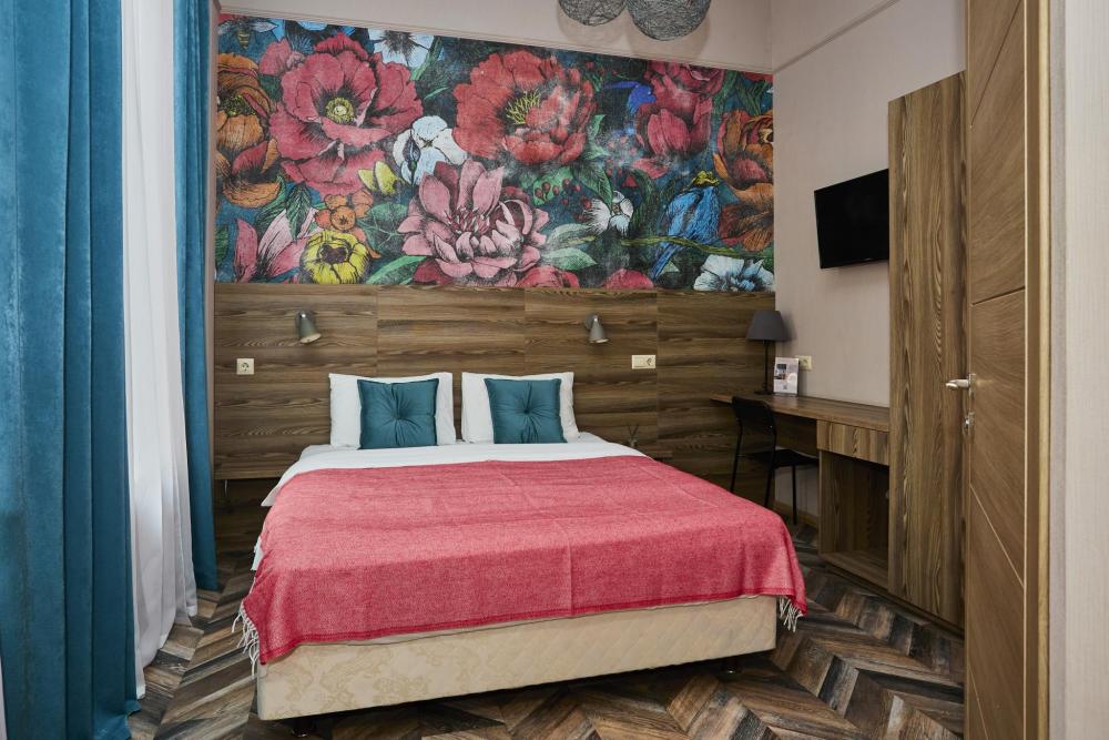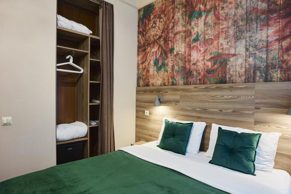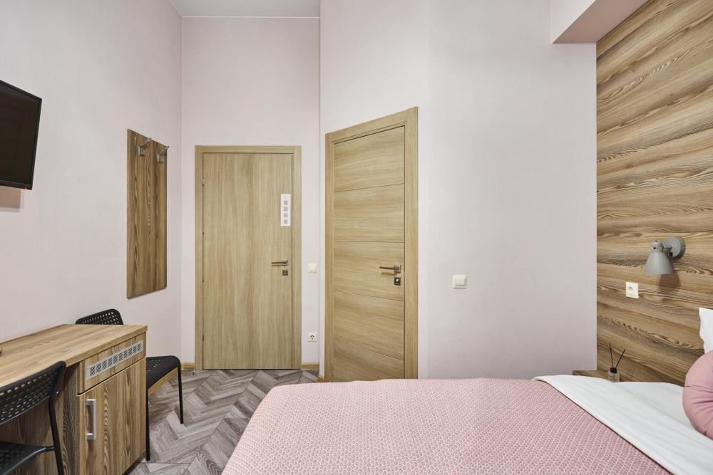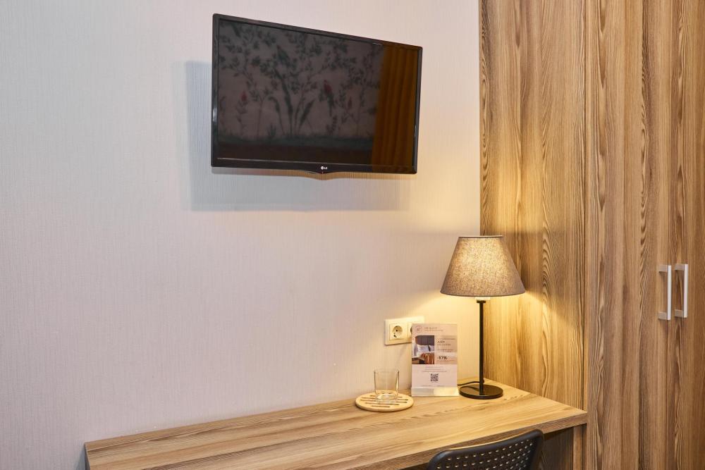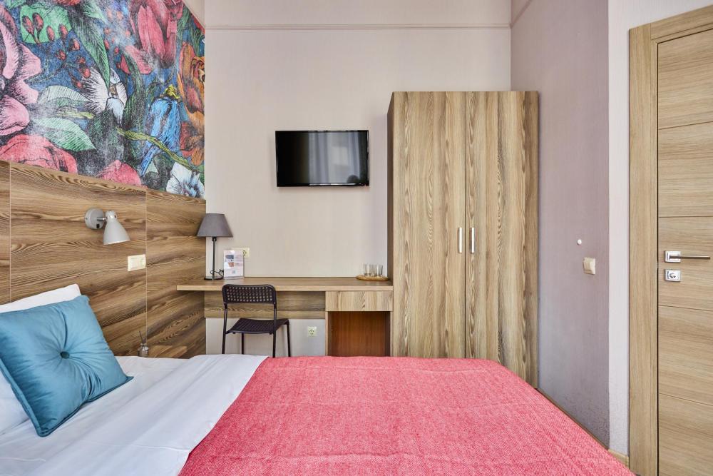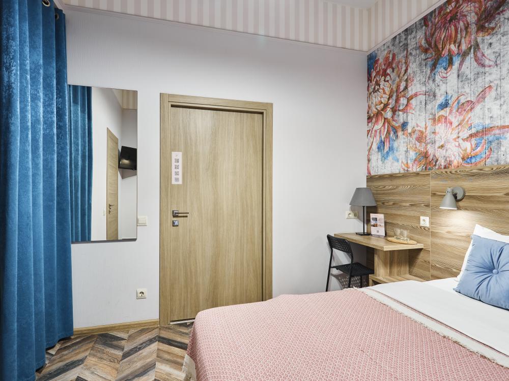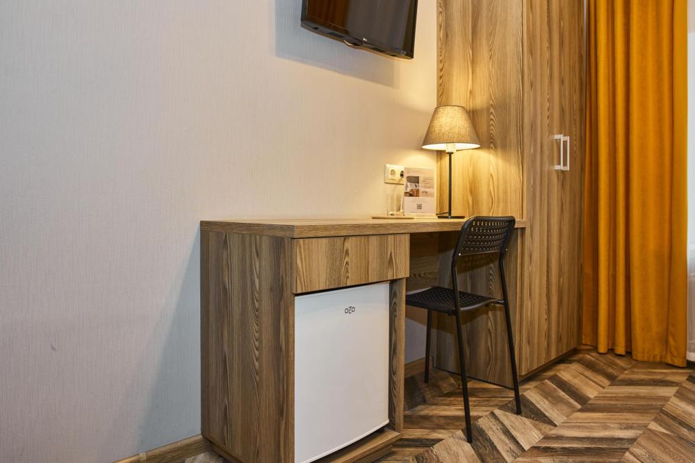 Двухместный с 1 двуспальной кроватью Площадь 16 м2 Наполняемость : Кровать размер 180*190, Прикроватные тумбочки 2шт, Рабочий стол, Шкаф/гардероб, Телевизор с плоским экраном. Отдельный санузел с душевой кабиной, Комплект полотенец, фен, белье и тапочки предоставляются бесплатно Шампунь, Гель для душа, Мыло, Шапочка для душа предоставляются бесплатно Гладильные принадлежности (гладильная доска и утюг) предоставляются бесплатно по запросу