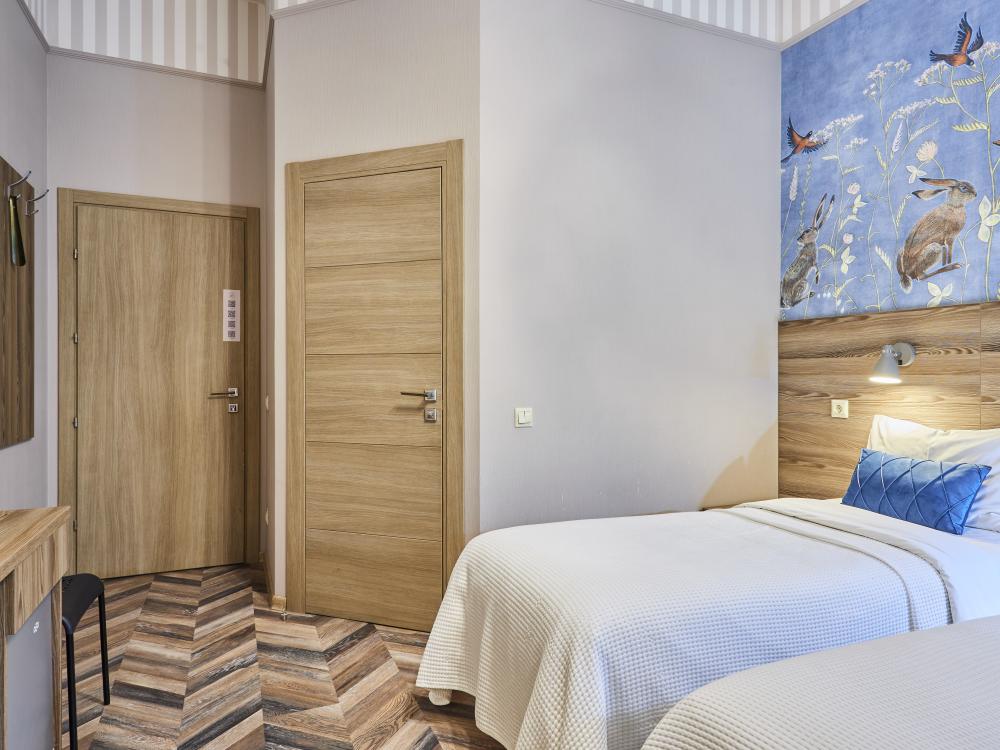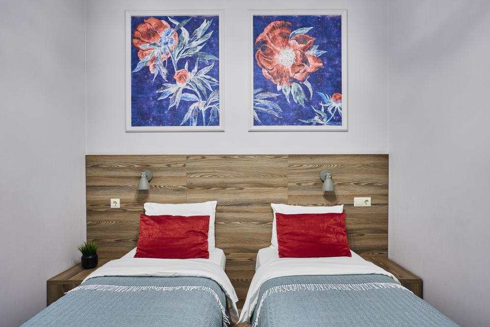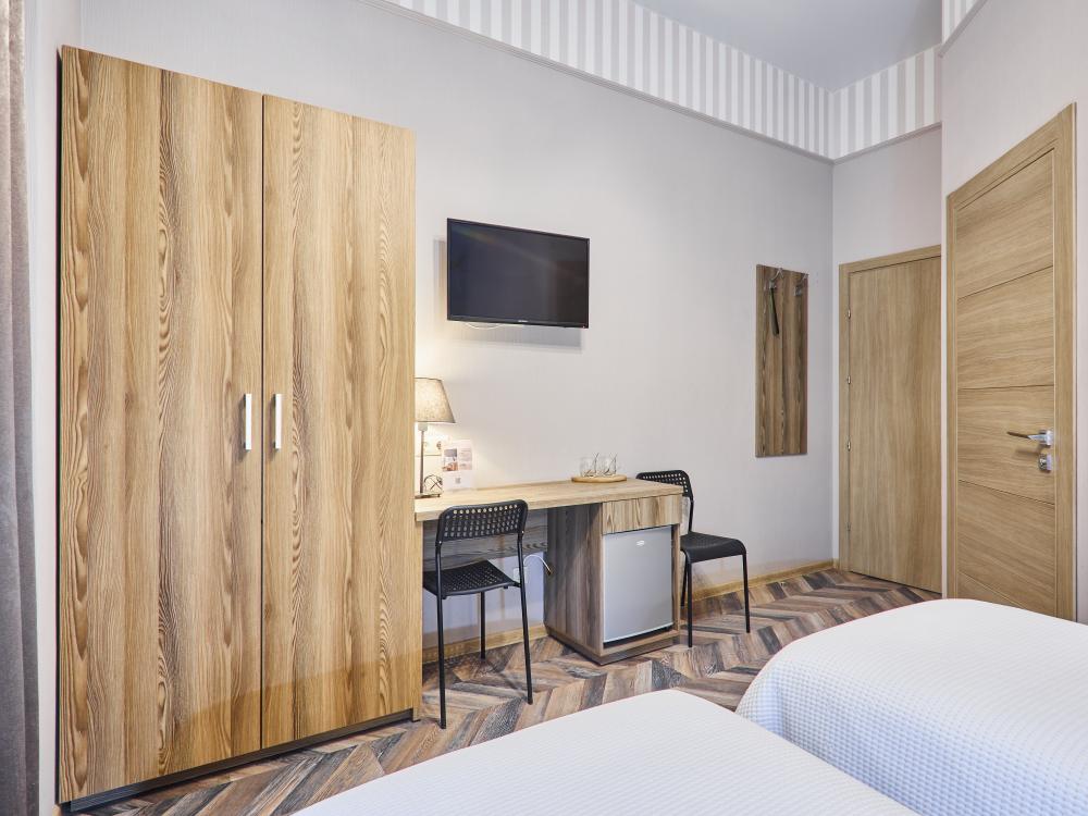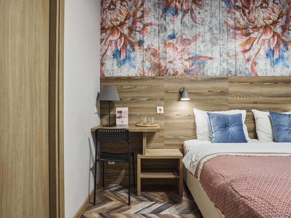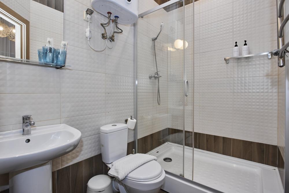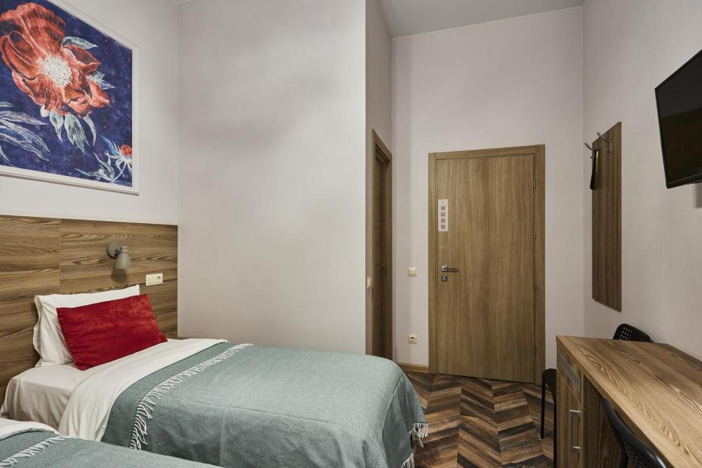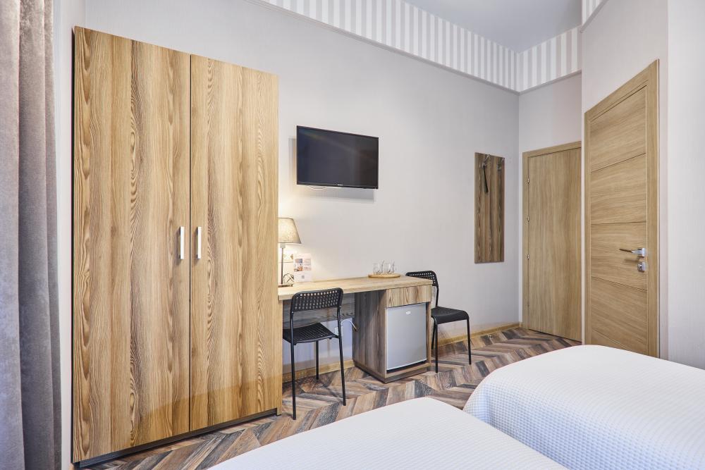 Стандартный двухместный с 1 кроватью или 2 отдельными кроватями по запросу Площадь 16 кв.м. Наполняемость : Кровать размер 180*190, либо 2 по 80*190 Прикроватные тумбочки 2шт, Рабочий стол, Шкаф/гардероб, Телевизор с плоским экраном Отдельный санузел с душевой кабиной, Комплект полотенец, фен, белье и тапочки предоставляются бесплатно Шампунь, Гель для душа, Мыло, Шапочка для душа предоставляются бесплатно Гладильные принадлежности (гладильная доска и утюг) предоставляются бесплатно по запросу