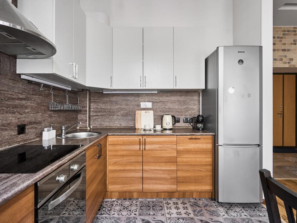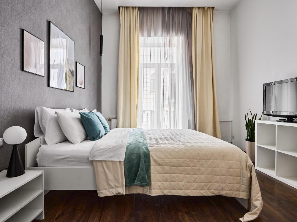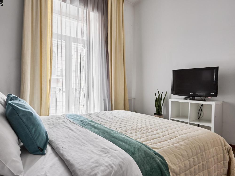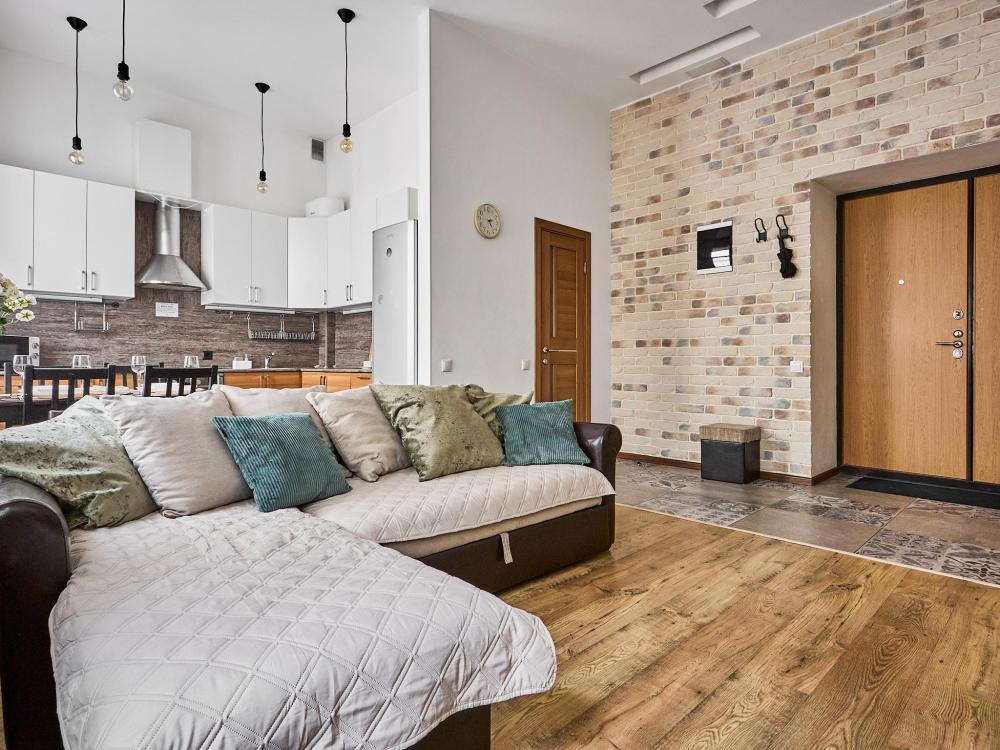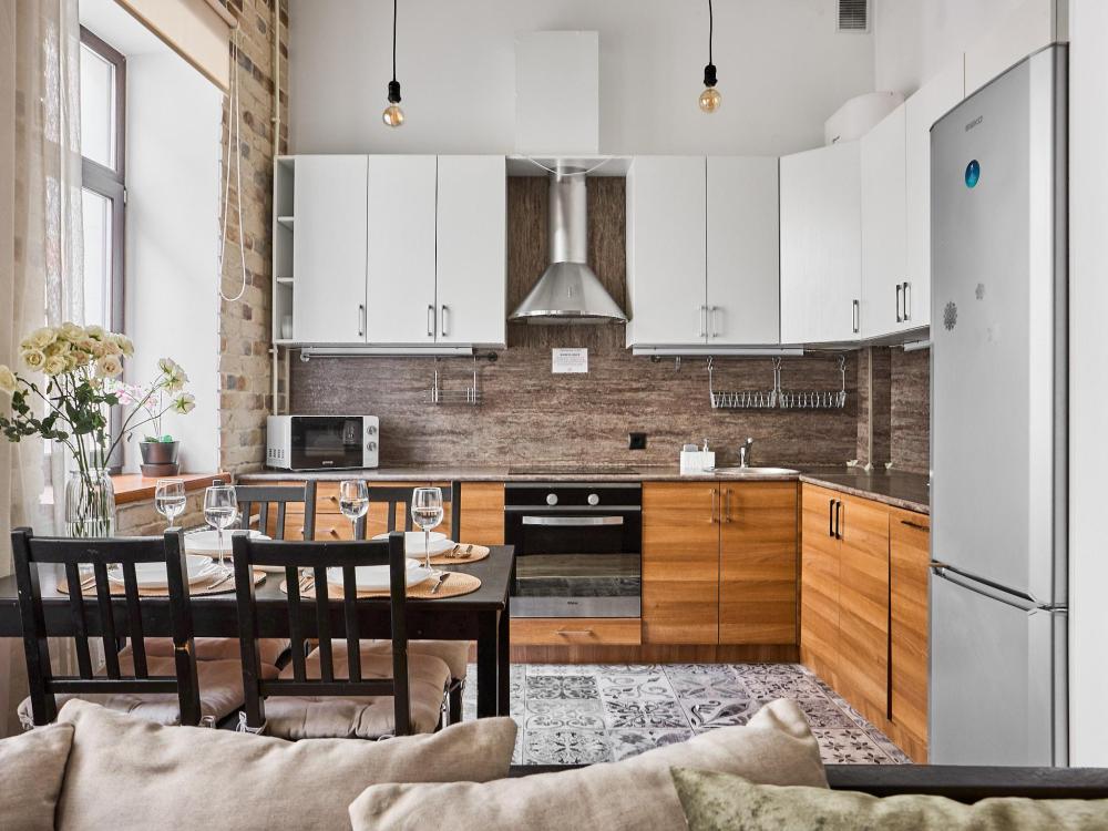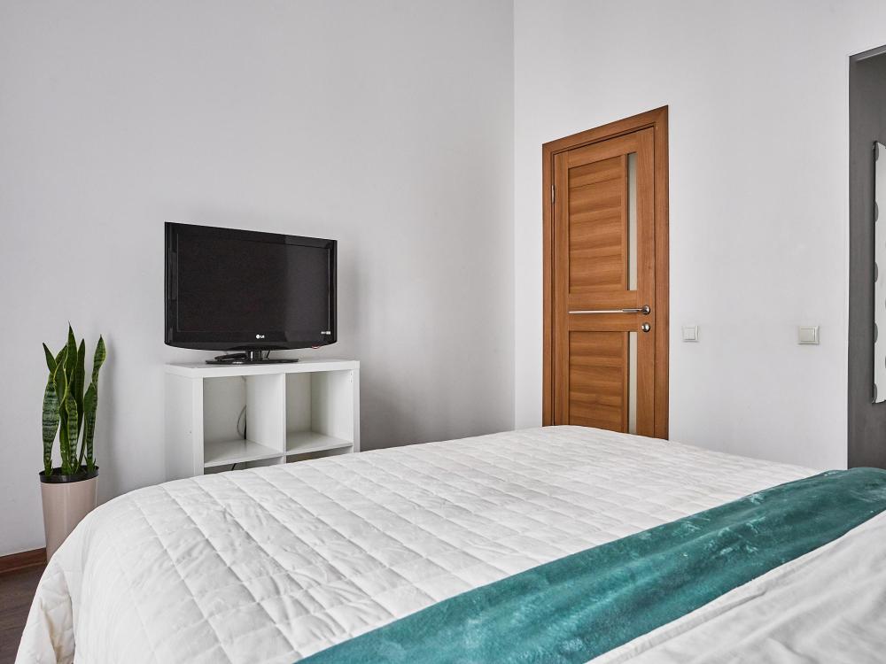 В квартире установлена двуспальная кровать в спальне и комфортный двуспальный диван в гостиной. Имеется вся необходимая техника: 2 телевизора, стиральная машина, плита, холодильник, посудомоечная машина, кофеварка, микроволновая печь, электрочайник, фен, утюг. На кухне: посуда и кухонные принадлежности для приготовления и приема пищи. Работает бесплатный WI-Fi.