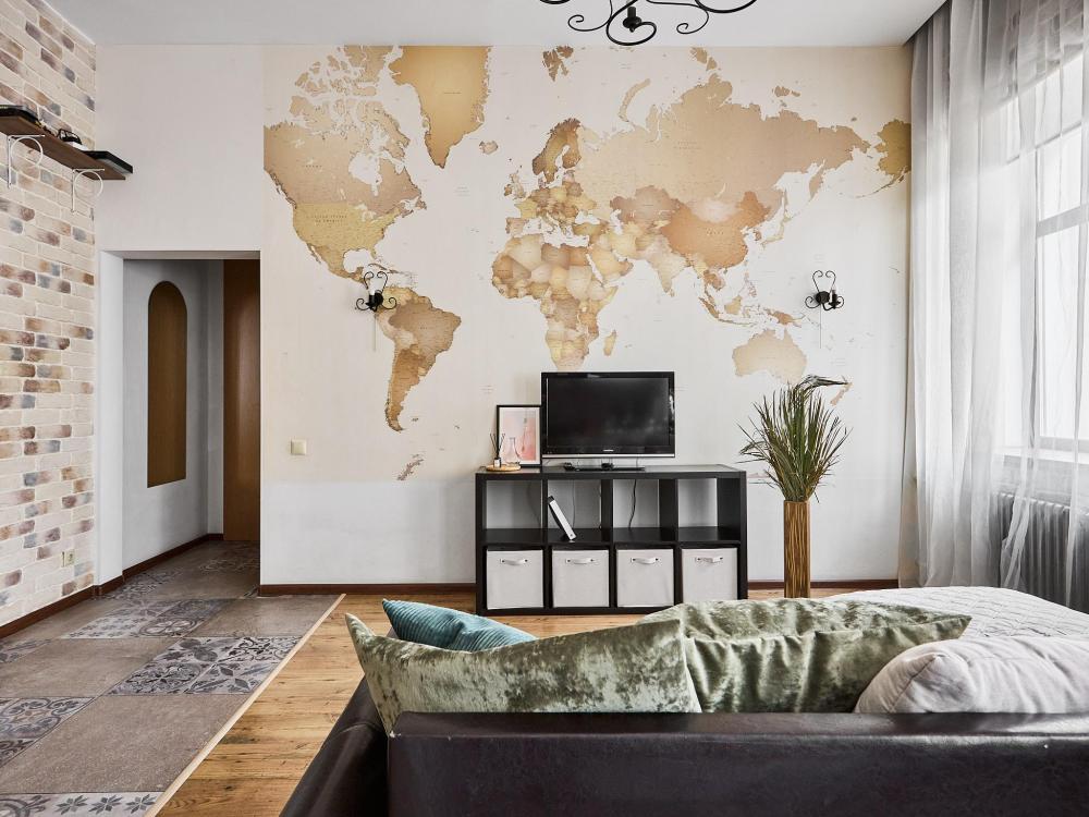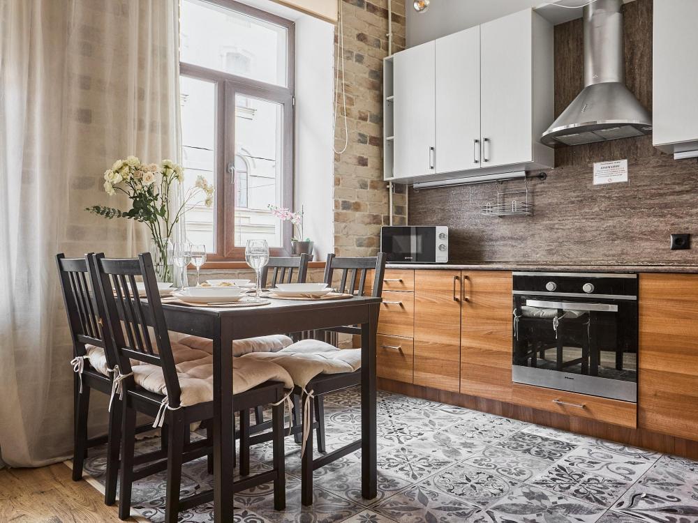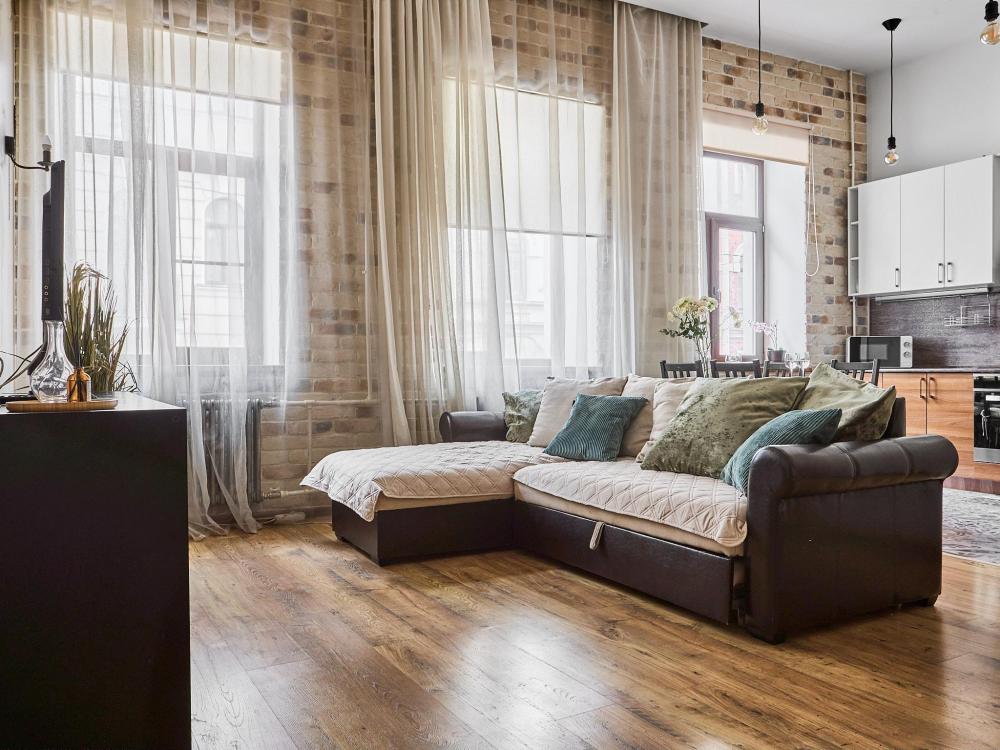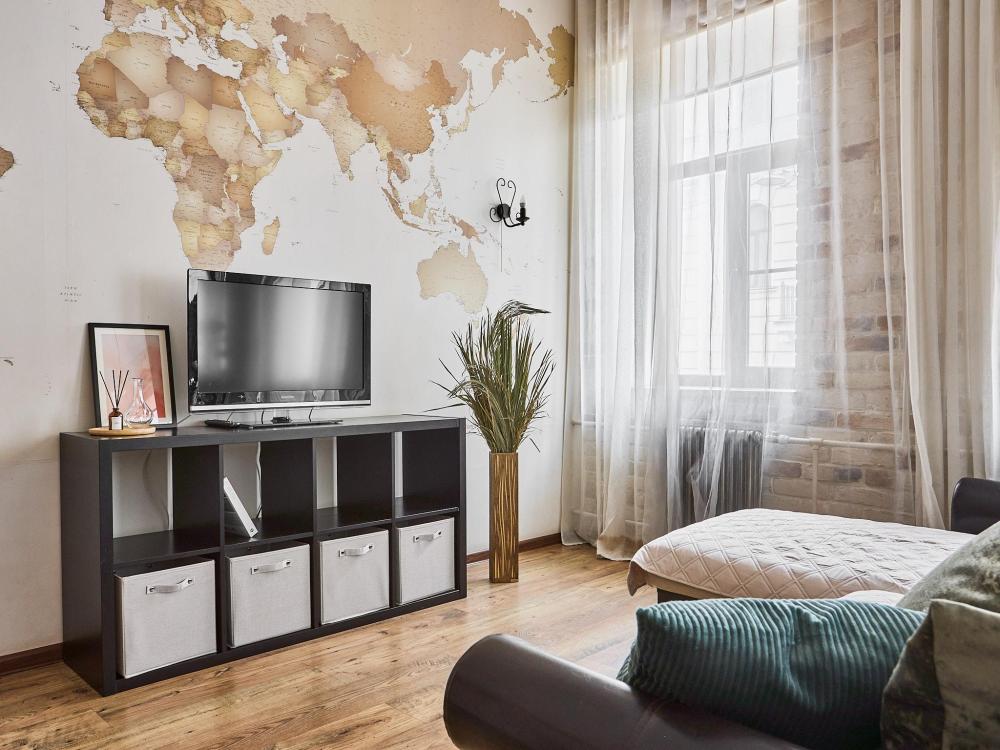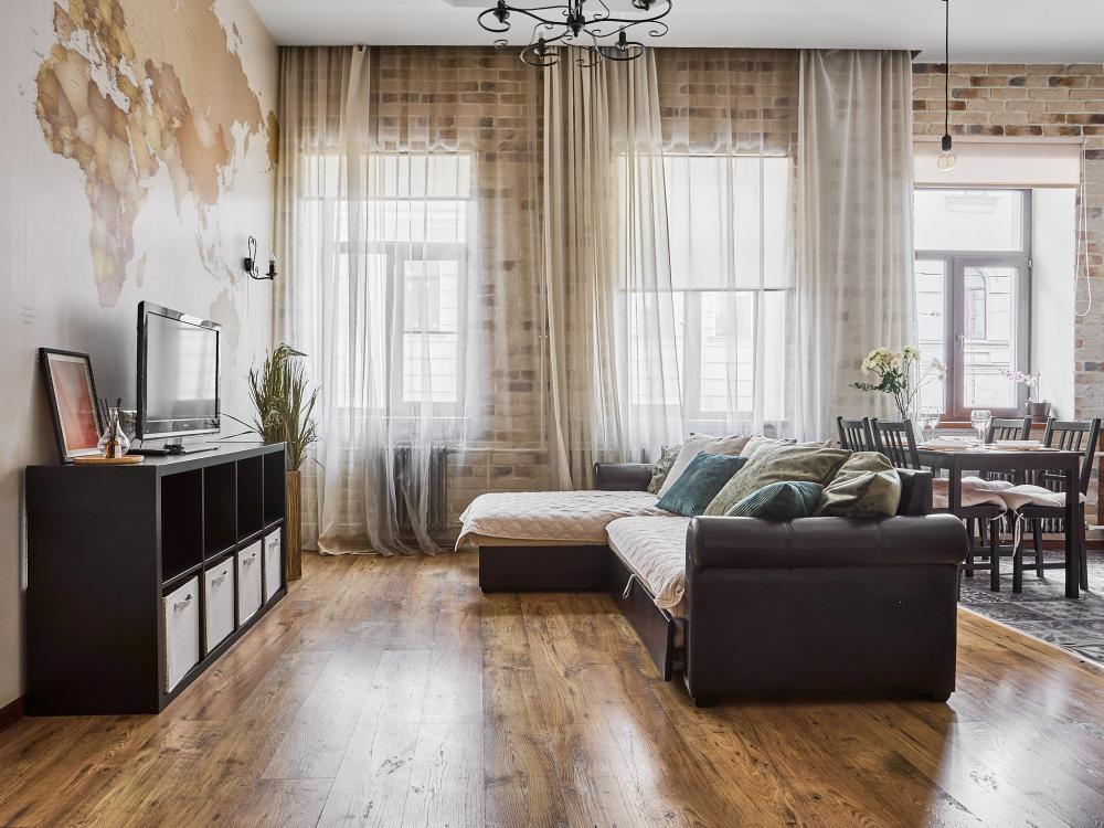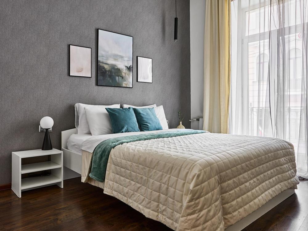 В квартире установлена двуспальная кровать в спальне и комфортный двуспальный диван в гостиной. Имеется вся необходимая техника: 2 телевизора, стиральная машина, плита, холодильник, посудомоечная машина, кофеварка, микроволновая печь, электрочайник, фен, утюг. На кухне: посуда и кухонные принадлежности для приготовления и приема пищи. Работает бесплатный WI-Fi.