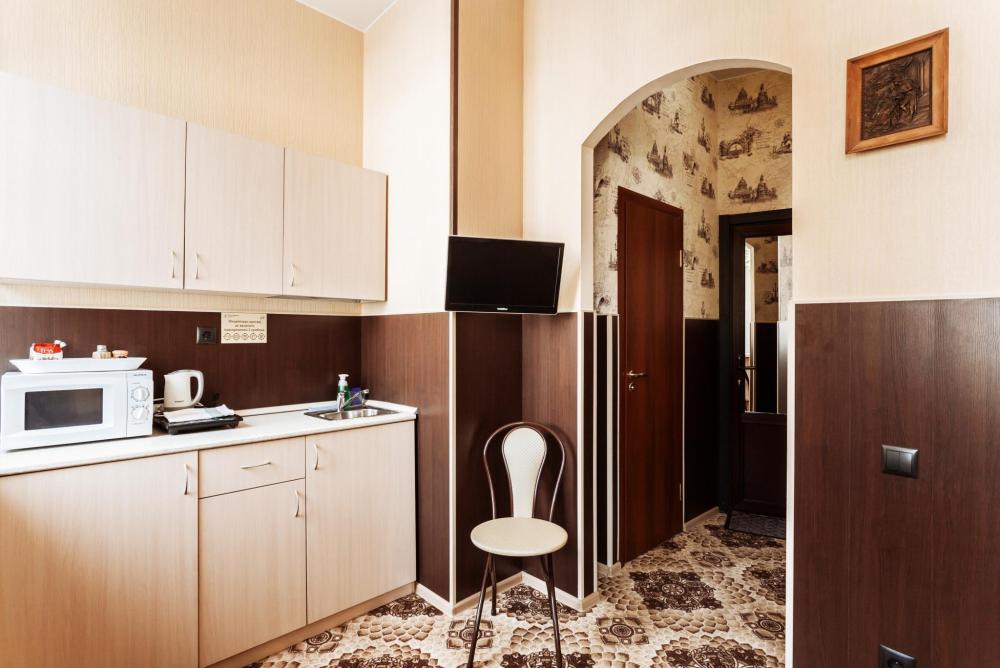 Апартаменты-студио с мини-кухней, площадь комнаты – 16 кв.м Меблировка: 2 односпальные кровати (90х190см) и 2 кресло-кровати (90х190см) или 1 двуспальная кровать (140х190см) и 2 кресло кровати (90х190см); •БРА; •Видео/аудио: •Телевизор; DVD-плеер, радио, наушники •Интернет/телефония: •Wi-Fi; городской телефон •Электроника: •Микроволновая печь; холодильник, эл. чайник; мини-кухня с посудой для приготовления пищи; •Ванная комната: •туалет/душ; полотенцесушитель, теплый пол; фен; косметическое зеркало •Внешняя территория и вид из окон: •Вид на двор •Мебель: •Зеркало; шкаф для одежды; мягкая мебель, стулья, ковровое покрытие •Прочее: •Гель для душа; шампунь; мыло •Комплекты полотенец •Посуда •Сейф •Москитная сетка •Фумигатор •Ионизатор воздуха
