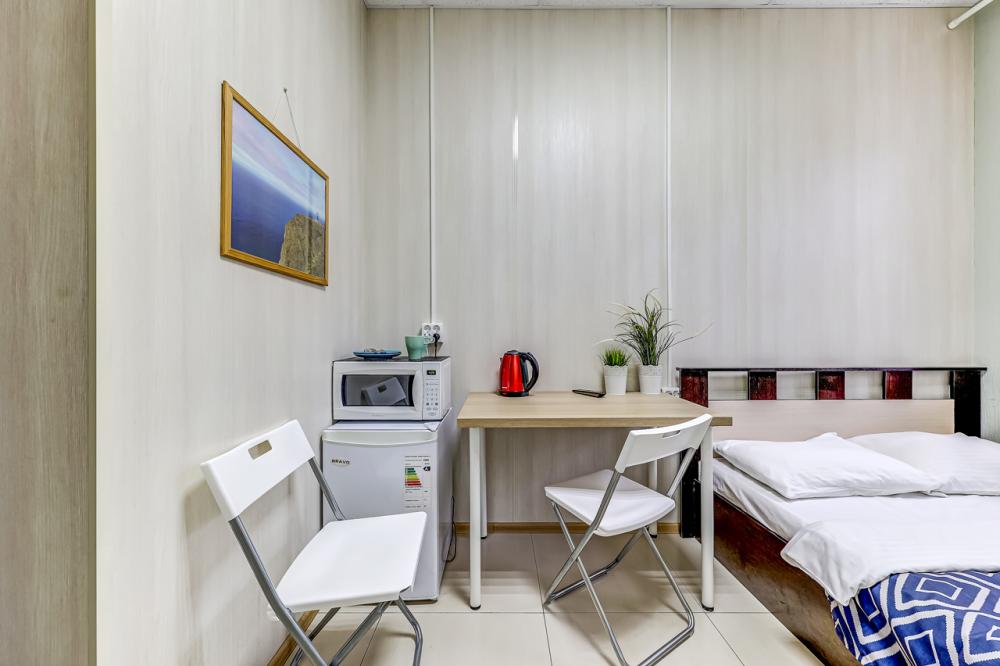 Двухместная комната с двуспальной кроватью. Комната оснащена телевизором, холодильником, местом для хранения одежды, микроволновой печью, электрическим чайником, душевой кабиной, предоставляются туалетно-косметические принадлежности.