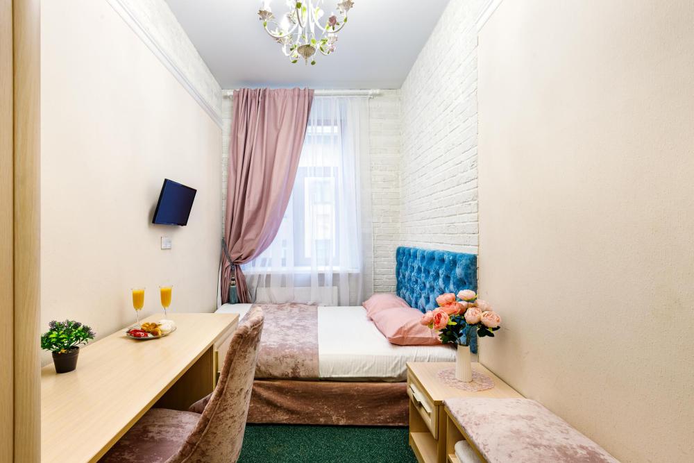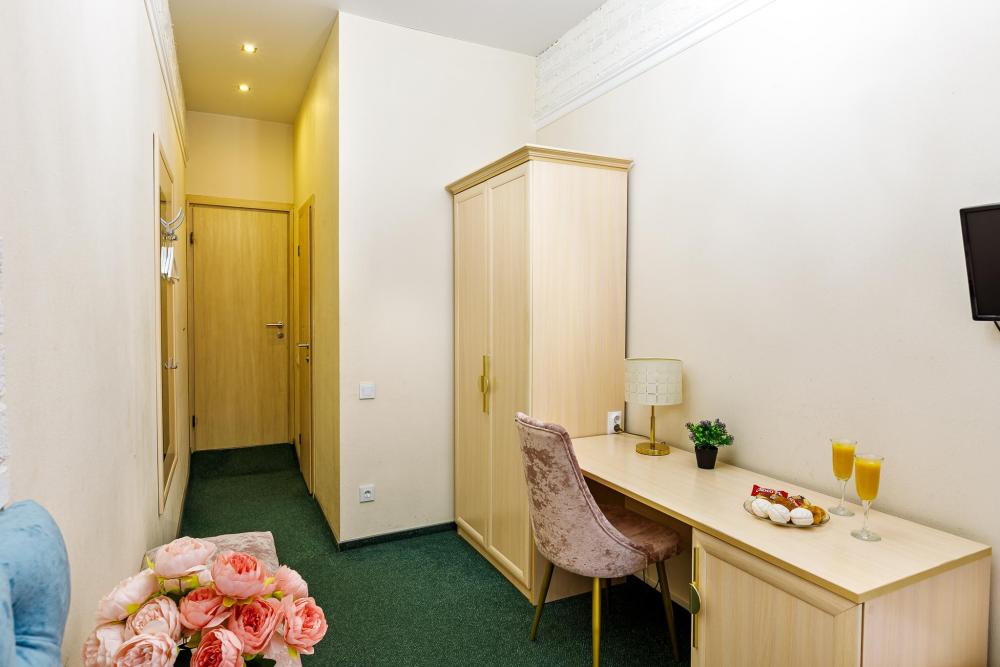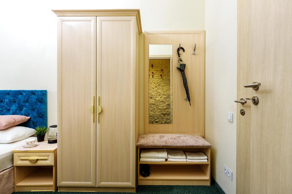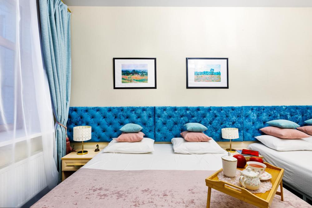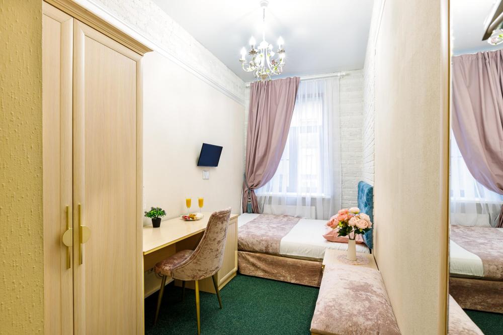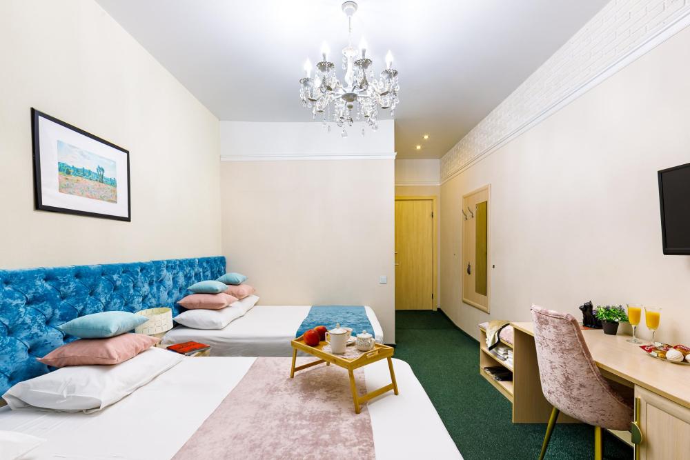 Трехместный номер, площадь номера - 15м2. В номере: 1 двуспальная кровать и 1 односпальная кровать; собственная ванная комната с душем, раковиной, туалетом; телевизор; одноразовые тапочки; окно в тихий двор .