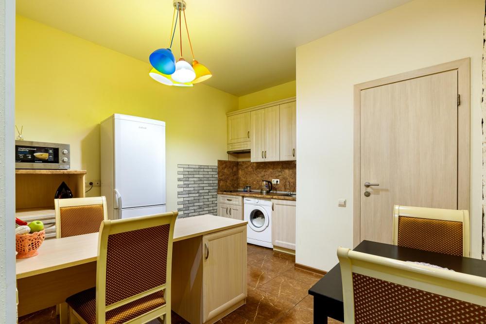 Апартаменты могут быть сняты целиком в количестве 5-ти спален и кухни, общая площадь апартаментов - 120м2, вместимость - 17 человек. В каждой спальне есть собственная душевая, умывальник, унитаз, фен, тапочки, умывальные принадлежности. Спальня 1: 1 односпальная кровать и 1 двуспальная кровать (15м2) Спальня 2: 2 двуспальные кровати (18м2) Спальня 3: 1 односпальная кровать и 1 двуспальная кровать (15м2) Спальня 4: 2 двуспальные кровати (18м2) Спальня 5: 1 односпальная кровать и 1 двуспальная кровать (15м2) Кухня: Холодильник, посудомоечная машина, 4-х конфорочная газовая плита с духовкой, вытяжка, посуда, утюг, гладильная доска.