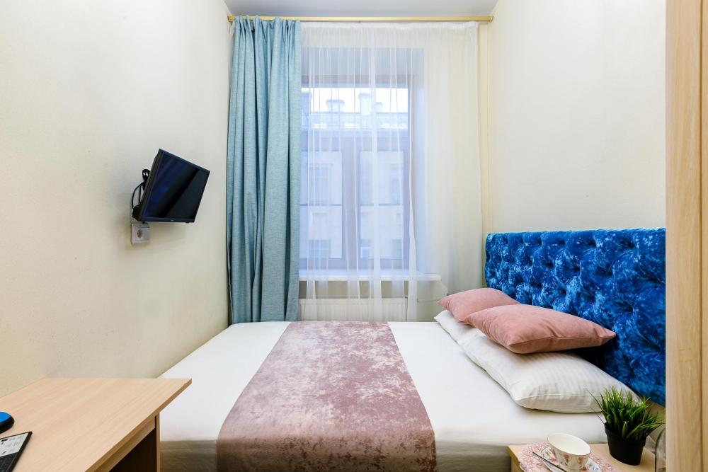 Четырехместная комната, площадь - 18м2. В комнате: 2 двуспальные кровати, собственная ванная комната с душем, раковиной, туалетом; телевизор; одноразовые тапочки; окно в тихий двор.