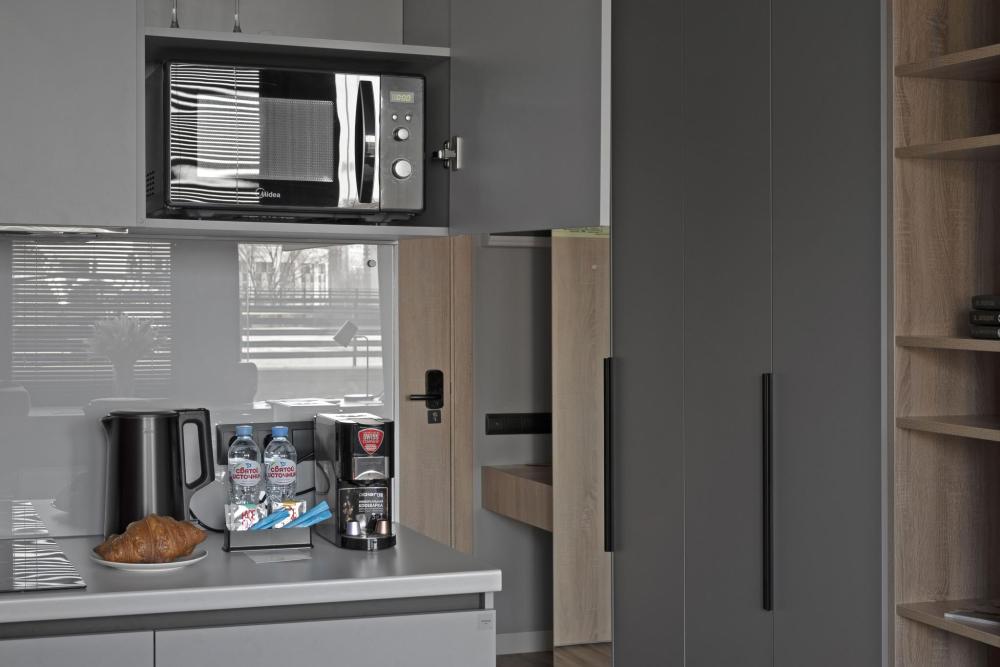 Номер Комфорт с большой кроватью и небольшим диваном, кухней с варочной поверхностью, СВЧ-печью, электрическим чайником и кофе-машиной, мини-холодильником, а также стиральной машиной в ванной комнате.