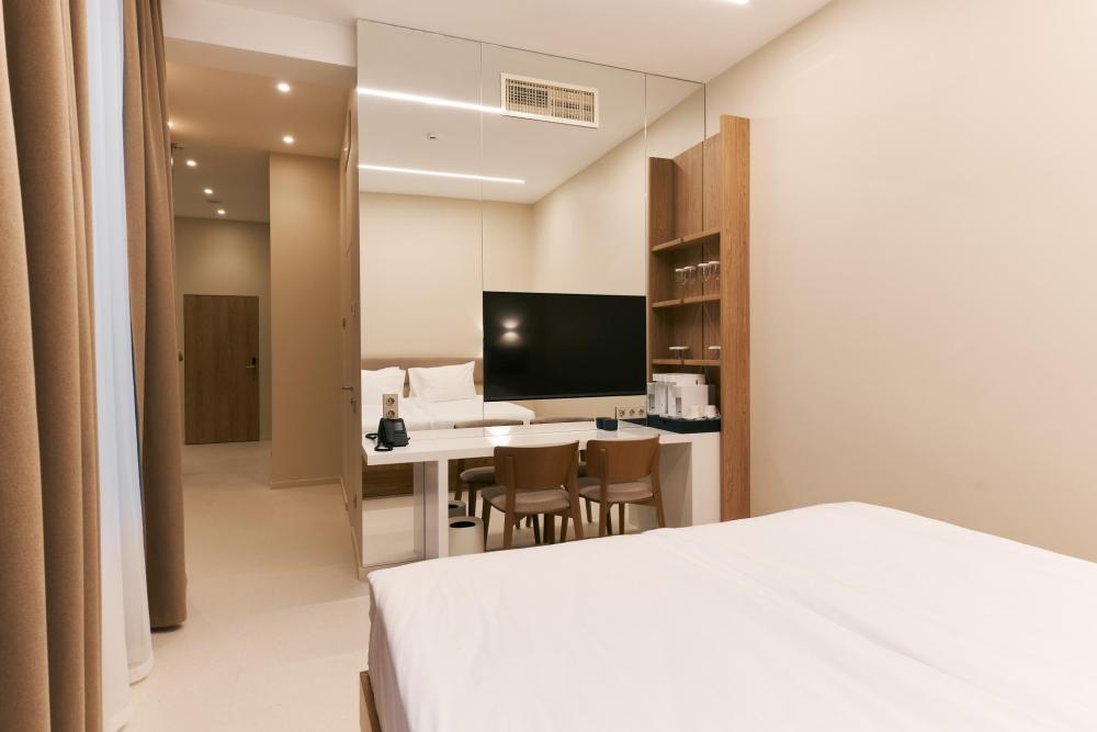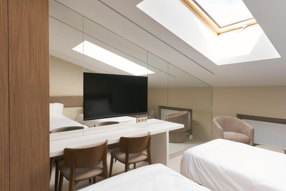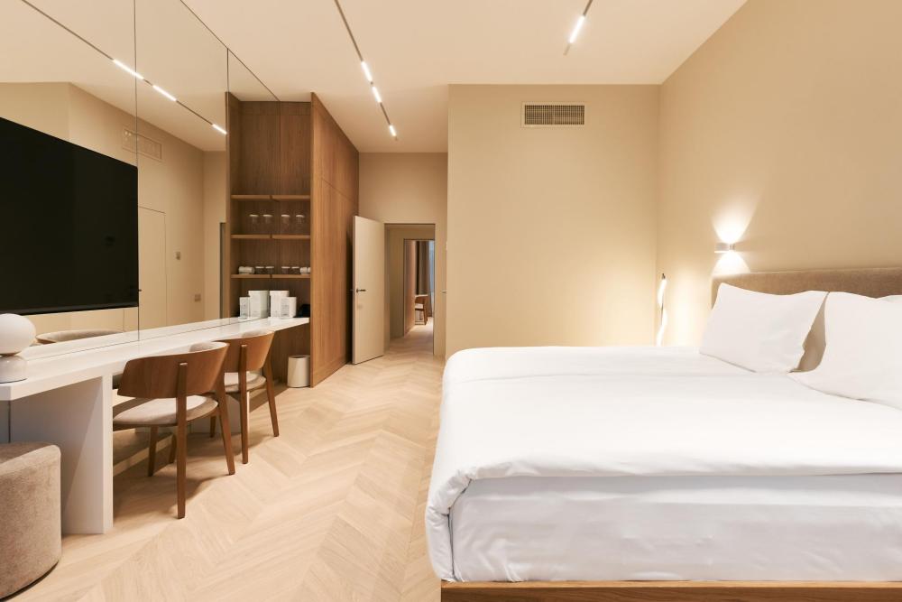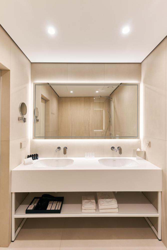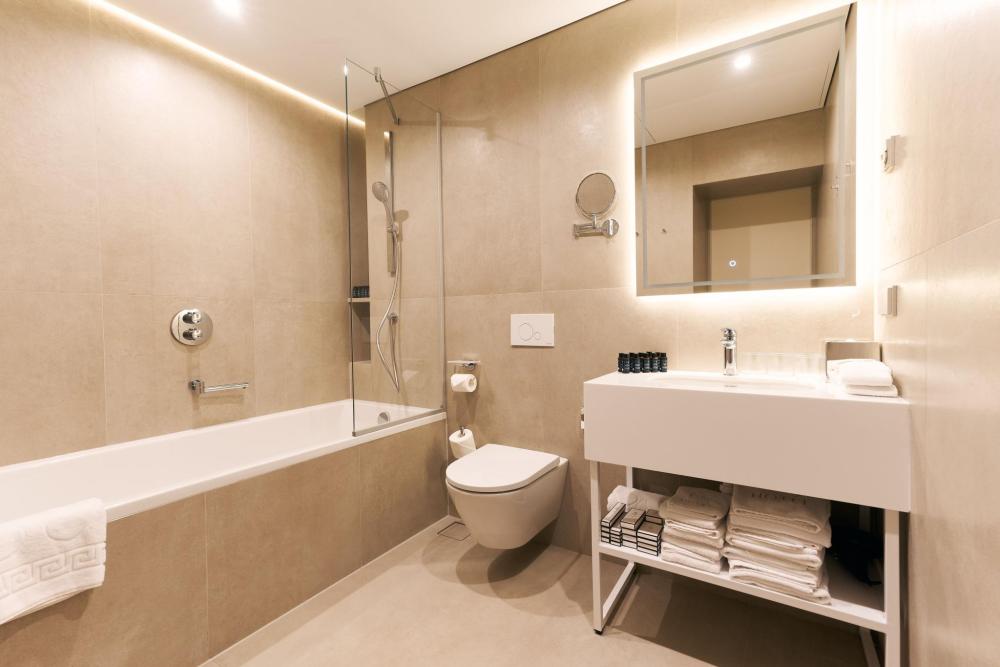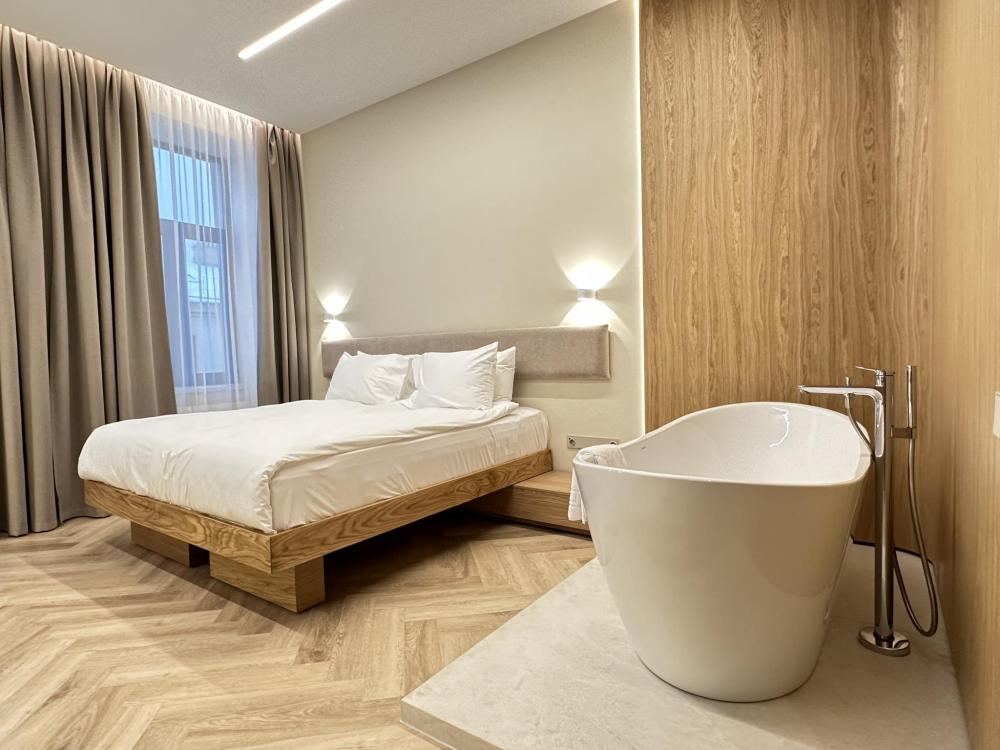 "Эстетика минимализма, натуральные материалы и светлая палитра создают идеальные условия для расслабления. Просторный номер площадью 30 м² с ванной, расположенной прямо в спальне, предлагает уникальное ощущение приватности и роскоши. В номере: двуспальная кровать с мягким текстилем, свободностоящая ванна в спальне — акцент на удовольствие и ощущение spa-домашности, рабочая и обеденная зона, современное освещение, ТВ, библиотека, отдельная душевая комната и туалет
