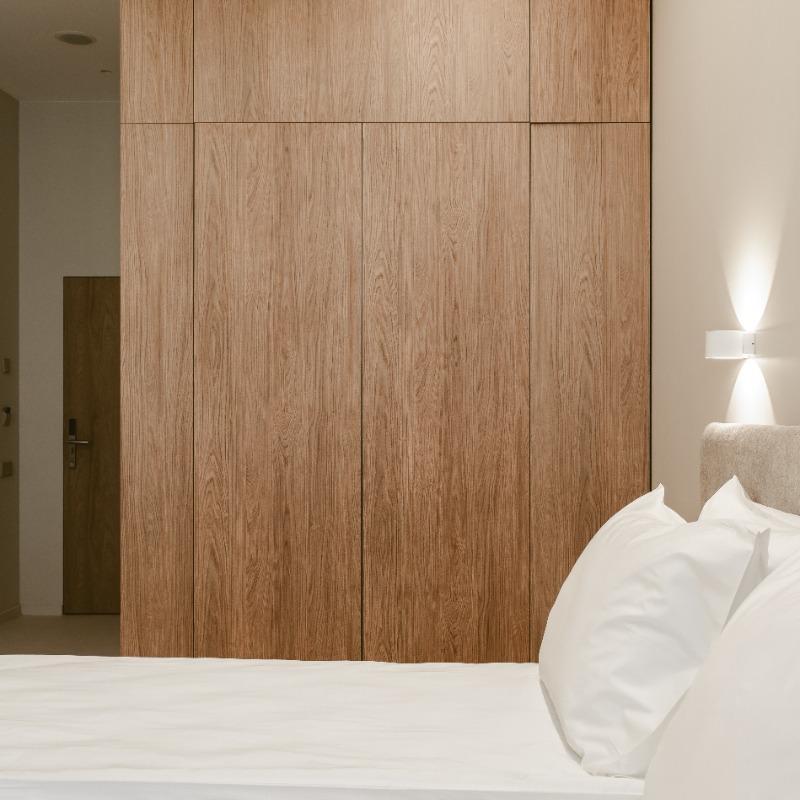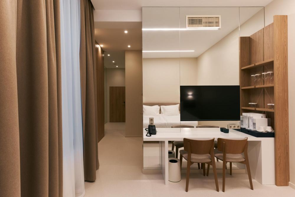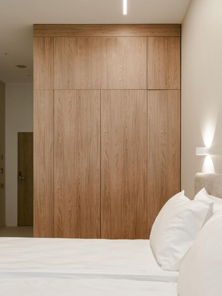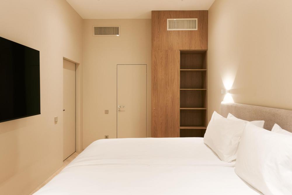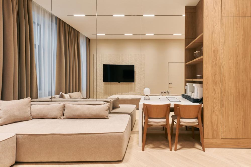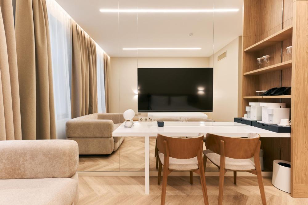 Просторные номера площадью от 40 м² подойдут для длительного проживания, семейных поездок или тех, кто просто любит больше личного пространства. В интерьере — тёплые природные оттенки, дизайнерская мебель, лаконичные формы. В номере: изолированная спальня с двуспальной кроватью, полноценная кухня со всем необходимым для приготовления еды, гостевая зона с диваном и ТВ, 2 санузла — основной (в спальне) и гостевой, рабочая зона, библиотека, мягкий свет и естественные материалы