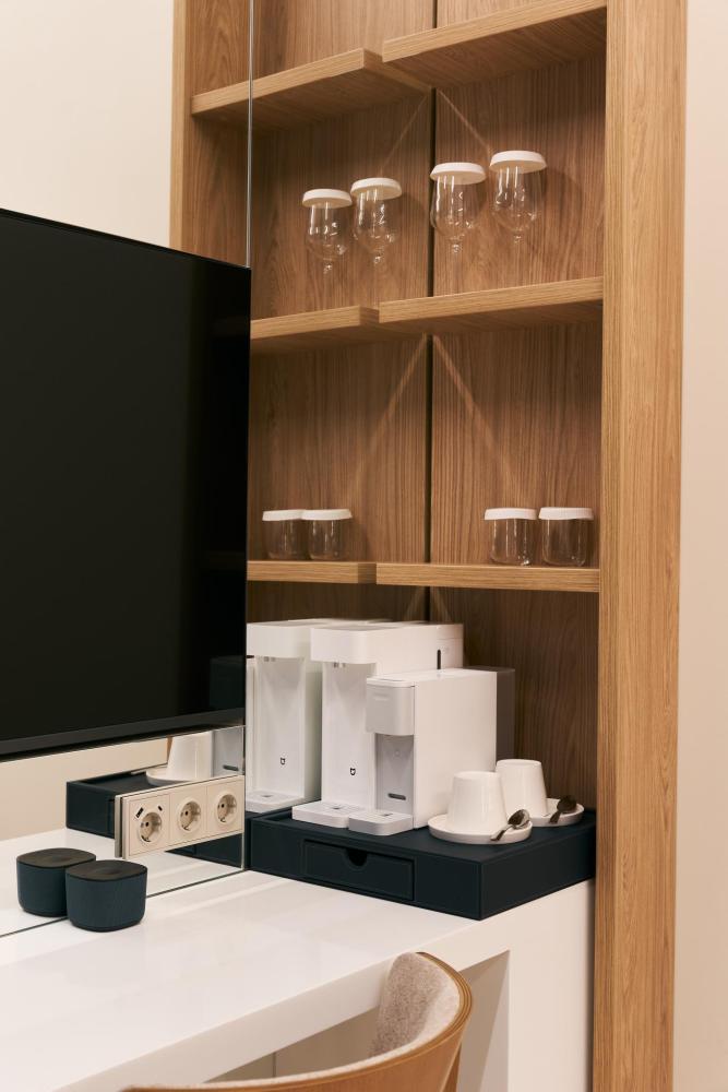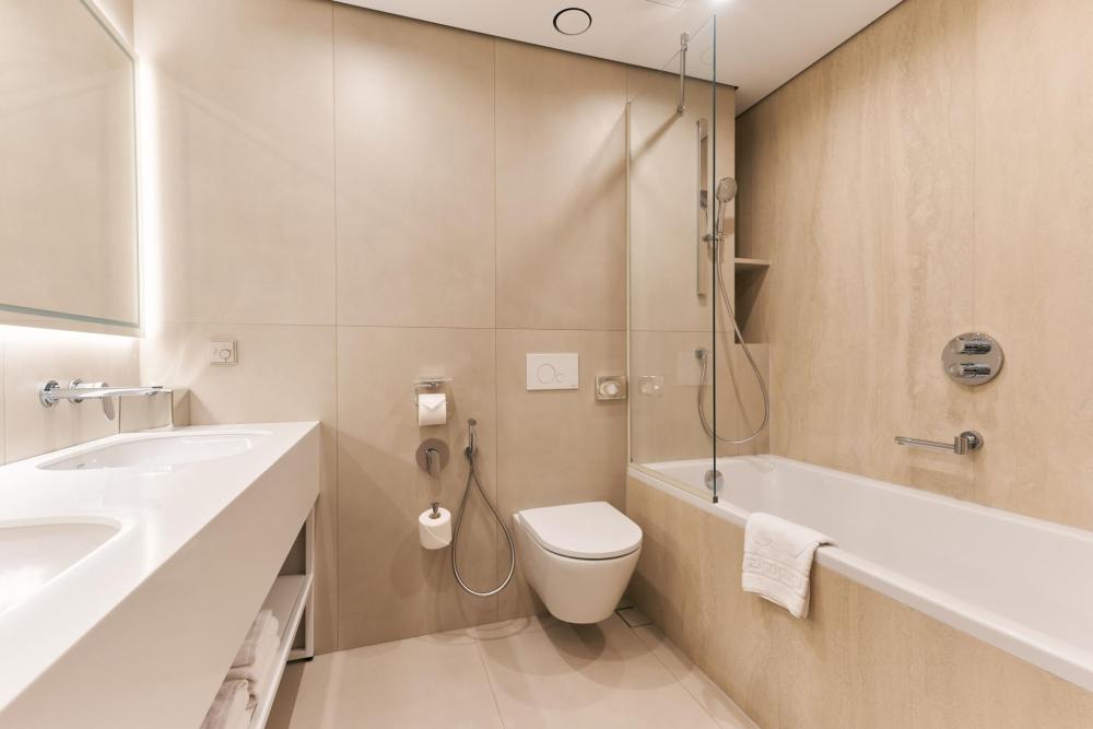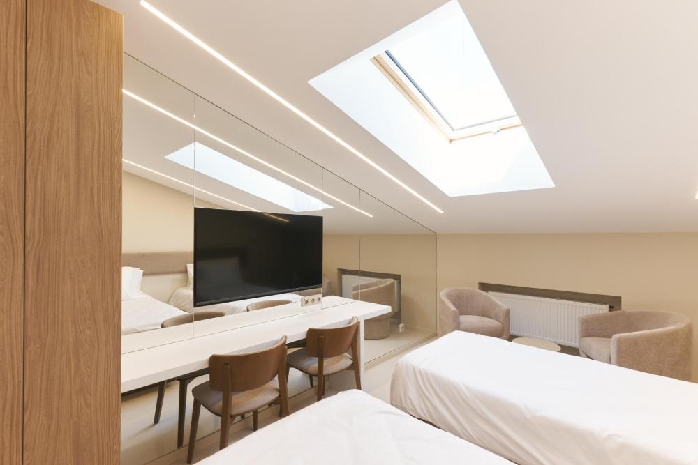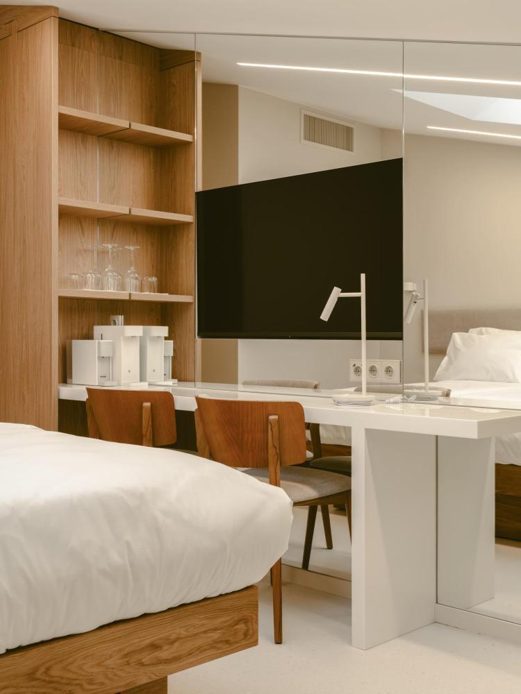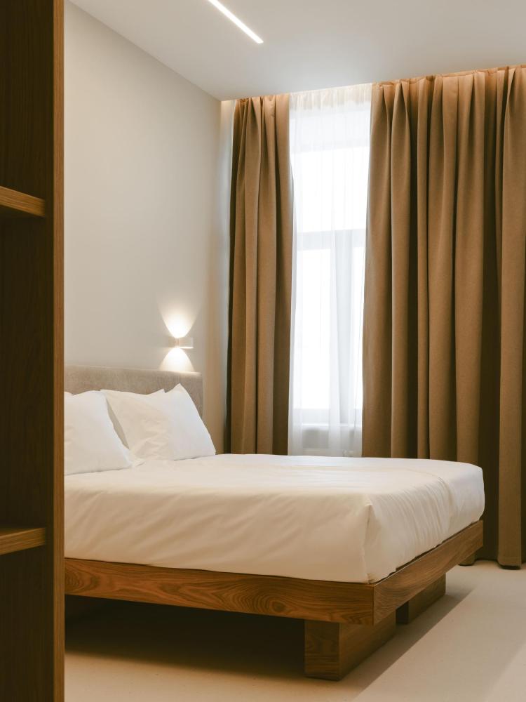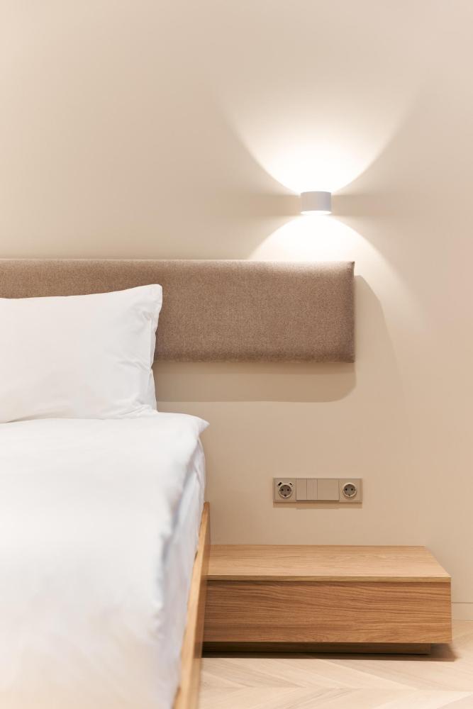 Просторные номера площадью от 40 м² подойдут для длительного проживания, семейных поездок или тех, кто просто любит больше личного пространства. В интерьере — тёплые природные оттенки, дизайнерская мебель, лаконичные формы. В номере: изолированная спальня с двуспальной кроватью, полноценная кухня со всем необходимым для приготовления еды, гостевая зона с диваном и ТВ, 2 санузла — основной (в спальне) и гостевой, рабочая зона, библиотека, мягкий свет и естественные материалы