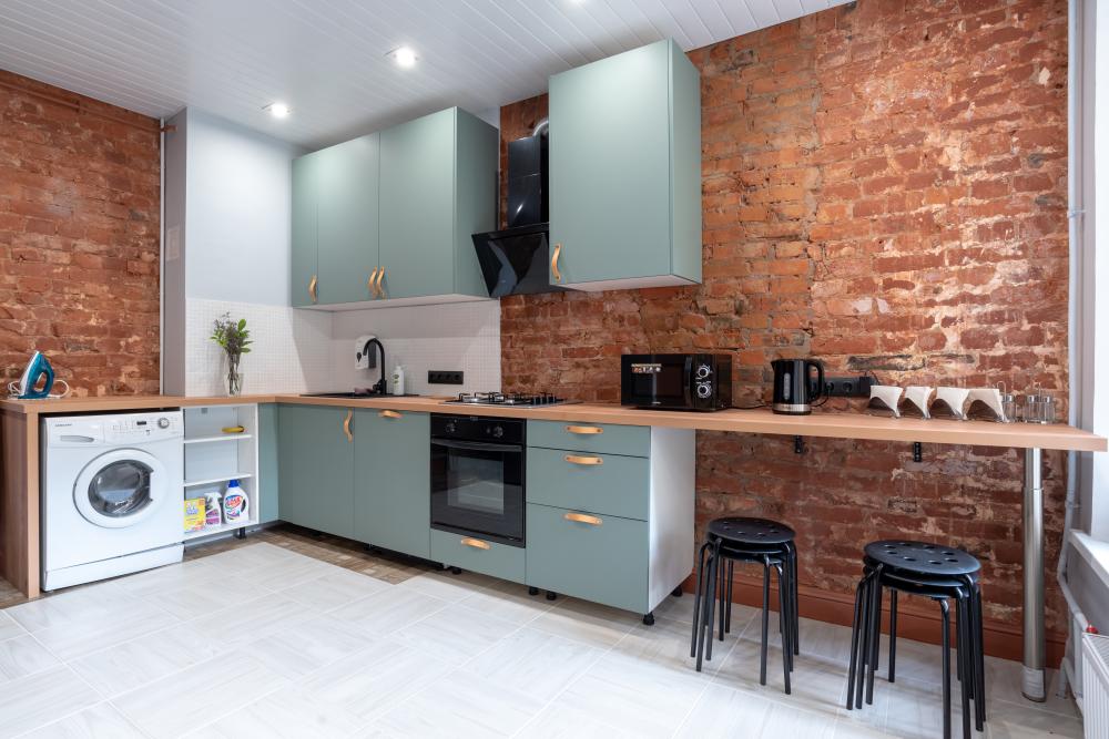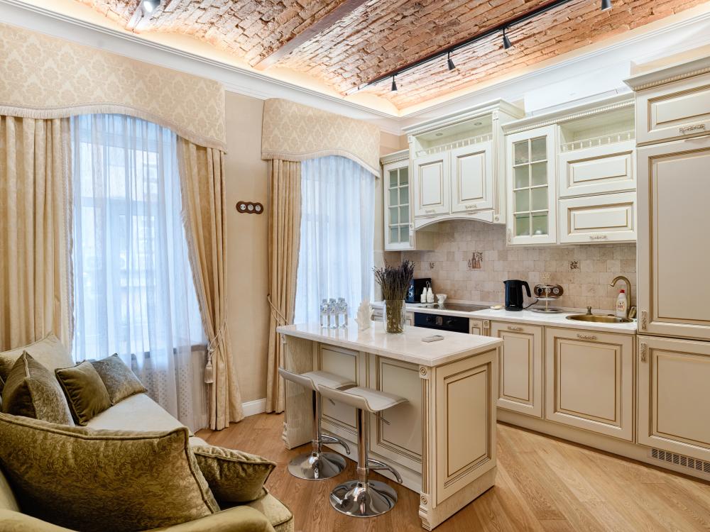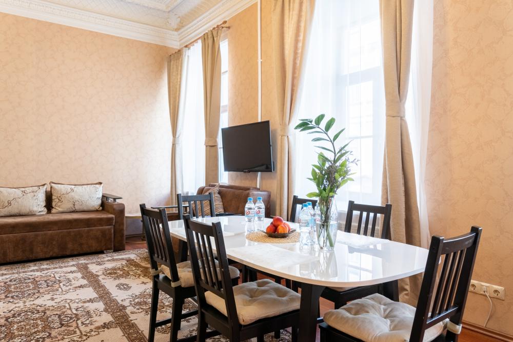 Квартира в современном лофт-дизайне, с 4 отдельными спальнями, большой функциональной кухней и 2 большими санузлами с душем. Максимальная вместимость - 8 человек. Апартаменты находятся на четвертом этаже без лифта. Из окон открывается вид на историческую застройку. В доме находится известный музей-квартира Бенуа.