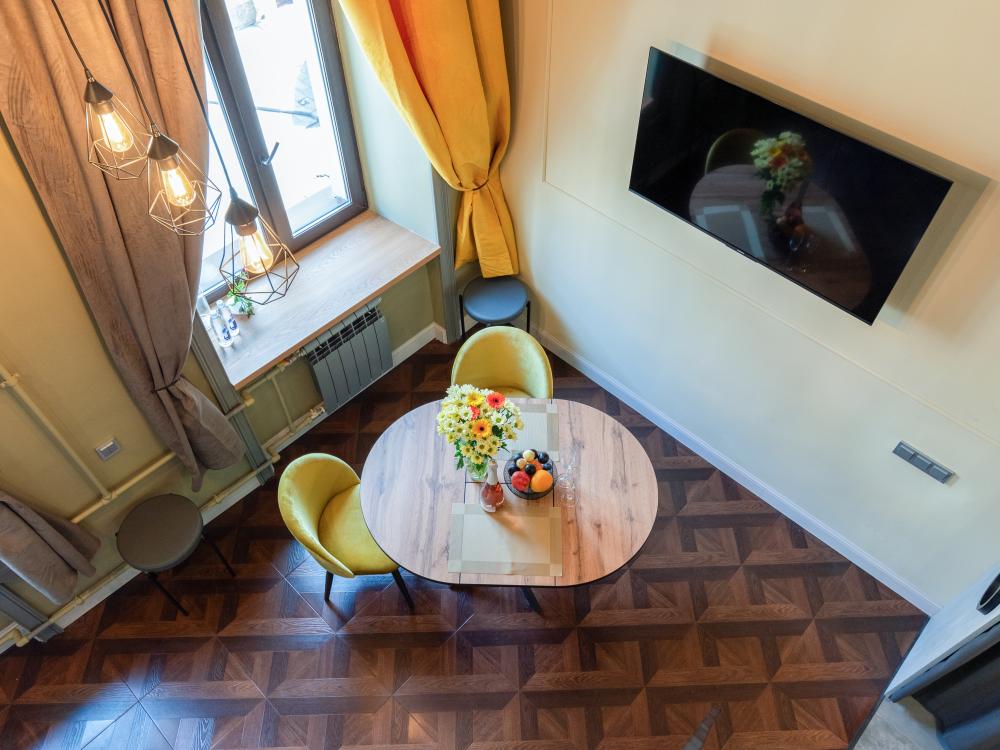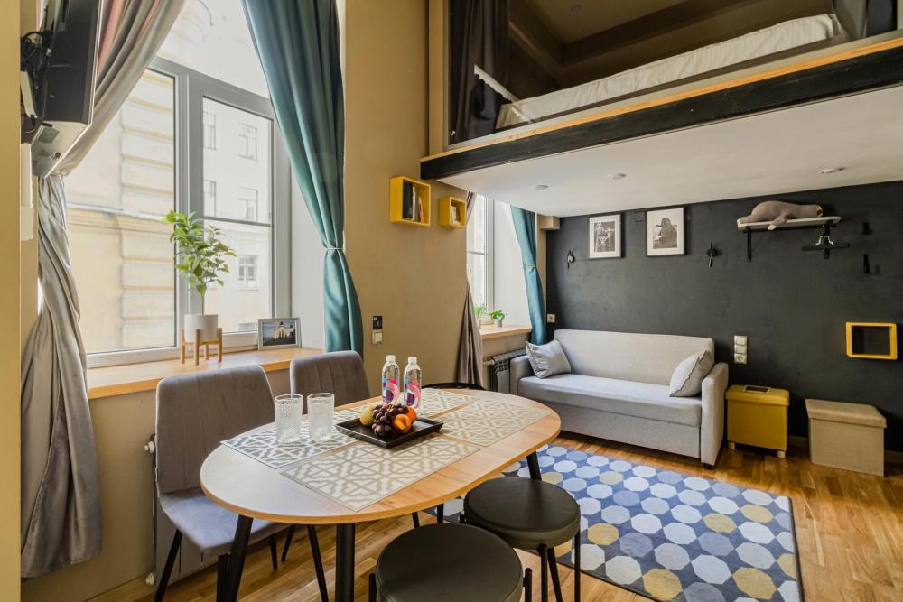 Студия выполнена в современном дизайне, с новым ремонтом, отдельной спальней на втором ярусе с 1 большой кроватью с ортопедическим матрасом и подушками, а также 2-мя дополнительными спальными местами на диване в гостиной. В ванной и коридоре тёплые полы, а в комнате натуральная паркетная доска. Имеется приточно-вытяжная вентиляция и кондиционер, что является важнейшим дополнением при размещении в центре, особенно летом. В интерьере преобладают натуральные оттенки и фактуры, поэтому здесь очень приятно находиться. Из окон открывается вид во двор. Отлично подходят для пары или семьи с детьми школьного возраста. Обратите внимание, в апартаментах имеется лестница.