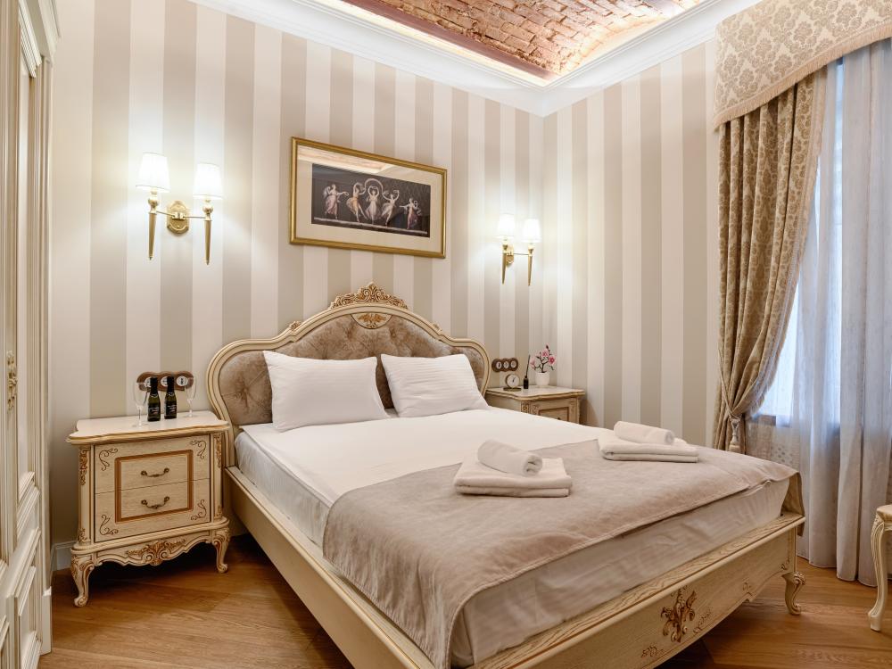 Площадь номера - 11-12 м², высота потолка - 3 м. Двухместный номер с 1 большой кроватью или 2 отдельными кроватями с ортопедическими матрасами. В номере центральная система вентиляции воздуха. Вид на крыши города. Оснащение номера: - зона прихожей с полками и вешалками для одежды; - зеркало; - прикроватные полочки; - индивидуальные лампы для чтения; - складной стол; - журнальный столик; - настольная лампа; - мягкий стул; - табурет; - капсульная кофемашина; - телевизор с плоским экраном и USB-разъемом; - телефон для связи с ресепшн; - спутниковое телевидение; - Wi-Fi; - корзина для мусора; - комплект полотенец; - гипоаллергенное постельное белье; - светонепроницаемые шторы; - тапочки; - халат; - беруши; - щетка для одежды; - рожок; - губка и салфетка для обуви; - швейный набор; - вода в бутылках по количеству проживающих при заезде. В ванной комнате: - душ без поддона; - раковина, туалет; - средства личной гигиены (шампунь-гель для душа, жидкое мыло для рук, кондиционер для волос, лосьон для тела, шапочка для душа, зубной/бритвенный набор, гигиенический набор, туалетная бумага); - зеркало; - фен; - электрический полотенцесушитель; - корзина для мусора; - стакан; - полотенце для ног.