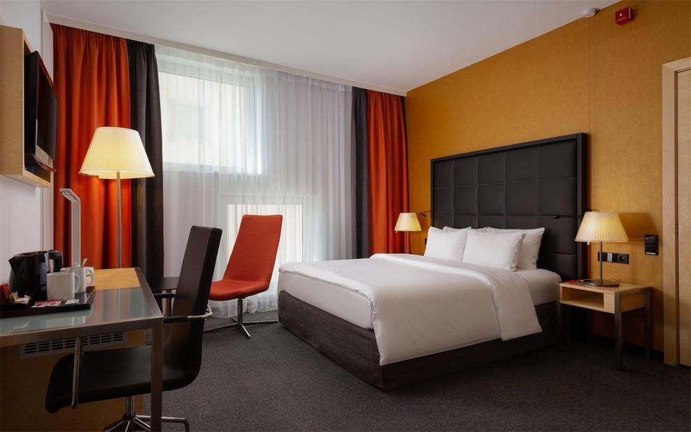 Стандартный номер с 1 двуспальной кроватью площадью 28 кв.м. предлагает все необходимое для плодотворной работы и отдыха – индивидуальная система кондиционирования, удобный рабочий стол, Wi-Fi, сейф, телевизор, чайный набор, гладильная доска и утюг, бутилированная вода. Все номера оснащены ванной и душевой кабиной. Банные принадлежности и теплый пол в ванной комнате станет приятным дополнением.