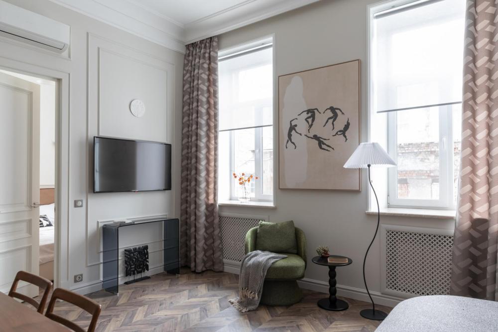 Комфортабельные апартаменты люкс класса с кухней на набережной реки Фонтанки. Вид и выход из парадной прямо на набережную реки Фонтанки. В наличии необходимая бытовая техника: стиральная и посудомоечная машина, варочная поверхность, микроволновка, фен, утюг, чайник и кофе-машина. В апартаметах есть ЖК-телевизор с функцией Smart TV и быстрый безлимитный Wi-Fi интернет. Апартаменты также оборудованы кондиционером и теплым полом в ванной комнате.