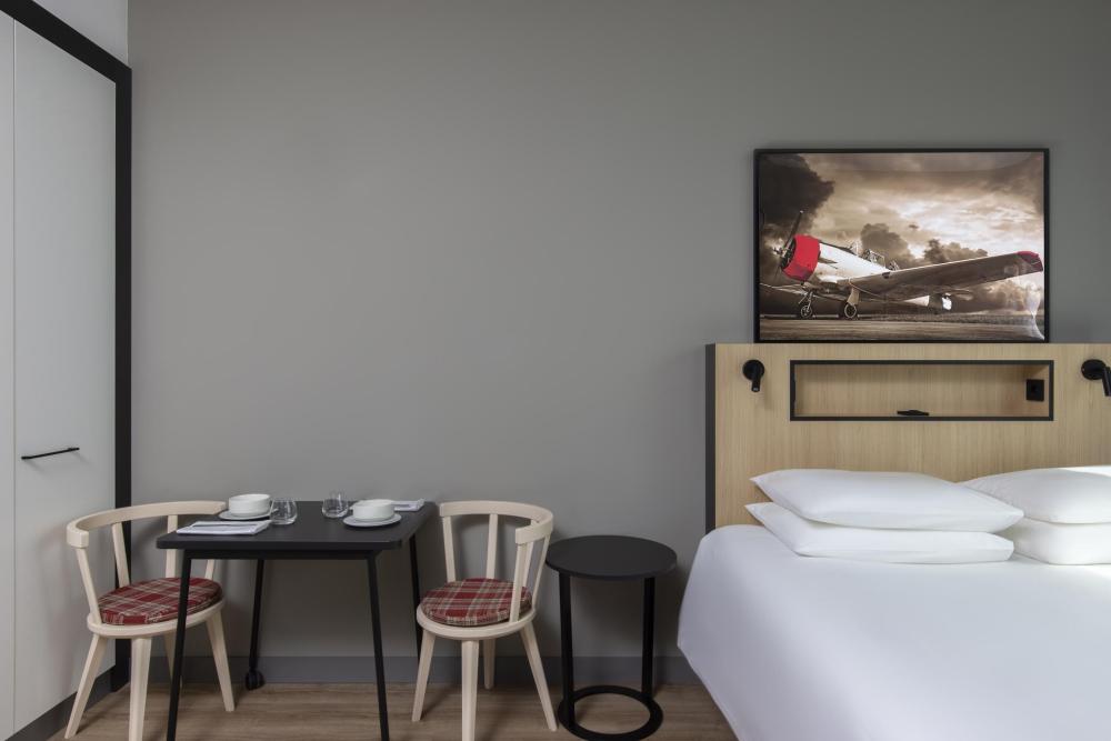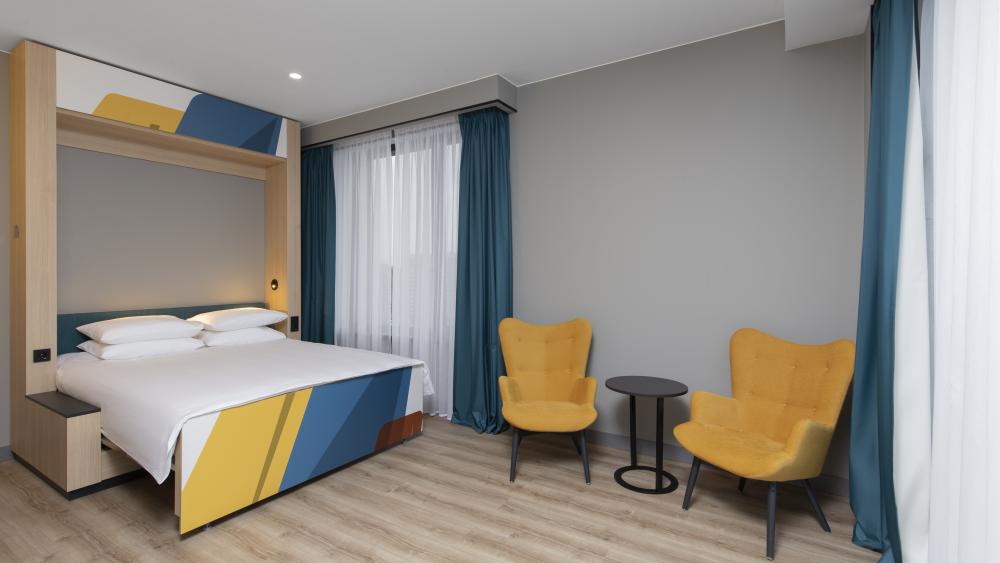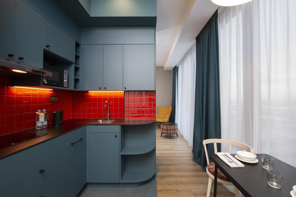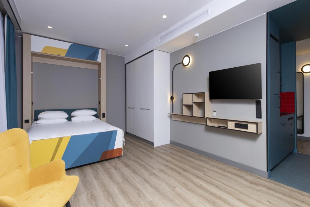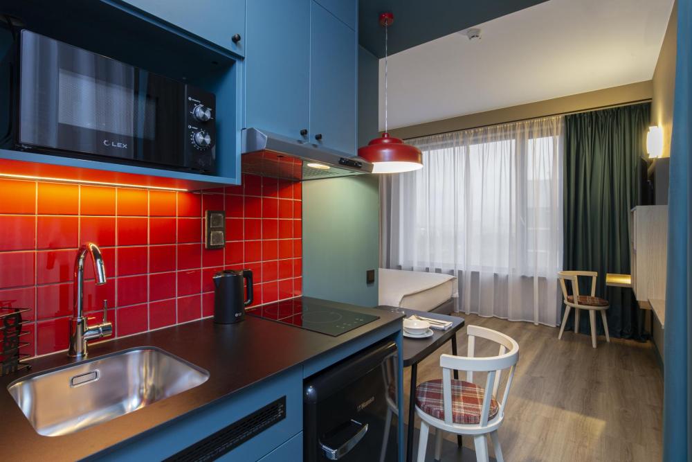 Номер с одной двуспальной кроватью (Queen size), которая может трансформироваться в диван. Стильный интерьер и функциональная мини-кухня обеспечивает максимальный комфорт пребывания. Каждый номер оснащен рабочей зоной, беспроводным интернетом и ЖК-телевизором. Другие удобства включают сейф, фен, принадлежности для приготовления чая и кофе, гладильную доску и утюг, бесплатную минеральную воду.