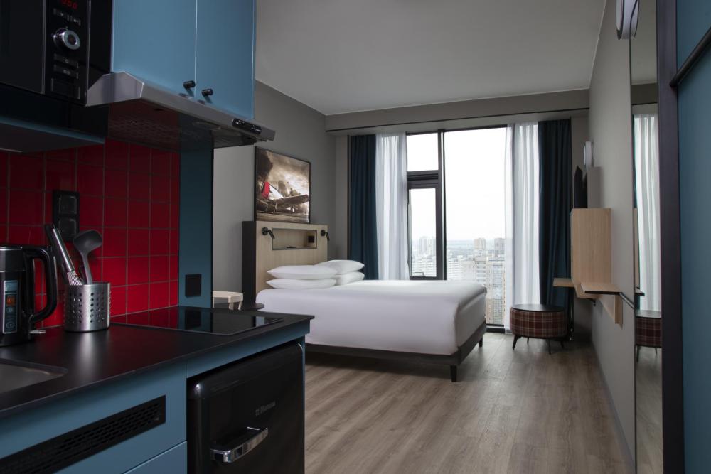 Номер с одной большой кроватью. Зона кухни наполнена всей необходимой техникой и набором посуды, что обеспечивает максимальный комфорт пребывания. Оставайтесь на связи благодаря бесплатному беспроводному Интернету. Другие удобства включают: сейф, фен, принадлежности для приготовления чая и кофе, гладильную доску и утюг, бутилированная вода.