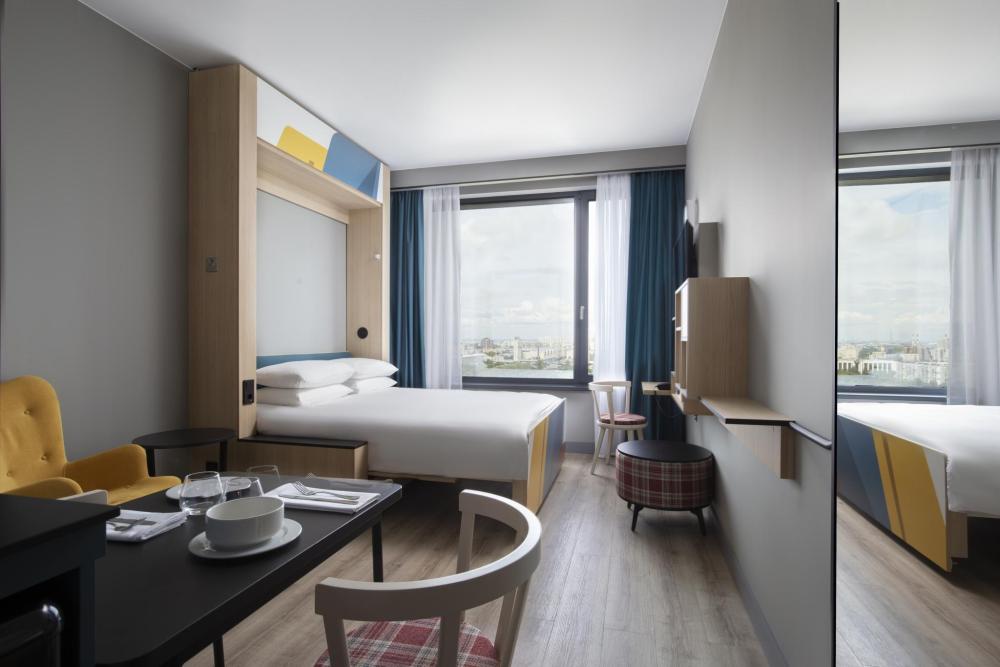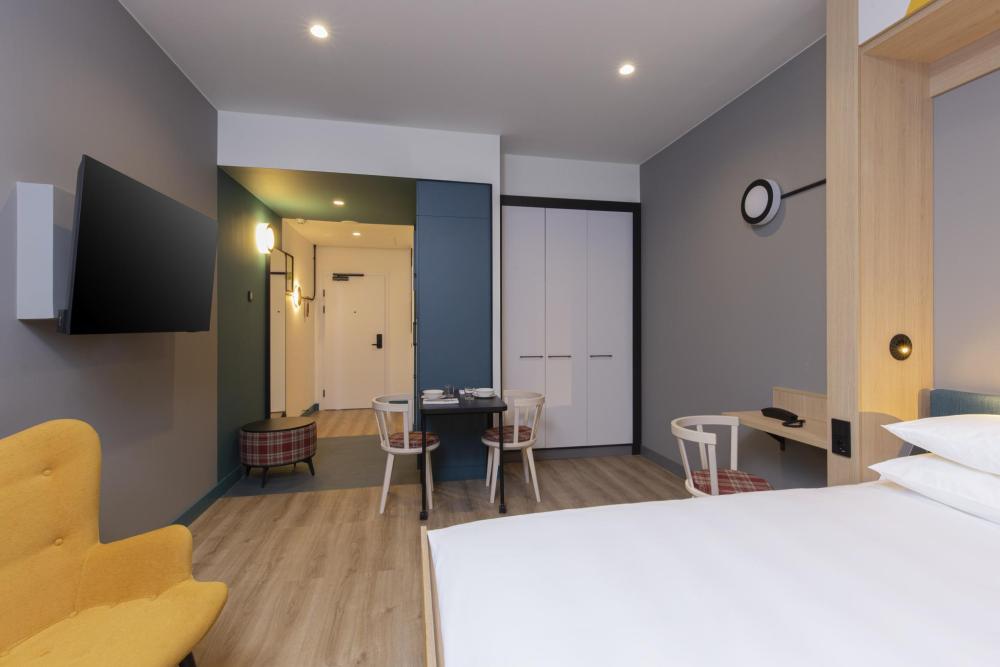 Комфортабельный семейный номер с стильным интерьером и функциональной кухней. Кухня находится в прихожей, что позволяет разделить зону отдыха и зону приготовления еды. Насладитесь панорамным видом из окон на город, или отдохните всей семьей на балконе. Каждый номер оснащен рабочей зоной, беспроводным интернетом и ЖК-телевизором. Другие удобства включают сейф, фен, принадлежности для приготовления чая и кофе, гладильная доска и утюг, бесплатную минеральную воду.