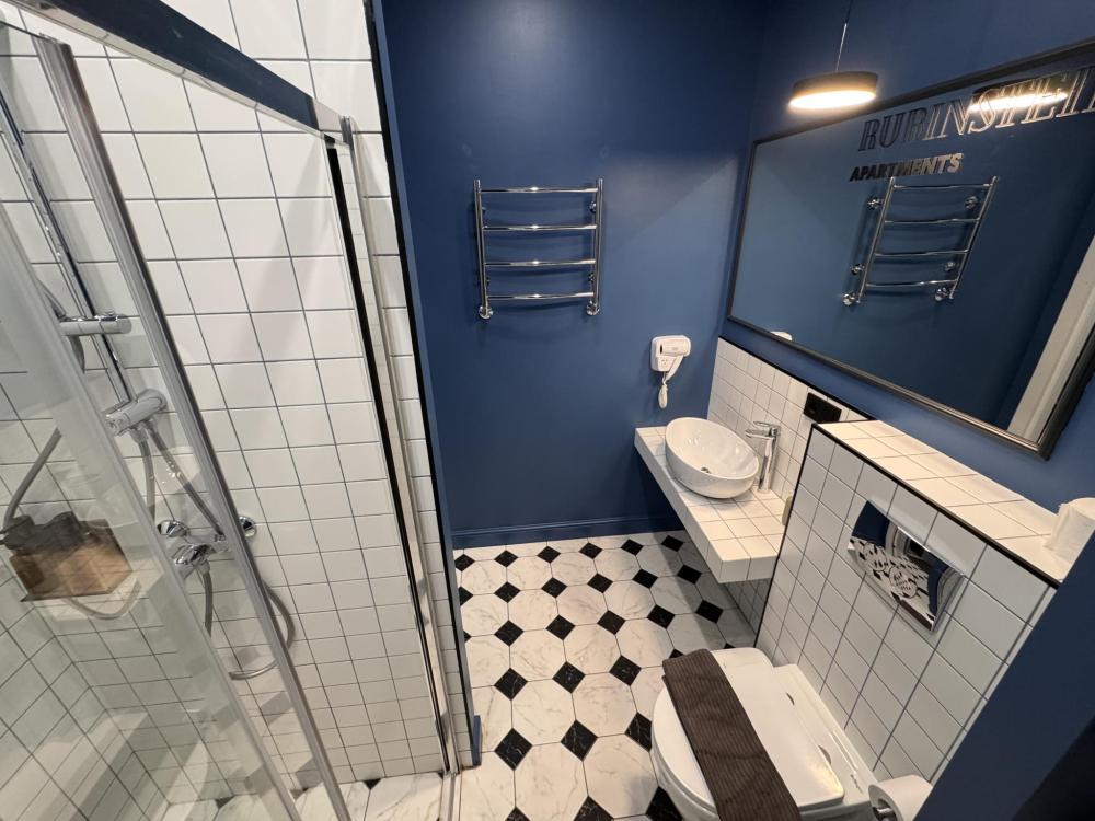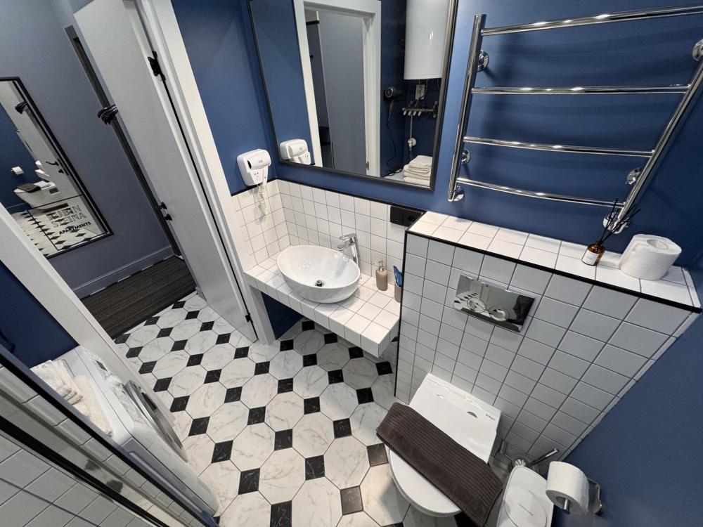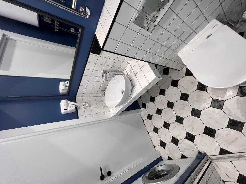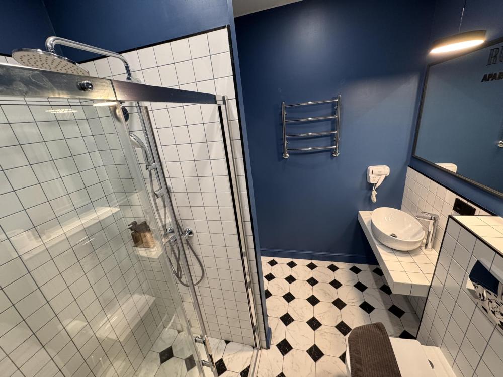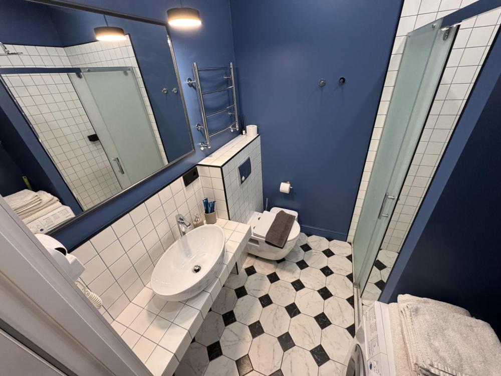 Оборудованный сан узел: теплый пол, стильная душевая, фен, стиральная машина, гладильные и косметические принадлежности, полотенца и комплекты белья для каждого гостя. Продуманная шумоизоляция и вентиляция.