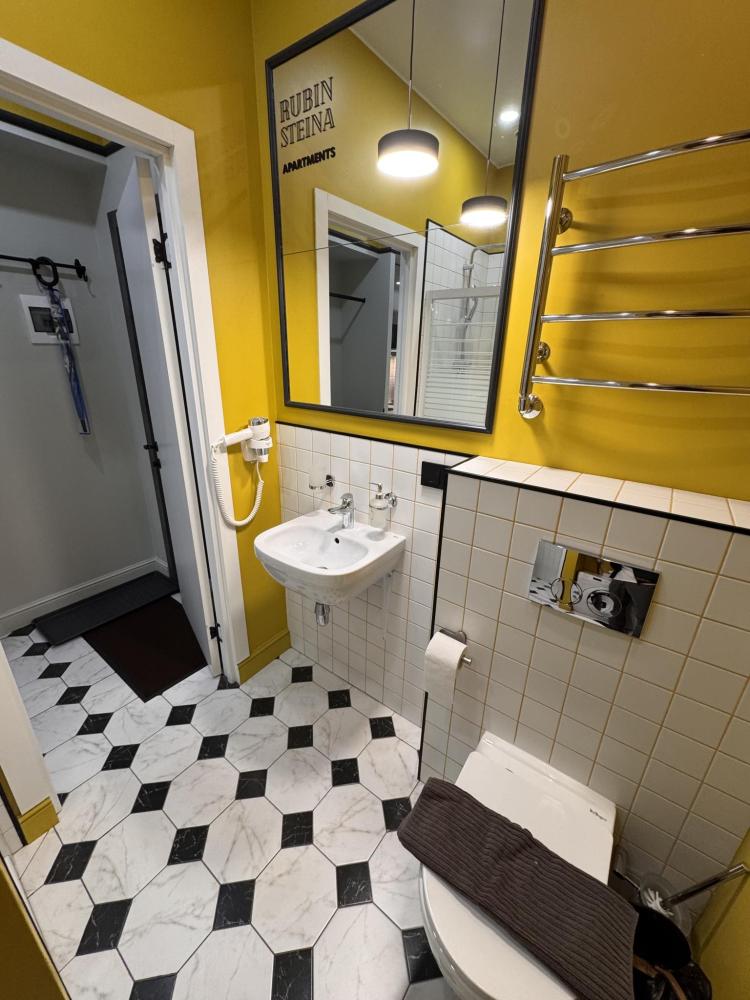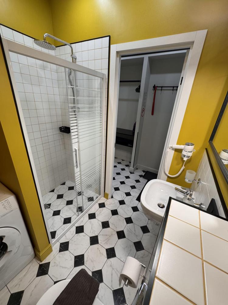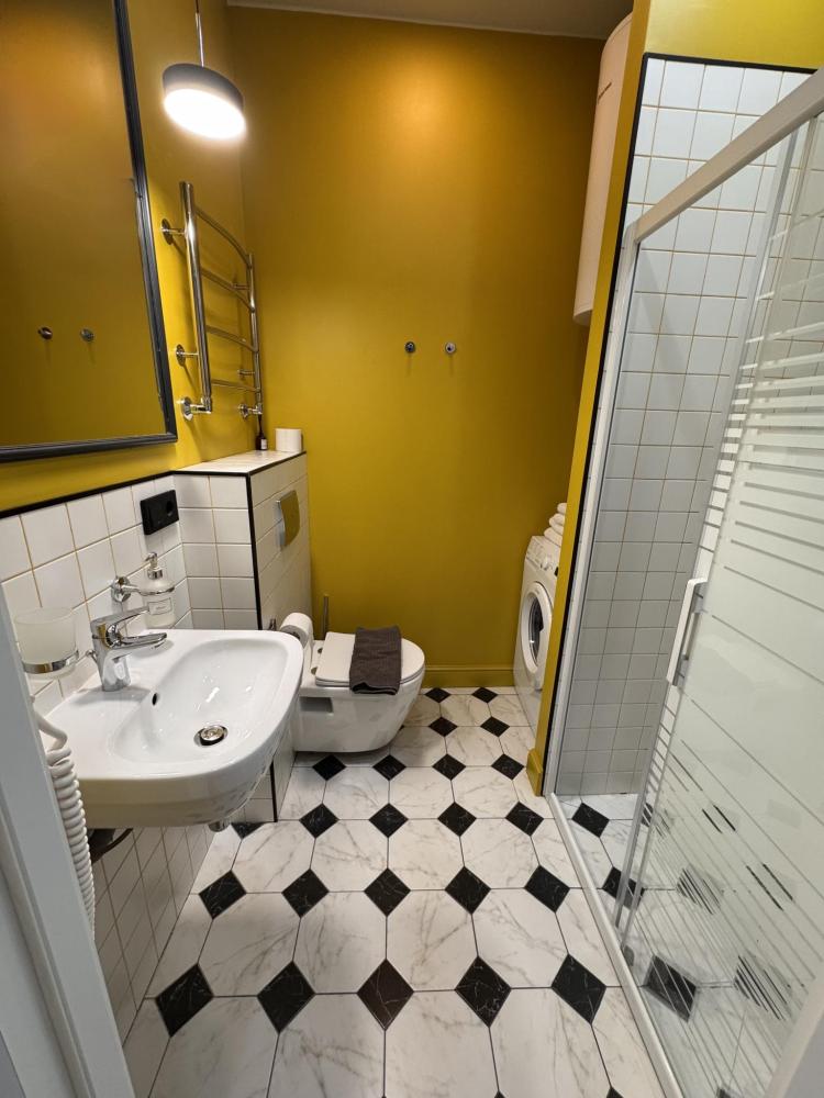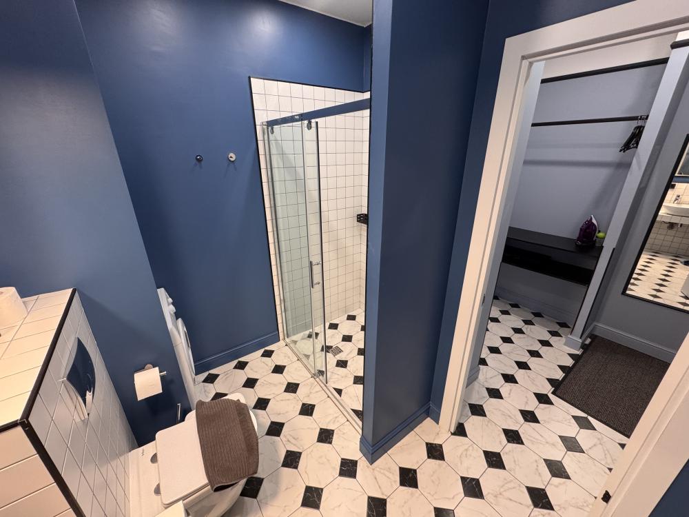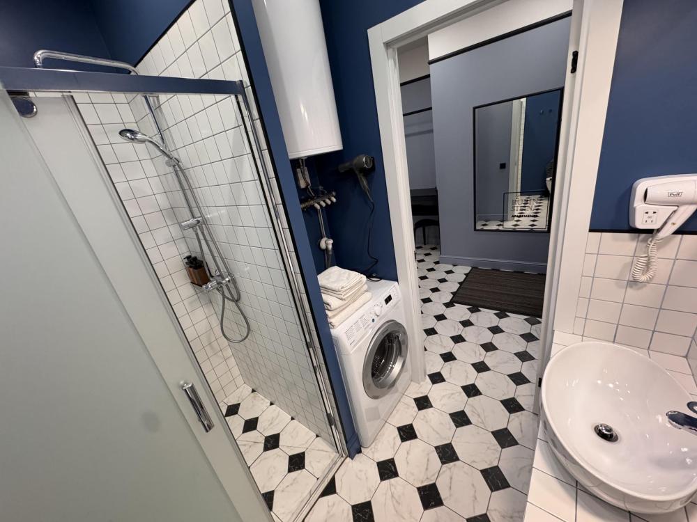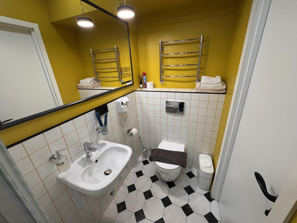 Оборудованный сан узел: теплый пол, стильная душевая, фен, стиральная машина, гладильные и косметические принадлежности, полотенца и комплекты белья для каждого гостя. Продуманная шумоизоляция и вентиляция.
