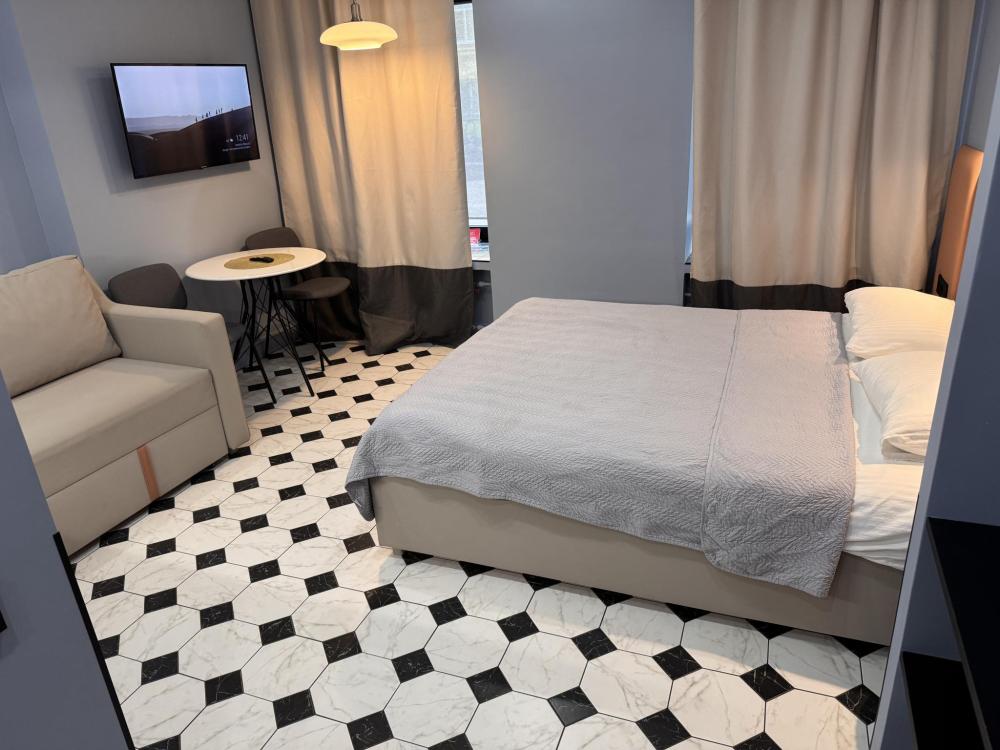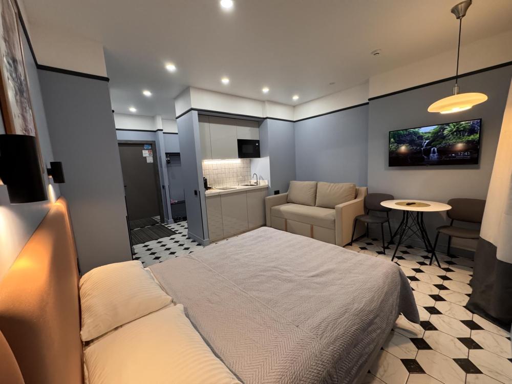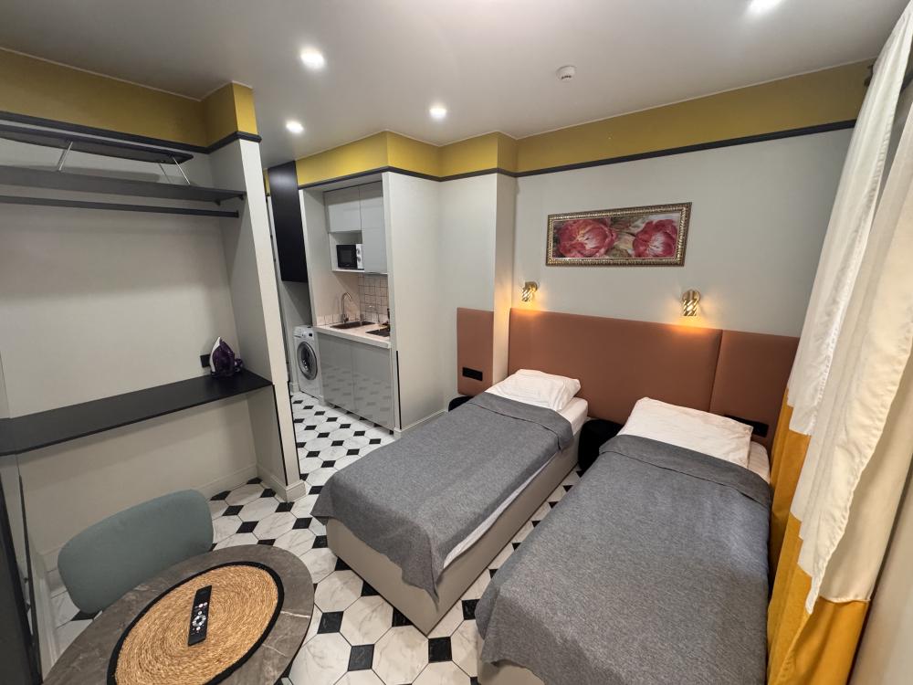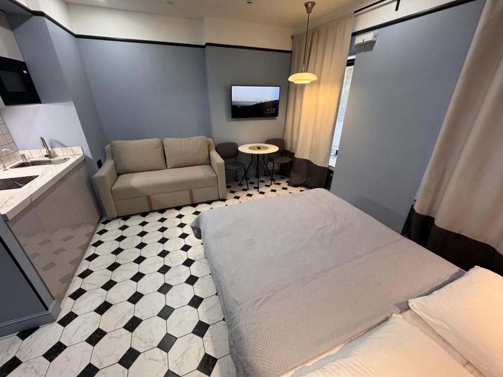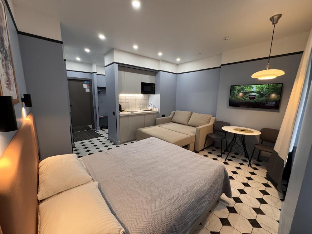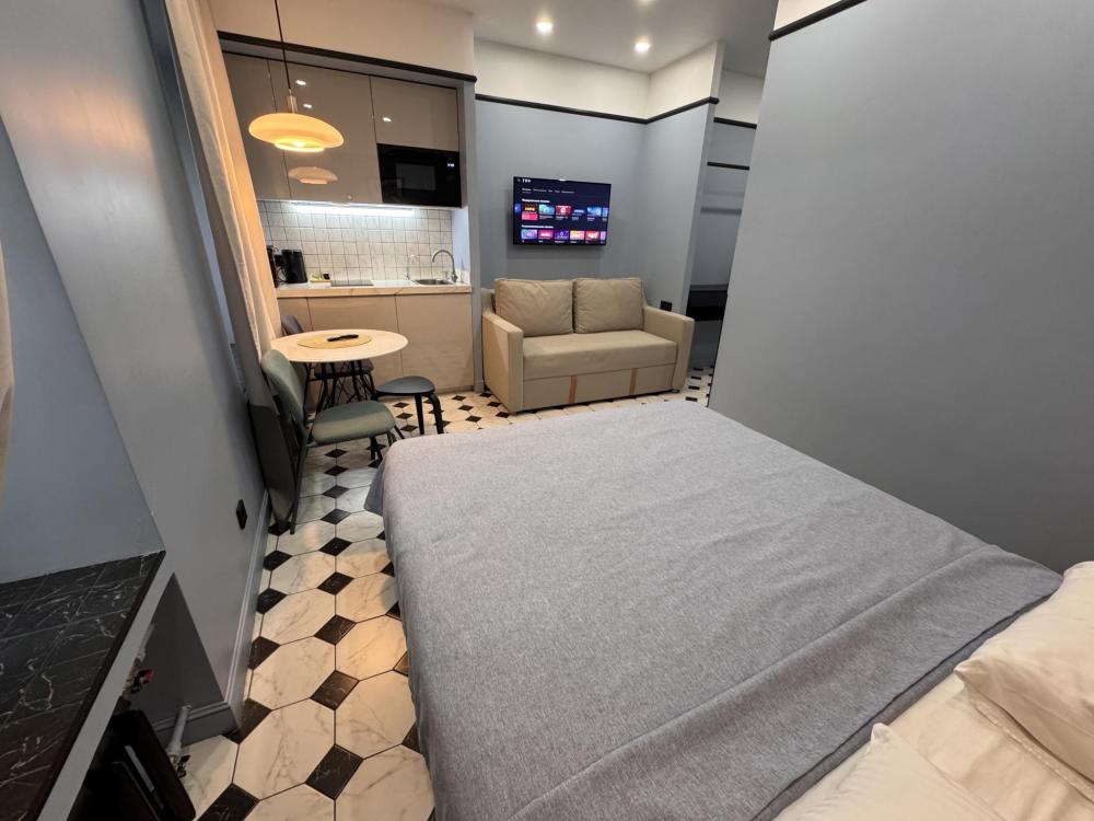 В стильных апартаментах большая двуспальная кровать и двух местный раскладывающийся диван; идеальная шумоизоляция и вентиляция; полностью оборудованная кухня: кофе машина ТВ стиралка и т.д.