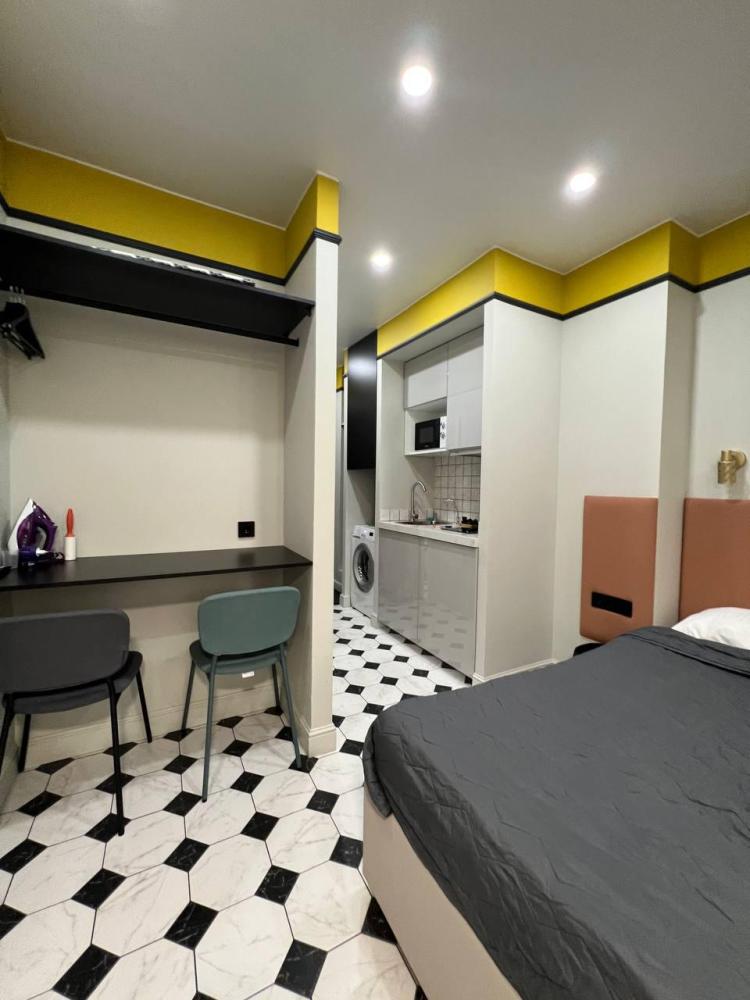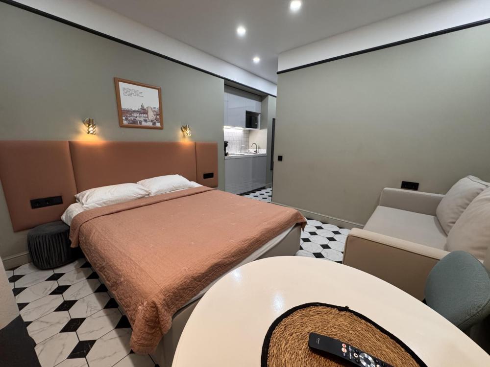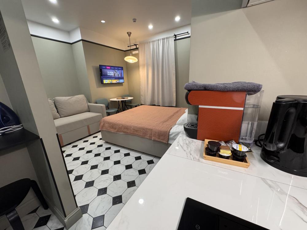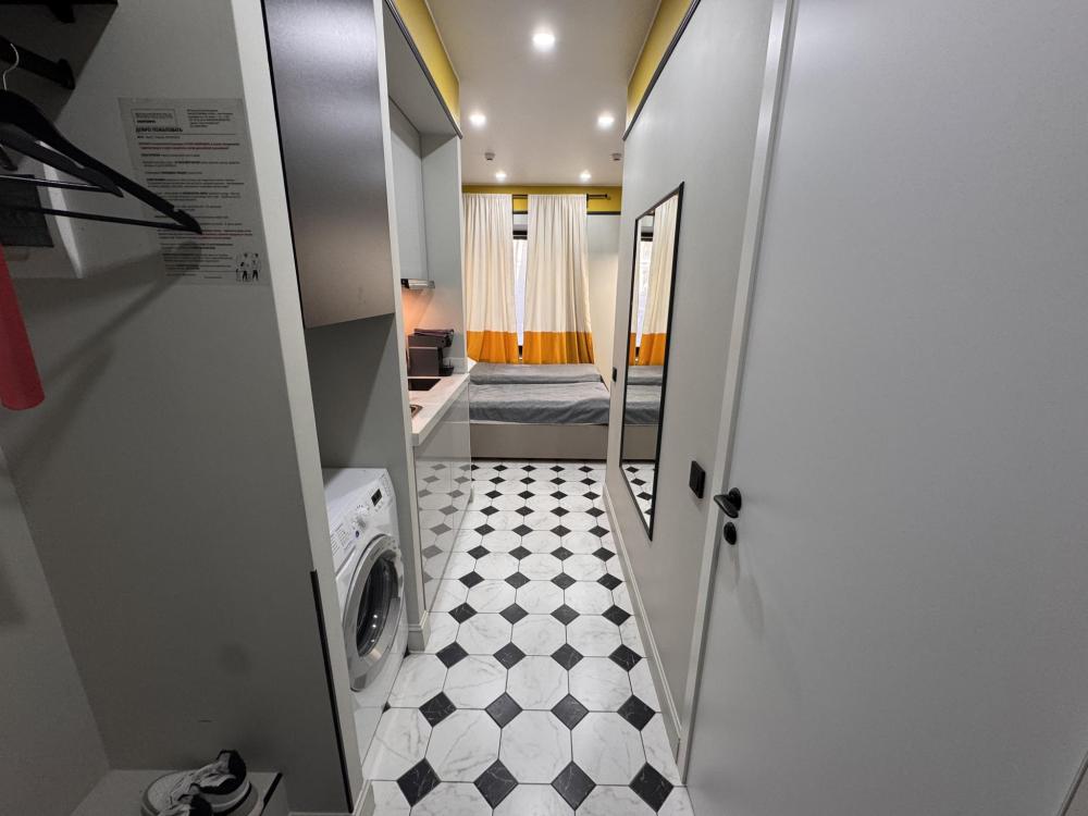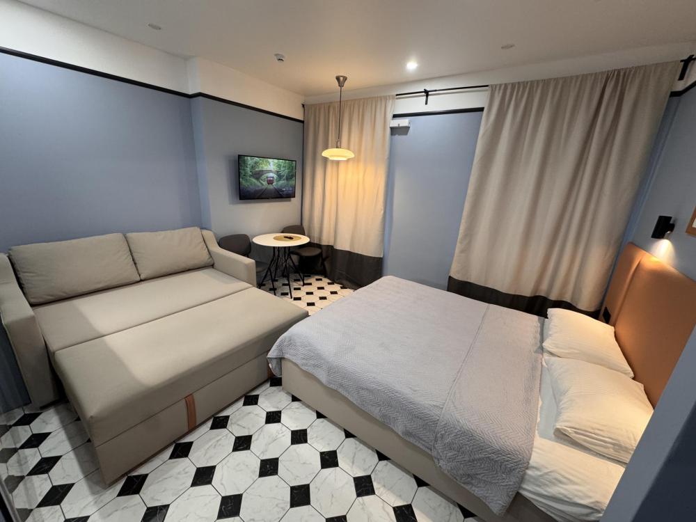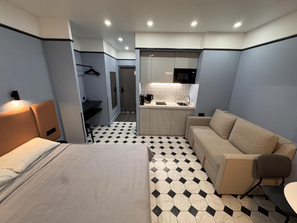 В стильных апартаментах большая двуспальная кровать и двух местный раскладывающийся диван; идеальная шумоизоляция и вентиляция; полностью оборудованная кухня: кофе машина ТВ стиралка и т.д.