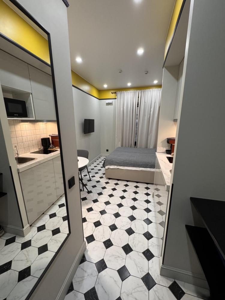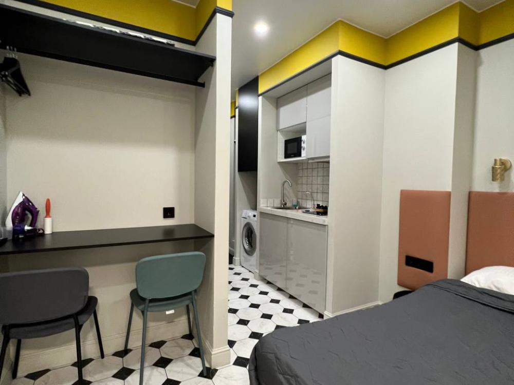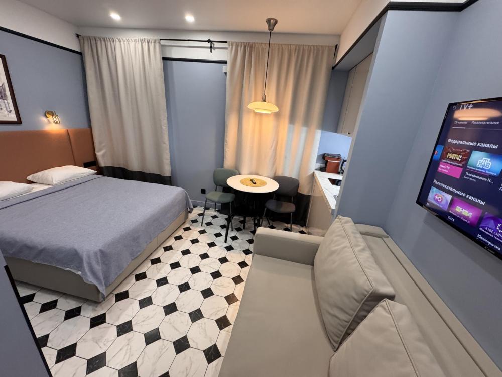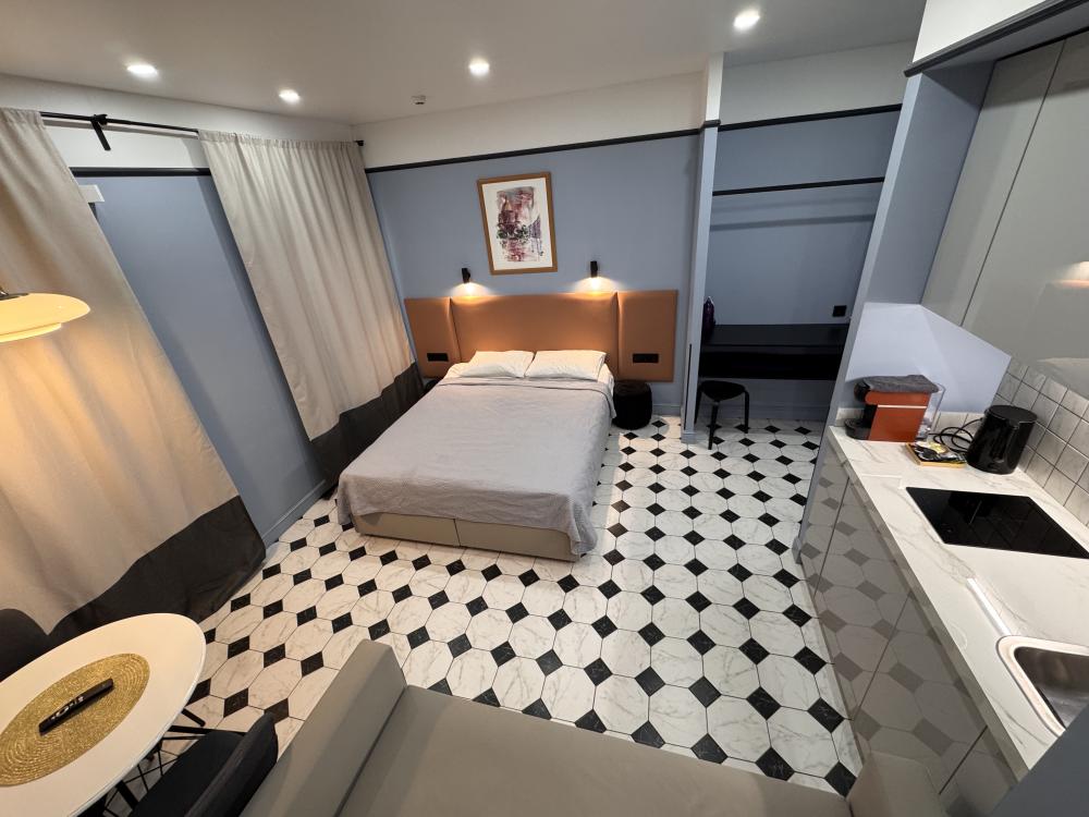 К услугам гостей бесплатный Wi-Fi В стильных апартаментах есть полностью оборудованная кухня: плита, холодильник, микроволновая печь, вытяжка, капсульная кофе машина, чайный набор, Smart TV