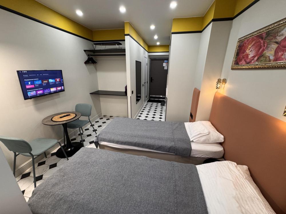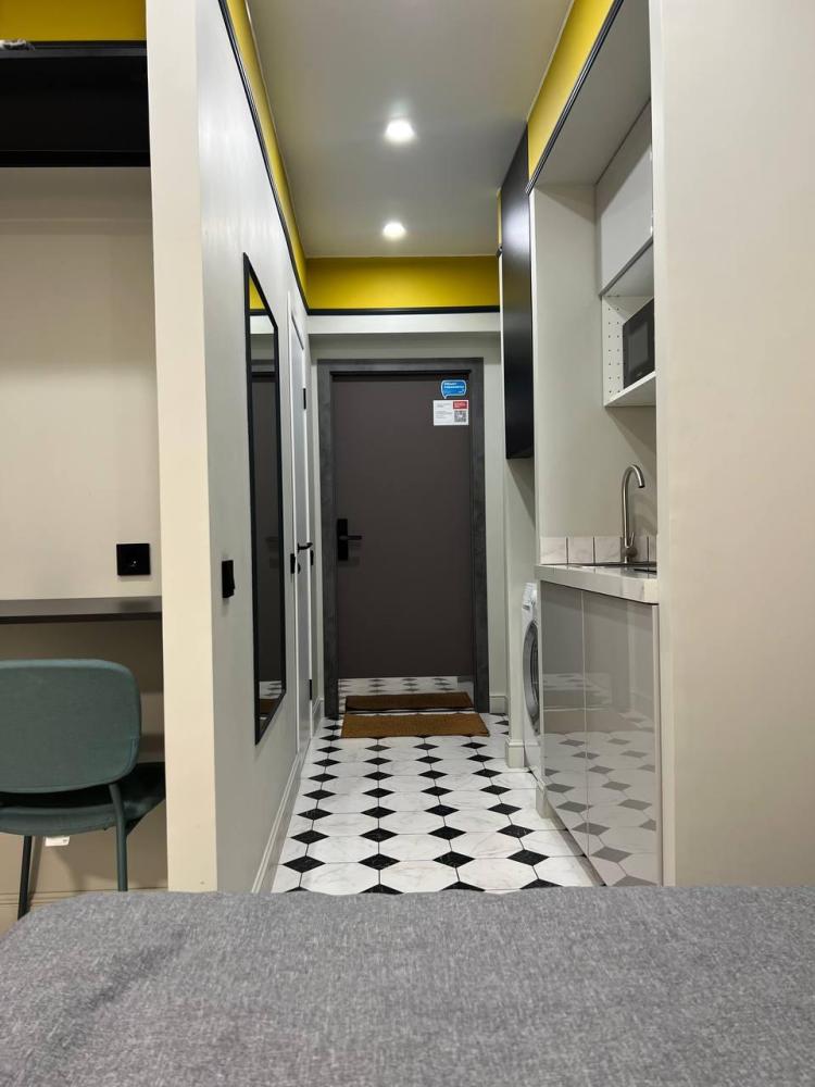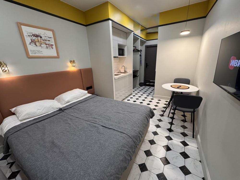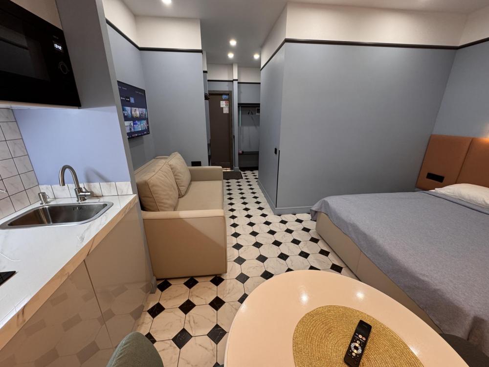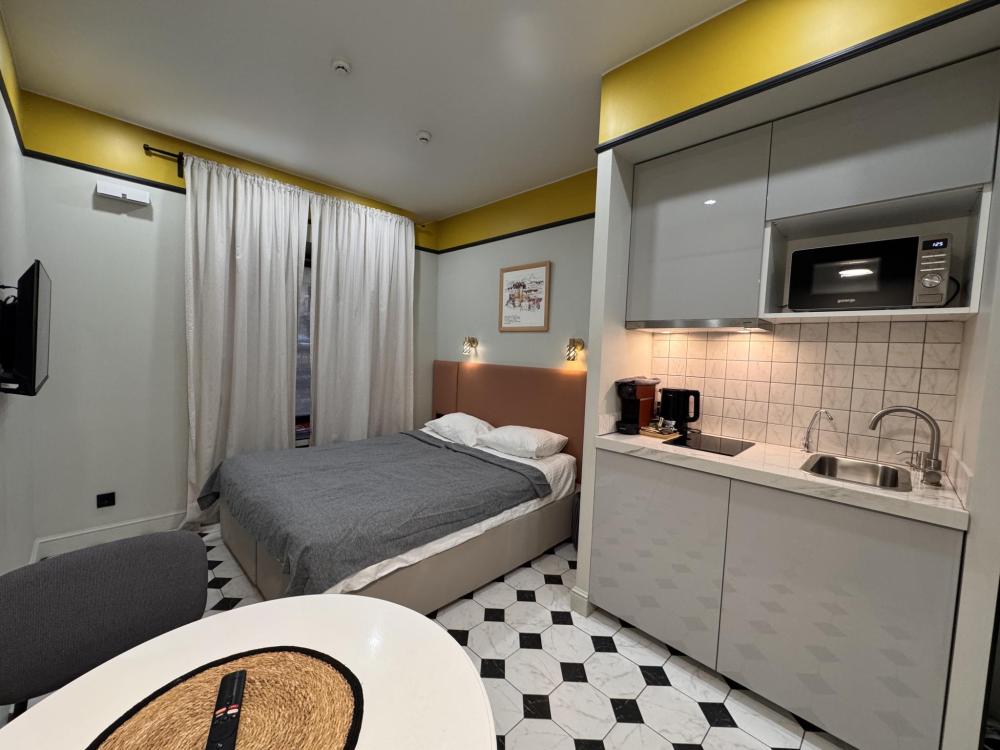 К услугам гостей бесплатный Wi-Fi В стильных апартаментах есть полностью оборудованная кухня: плита, холодильник, микроволновая печь, вытяжка, капсульная кофе машина, чайный набор, Smart TV