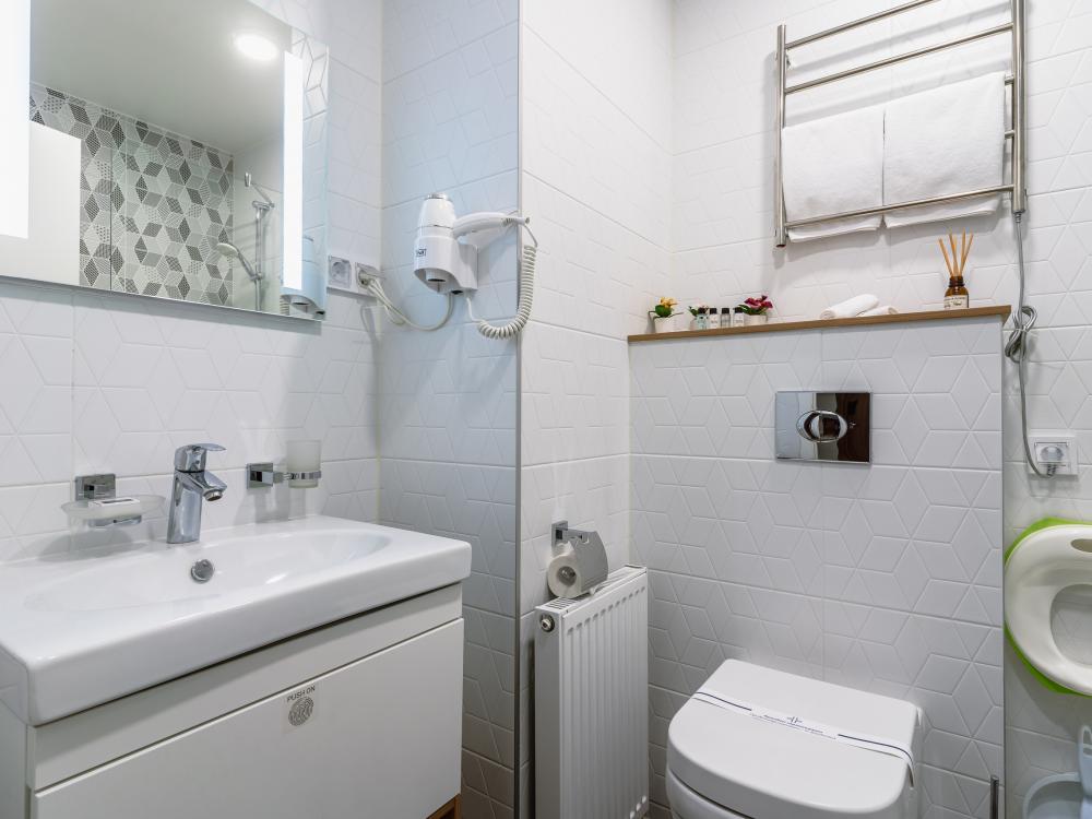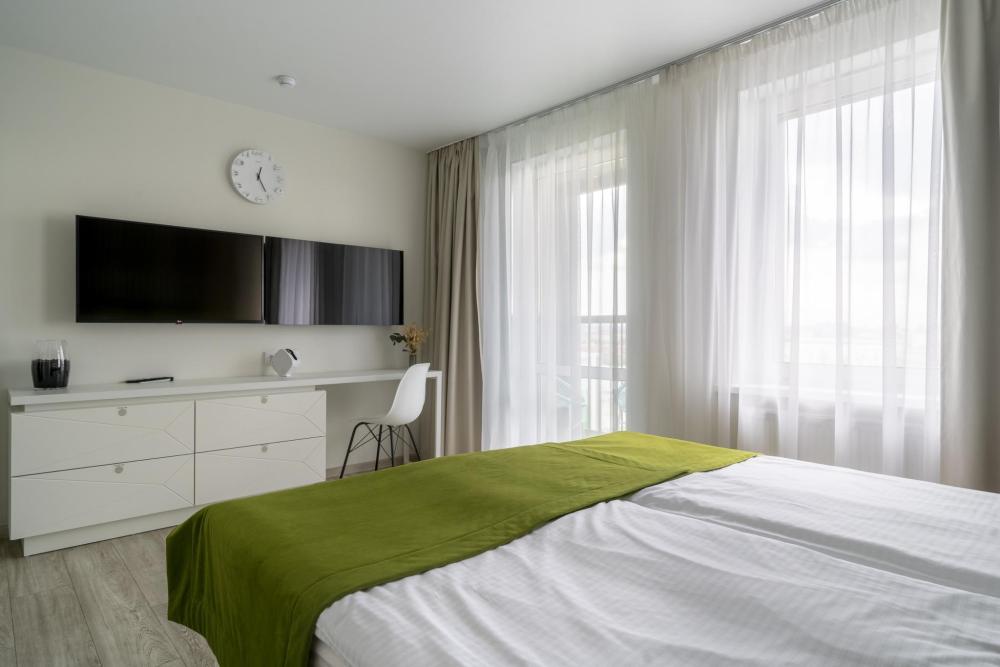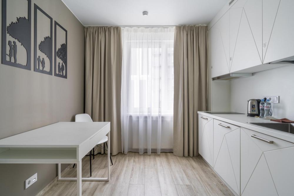 Комфортные апартаменты с фирменным уютным дизайном в едином современном стиле, площадью 24 кв.м., полностью укомплектованные новой бытовой техникой. Для удобства проживающих в номере предусмотрены холодильник, СВЧ печь, чайник, индукционная плита, полный набор кухонных принадлежностей, посуды, стиральная машина и даже проектор звездного неба. В каждом номере гостей ждут комплект гипоаллергенной уходовой косметики с приятным ароматом, комплект полотенец, бутилированная питьевая вода и белоснежные тапочки на две персоны.