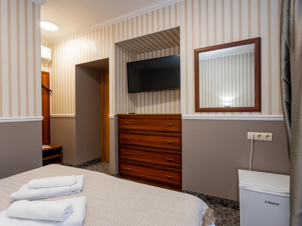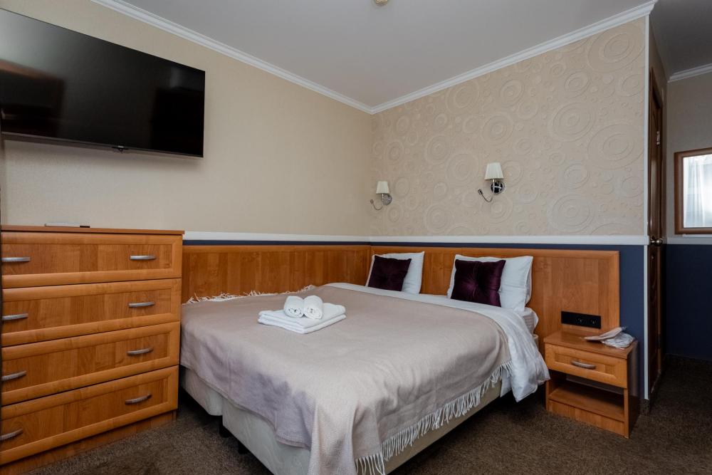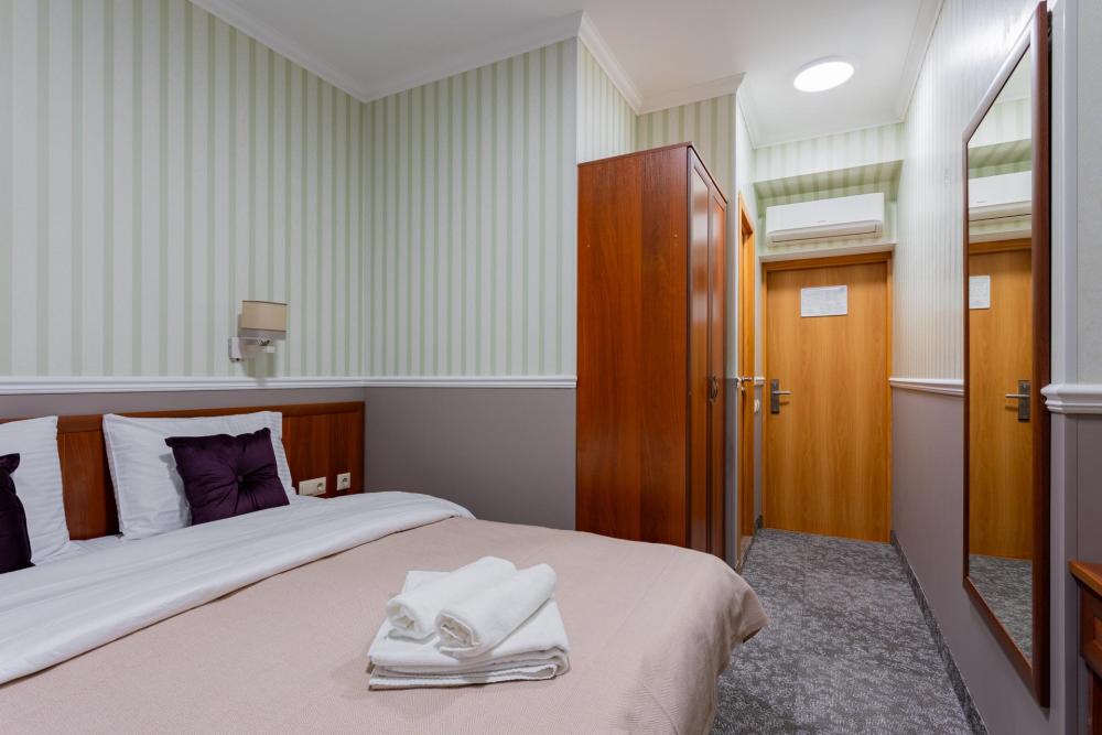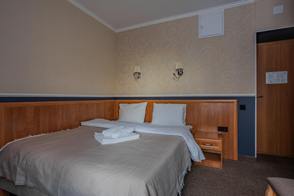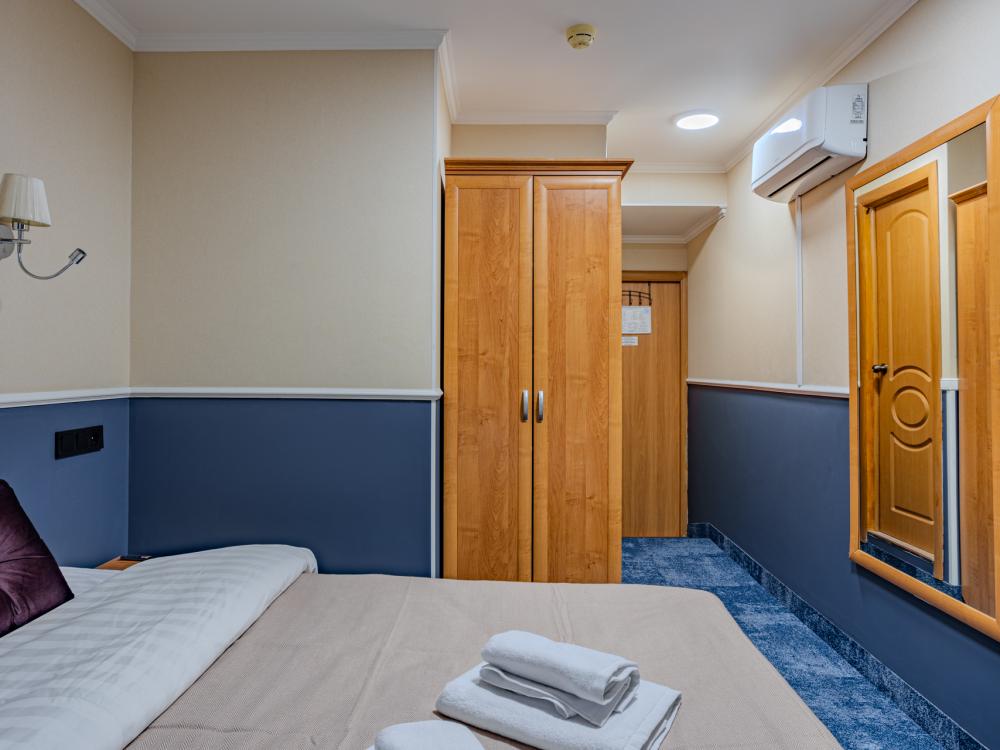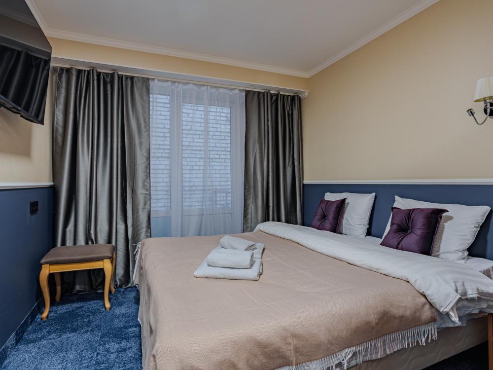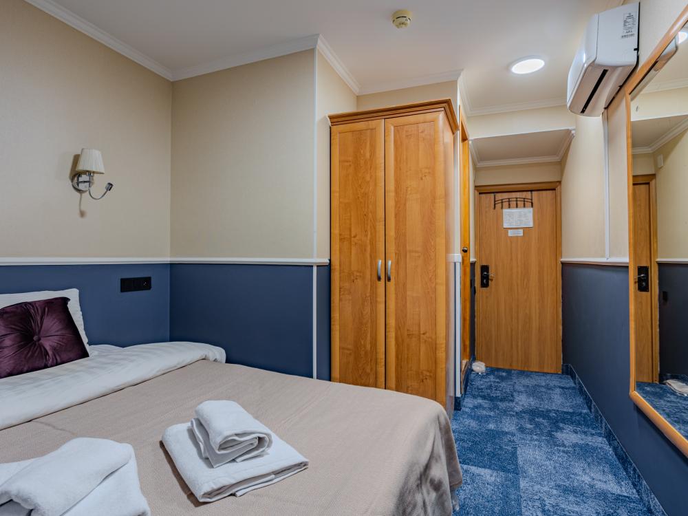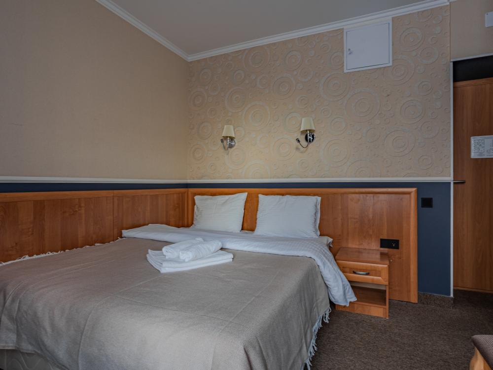 Двухместная комната категории "Стандарт" с одной широкой кроватью или двумя раздельными кроватями и собственной ванной комнатой. Комната оборудована телевизором, феном и кондиционером.