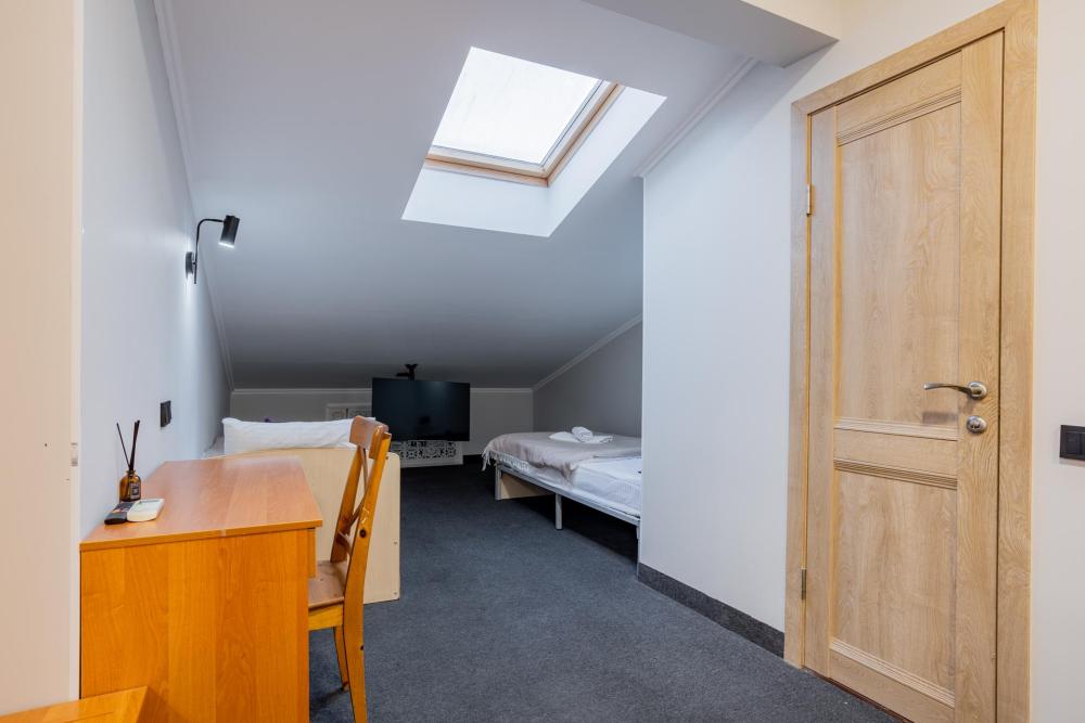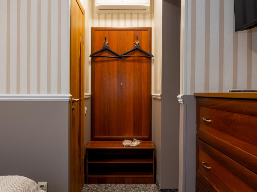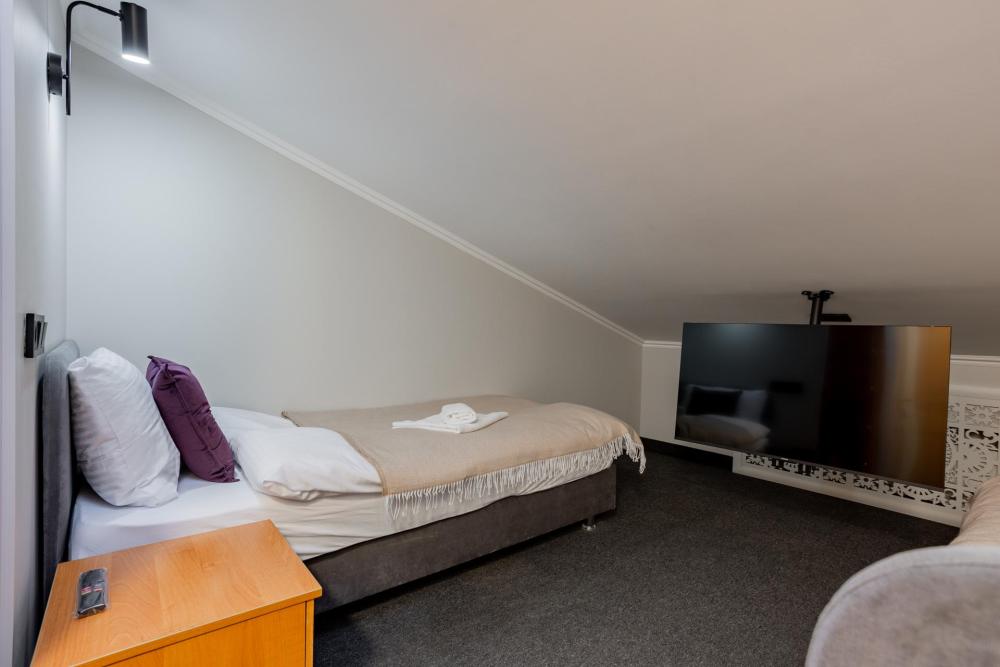 Одноместная мансардная комната категории "Стандарт" с одной кроватью и собственной ванной комнатой. Комната оборудована телевизором, феном и кондиционером.