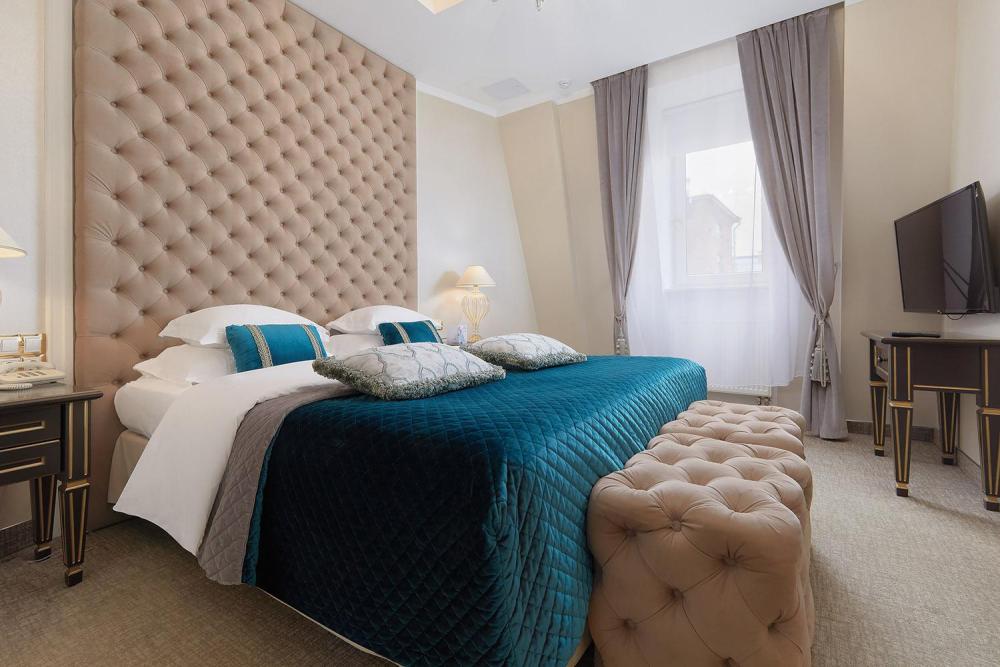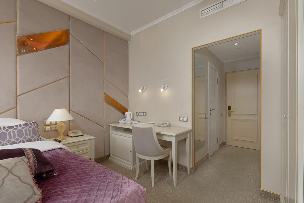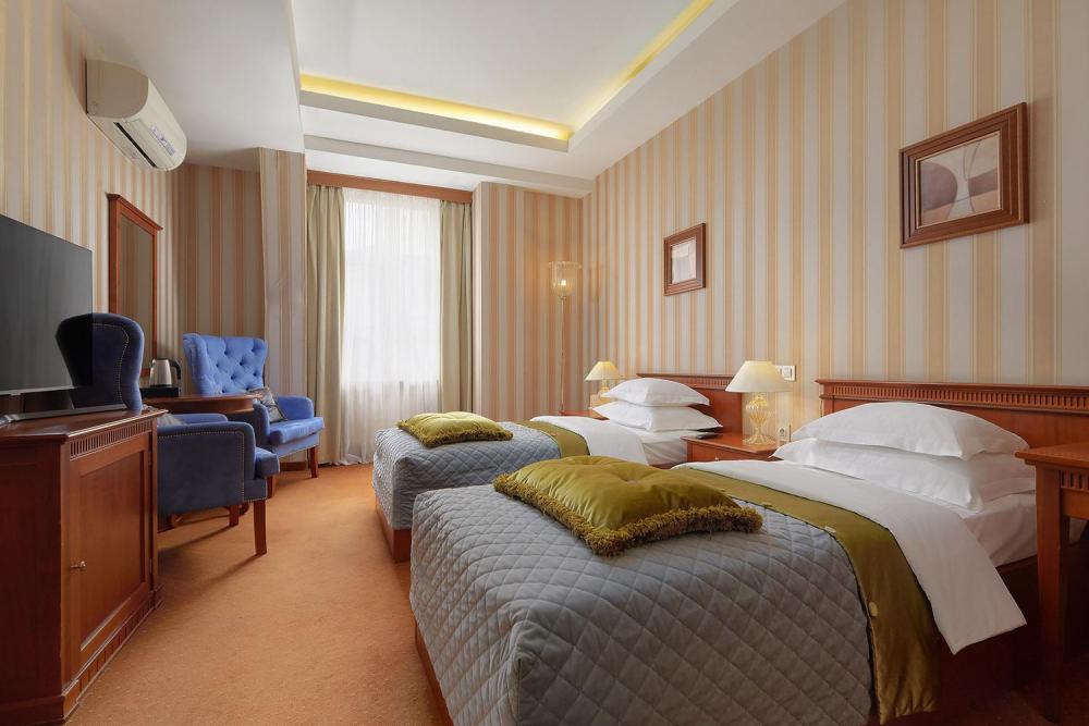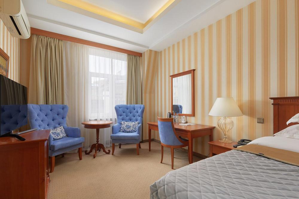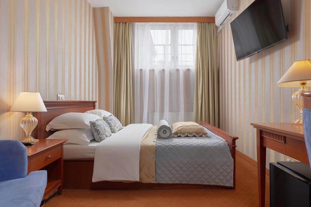 Просторные уютные номера, площадью от 21 кв.м., с широкой двуспальной кроватью, выполнены в классическом стиле. Номера оснащены всем необходимым для комфортного пребывания гостей в полном соответствии с международными стандартами гостеприимства. Вид из окна: во внутренний дворик отеля, в атриум отеля. Часть номеров оснащены мансардными окнами. Часть номеров расположена на втором этаже (подъем/спуск по лестнице). Оборудование номера: • Двуспальная кровать или 2 раздельные, письменный стол, журнальный столик, стулья, гардероб • Кондиционер • Плазменная панель, бесплатное беспроводное подключение к интернету (WIFI) • Минибар, сейф • Туалетные принадлежности, фен, халат, тапочки • Ванная комната с ванной • Вид из окна: во внутренний дворик отеля, в атриум отеля • Часть номеров оснащены мансардными окнами • Некоторые номера расположены на втором этаже (подъем/спуск по лестнице).