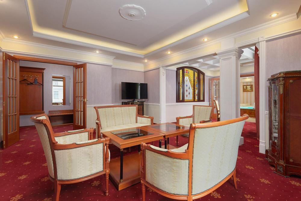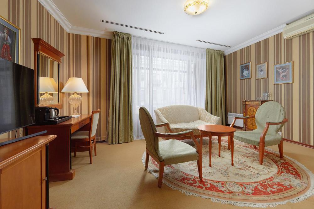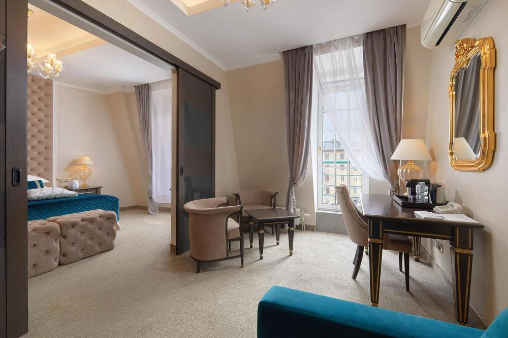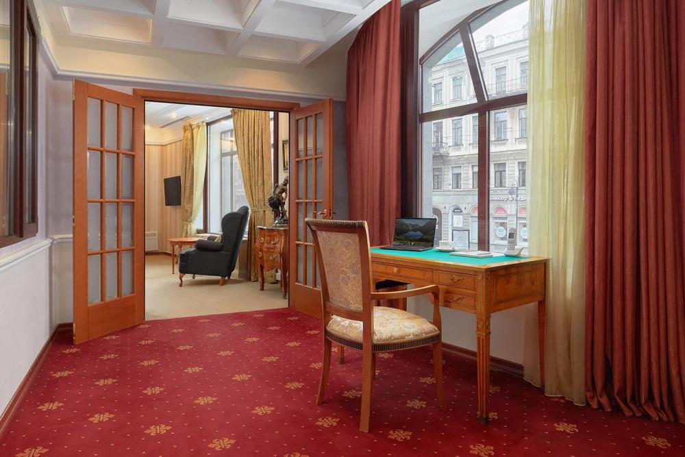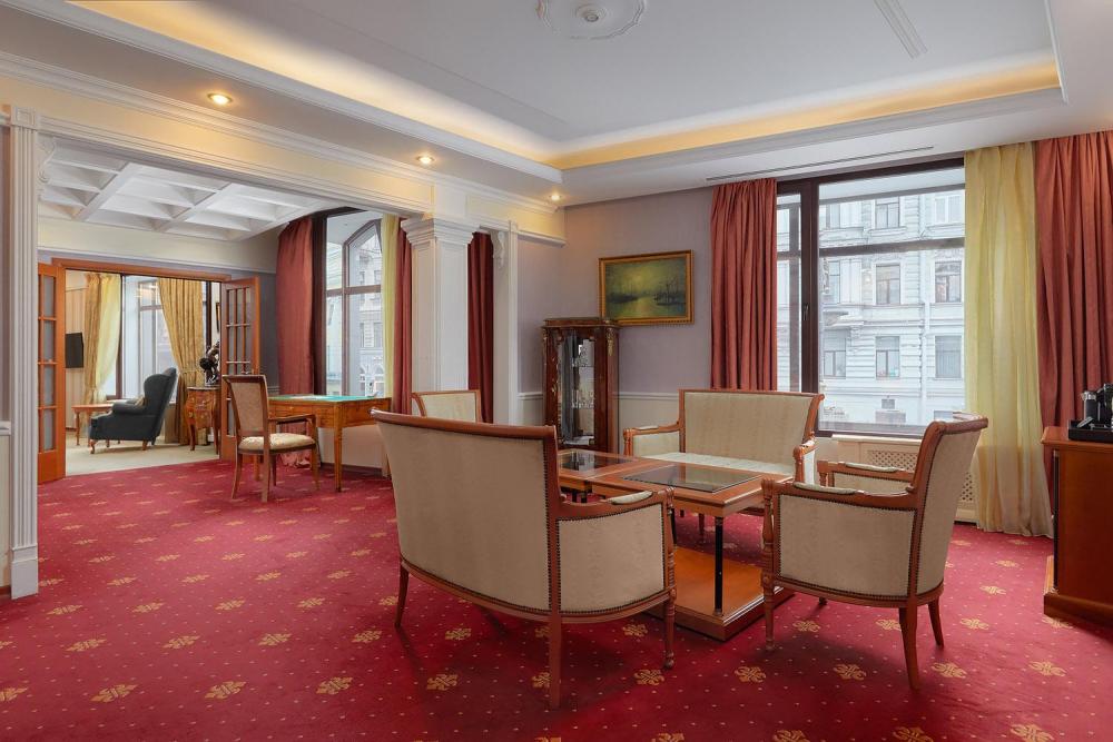 Трехкомнатный номер, площадью 75 кв. м. с широкой двуспальной кроватью, 3 панорамных окна с видом на театр Ленсовета (Владимирский пр.) Стильная гостиная с итальянской мебелью ручной работы, отдельный кабинет, тщательно отобранные произведения искусства, украшающие номер, делают Люкс подходящим как для делового приема на самом высоком уровне, так и для встречи с друзьями в неформальной обстановке. Вид из окна: на город (Владимирский проспект) Номер расположен на втором этаже (подъем/спуск по лестнице). Оборудование номера: Двуспальная кровать Гардеробная Оборудованная рабочая зона Антикварная мебель, софа, мягкая мебель Кондиционер, телевидение, DVD проигрыватель, бесплатное беспроводное подключение к интернету (WIFI) Минибар, сейф Туалетные принадлежности, фен, халат, тапочки Ванная комната с ванной, дополнительный санузел Вид из окна: на город Номер расположен на втором этаже (подъем/спуск по лестнице).