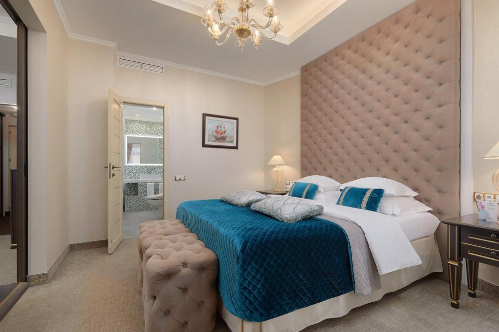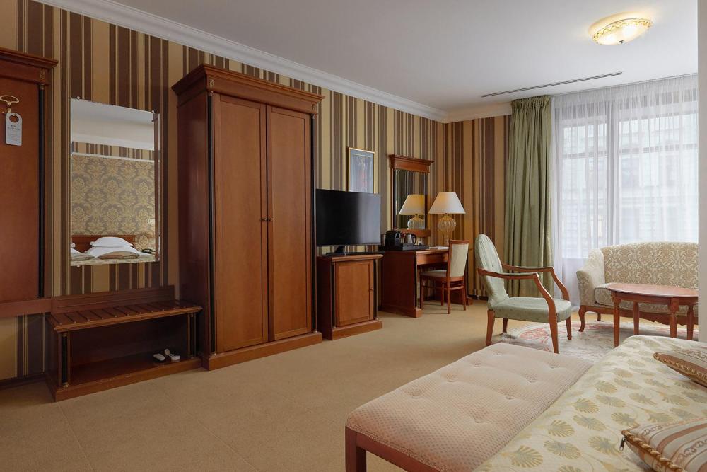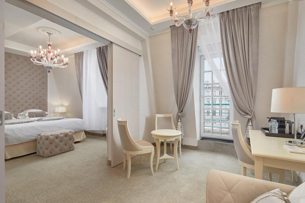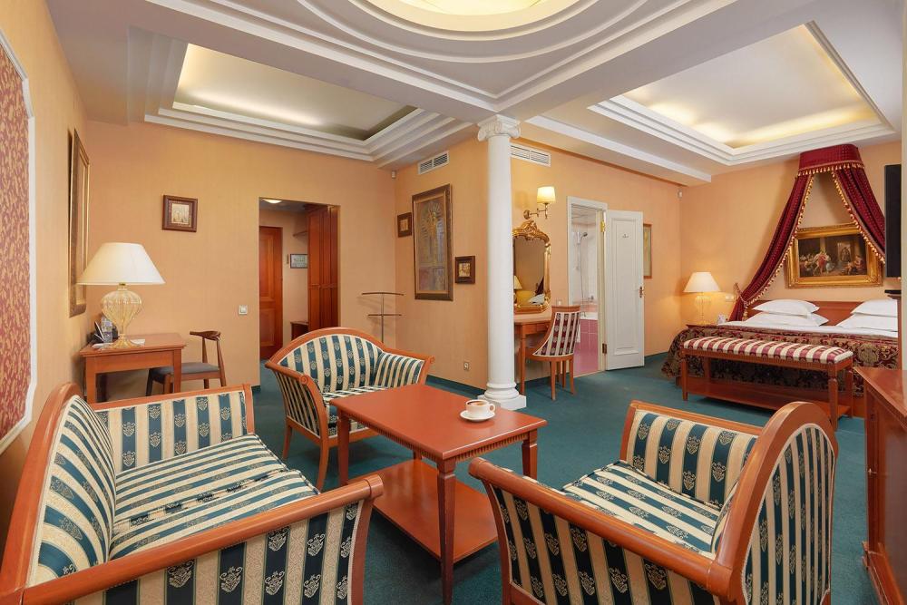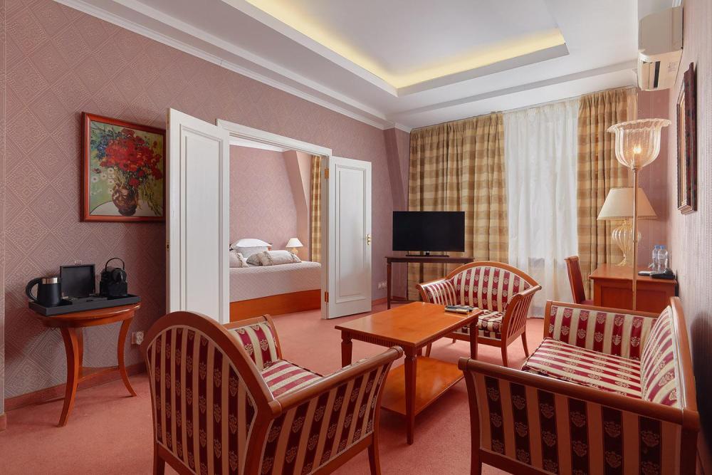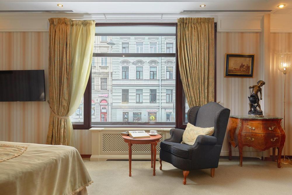 Трехкомнатный номер, площадью 75 кв. м. с широкой двуспальной кроватью, 3 панорамных окна с видом на театр Ленсовета (Владимирский пр.) Стильная гостиная с итальянской мебелью ручной работы, отдельный кабинет, тщательно отобранные произведения искусства, украшающие номер, делают Люкс подходящим как для делового приема на самом высоком уровне, так и для встречи с друзьями в неформальной обстановке. Вид из окна: на город (Владимирский проспект) Номер расположен на втором этаже (подъем/спуск по лестнице). Оборудование номера: Двуспальная кровать Гардеробная Оборудованная рабочая зона Антикварная мебель, софа, мягкая мебель Кондиционер, телевидение, DVD проигрыватель, бесплатное беспроводное подключение к интернету (WIFI) Минибар, сейф Туалетные принадлежности, фен, халат, тапочки Ванная комната с ванной, дополнительный санузел Вид из окна: на город Номер расположен на втором этаже (подъем/спуск по лестнице).