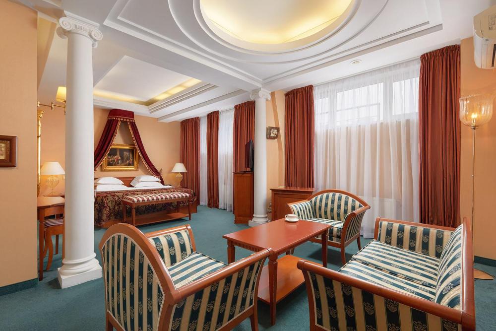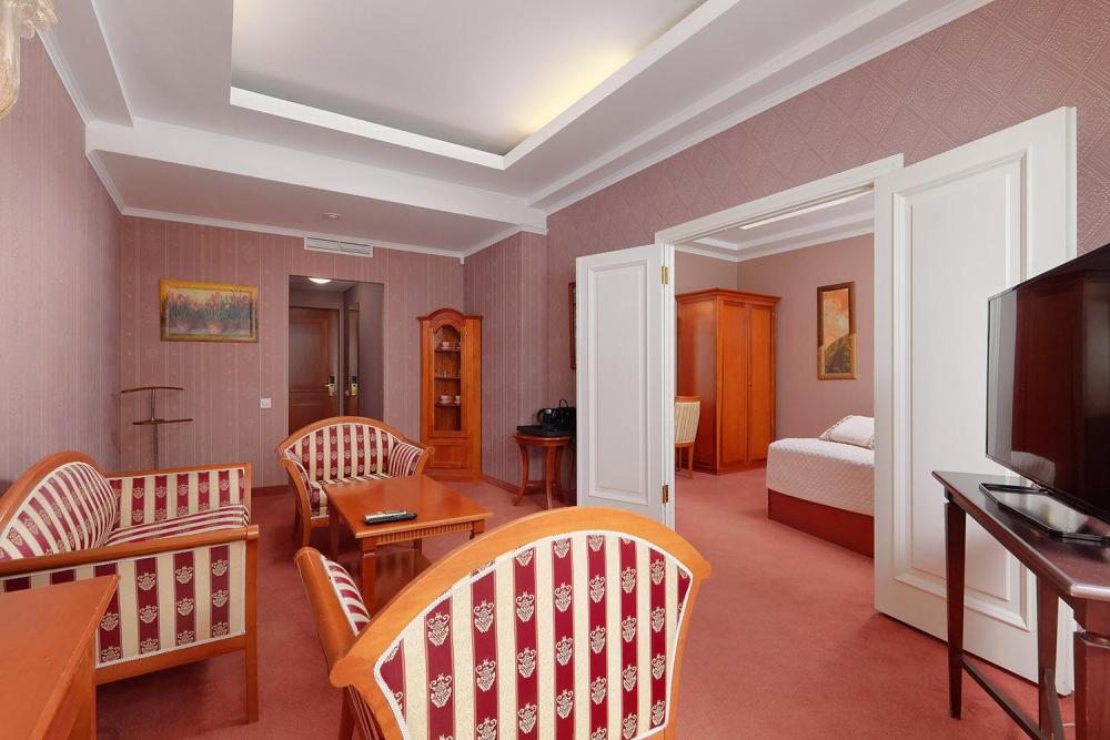 Просторные уютные номера, площадью от 40 кв. м., с широкой двуспальной кроватью. Идеальны для длительного проживания, номер разделен на 2 зоны (гостиная и спальня). Оборудование номера: • Двуспальная кровать, оборудованная рабочая зона (письменный стол, журнальный столик, стулья), гардероб, софа, мягкая мебель • Кондиционер, телевидение, DVD проигрыватель, бесплатное беспроводное подключение к интернету (WIFI) • Минибар, сейф, свежая пресса • Туалетные принадлежности, фен, халат, тапочки • Просторная ванная комната с ванной • Вид из окна: на город, внутренний дворик отеля