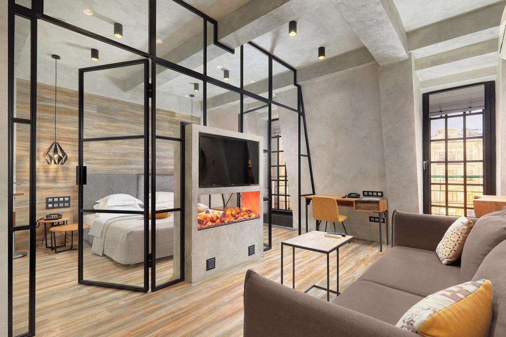 Просторный уютный номер-студио, выполненный в стиле лофт, площадью 38 кв.м. Номер прекрасно подходит для длительного проживания. Вид ио окна: на город Оборудование номера: Двуспальная кровать и 1,5 спальный раскладной диван Мини-кухня Камин Балкон Письменный стол, журнальный столик, стулья Кондиционер 2 телевизора, DVD проигрыватель, бесплатное беспроводное подключение к интернету (WIFI) Минибар, сейф, свежая пресса Туалетные принадлежности, фен, халат, тапочки Просторная ванная комната со спа душем Вид из окна: на город.