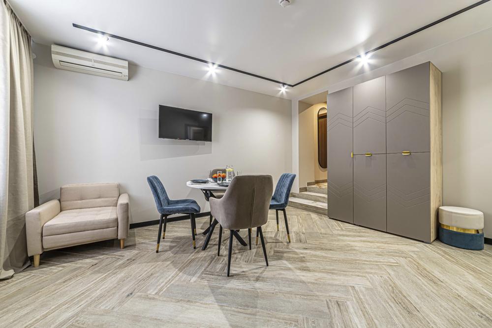 Номер увеличенной площади, cовременная мебель и сантехника, телефон, ТВ, душевая кабина, халаты, тапочки, фен, банные принадлежности, сейф, WiFi интернет, холодильник, кондиционер.