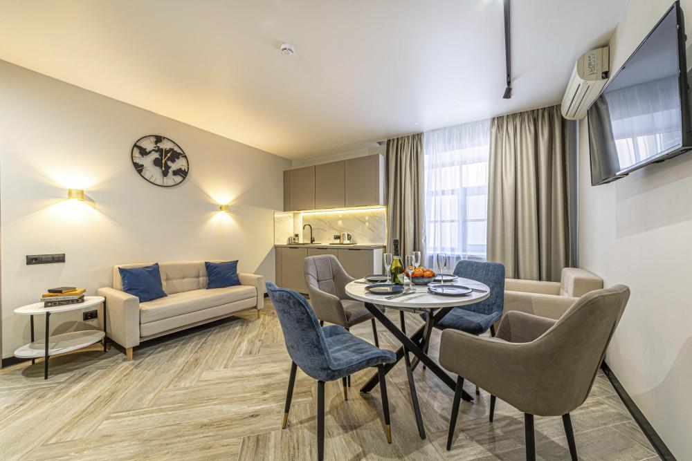 Комната и кухня. В кухне микроволновая печь, электрочайник, чай и кофе. Современная мебель и сантехника, телефон, ТВ, ванна, махровые халаты, фен, тапочки, банные принадлежности, сейф, WiFi интернет, холодильник, кондиционер