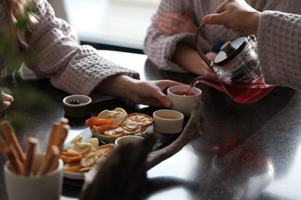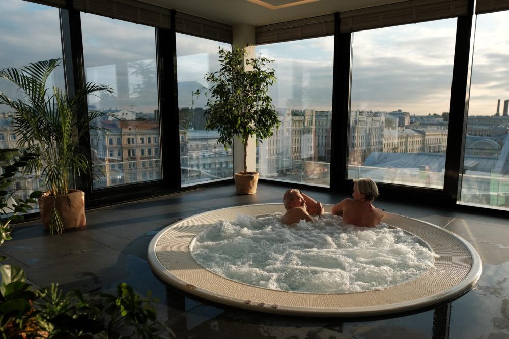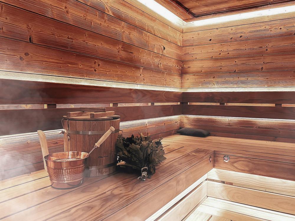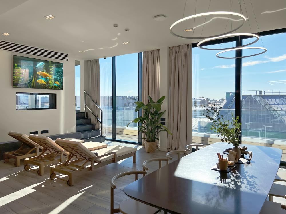 В номере: двуспальная кровать, нераскладной диван, стол, барные стулья, диван, пуфик, журнальный столик, гардеробная секция, зеркало, ТВ, а также небольшая кухня, укомплектованная микроволновой печью, чайником, плитой и комплектом необходимой посуды. Удобства (душ, туалет) находятся в номере.