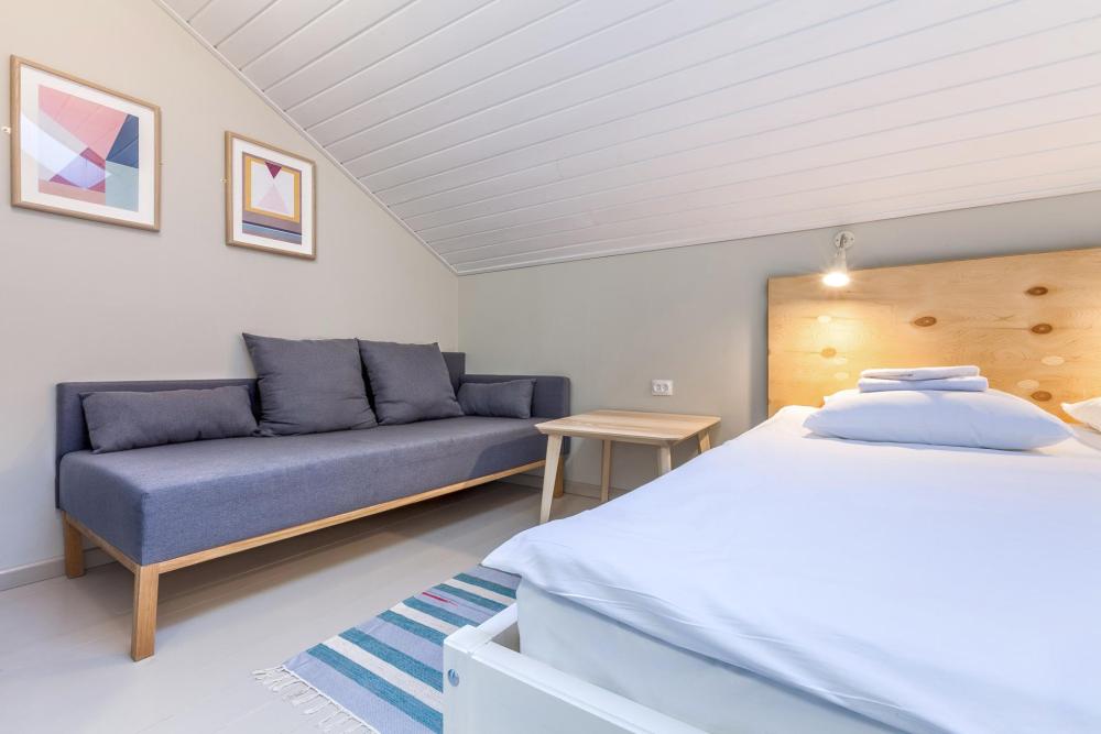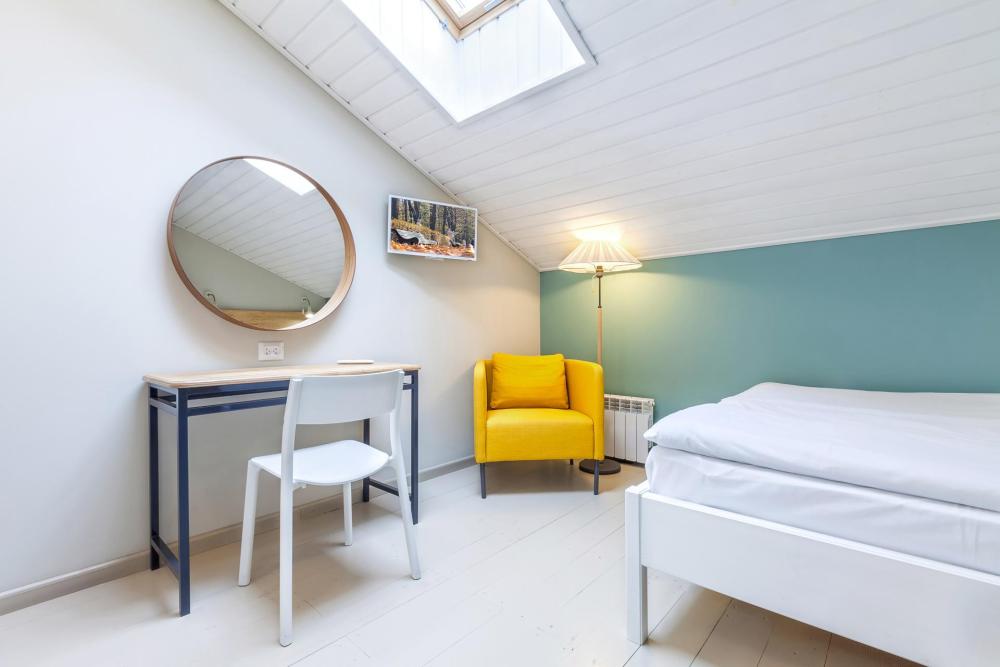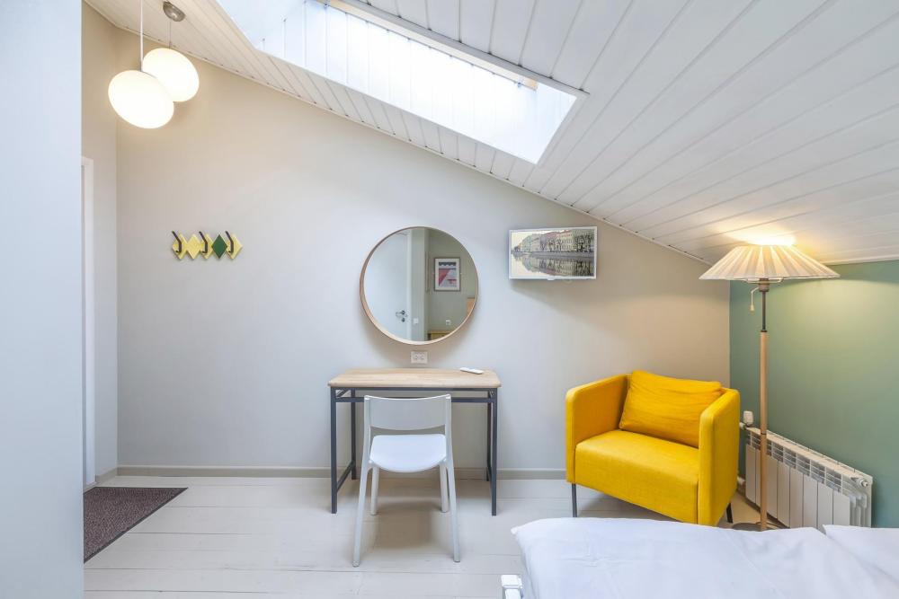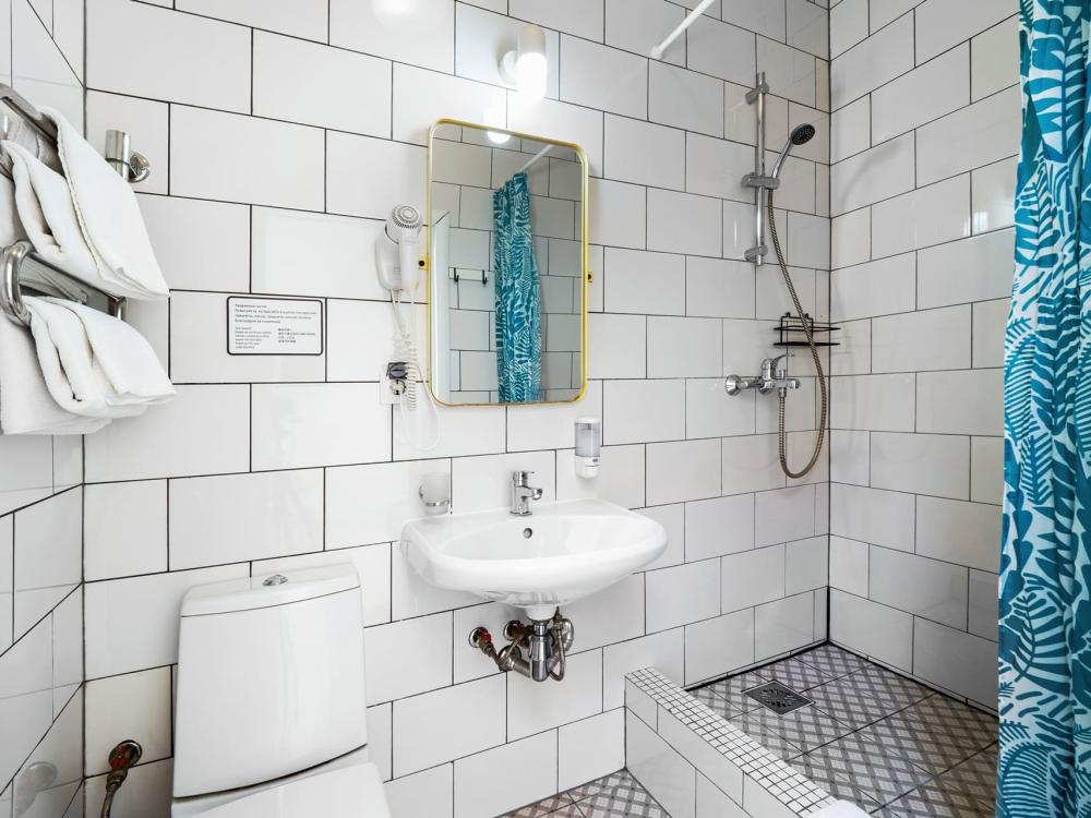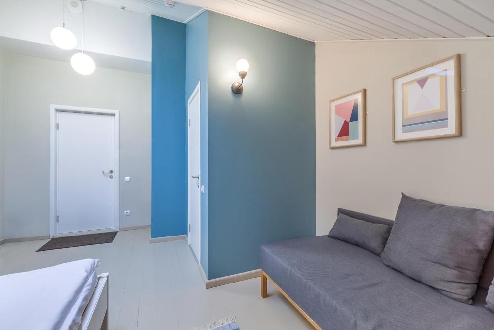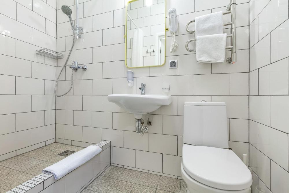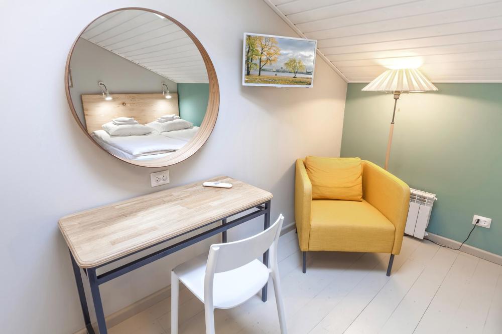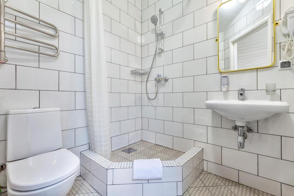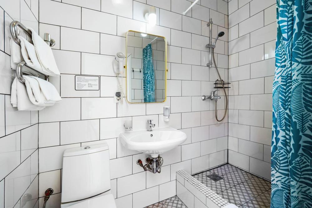 В номере: двуспальная кровать и односпальный нераскладывающийся диван, стол, стулья, полки для одежды, зеркало, ТВ. Вид из окна на улицу Ломоносова или Апраксин рынок. Удобства (душ, туалет) находятся в номере.