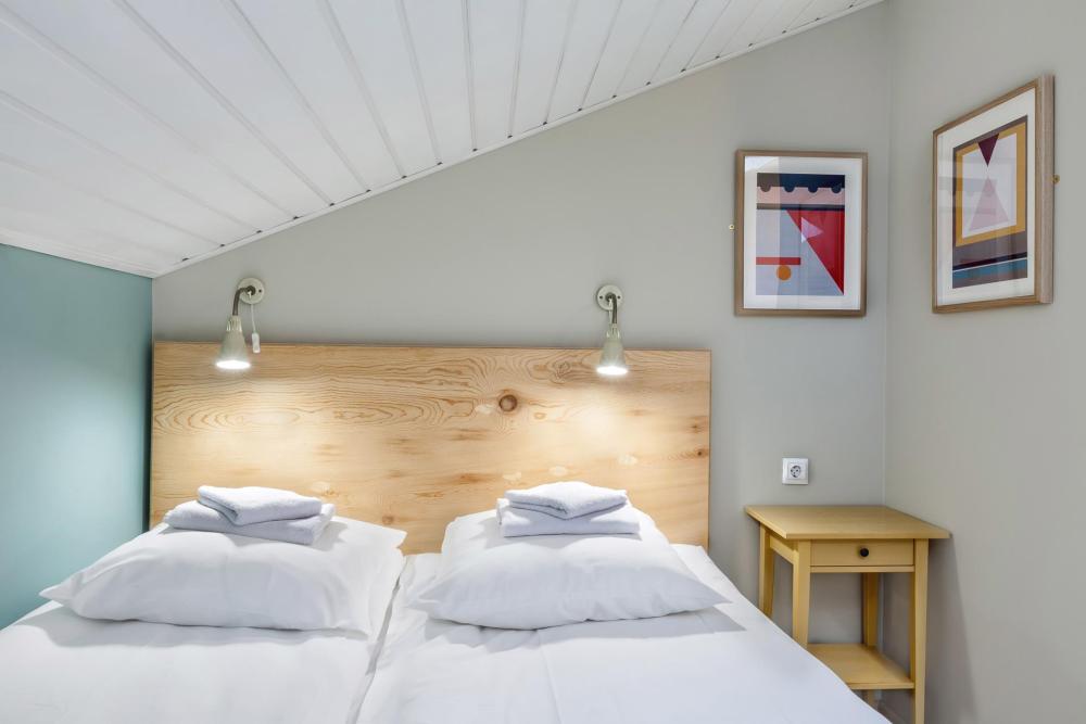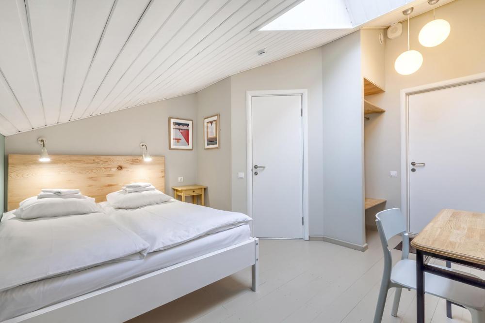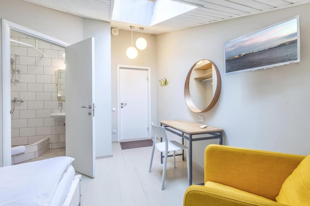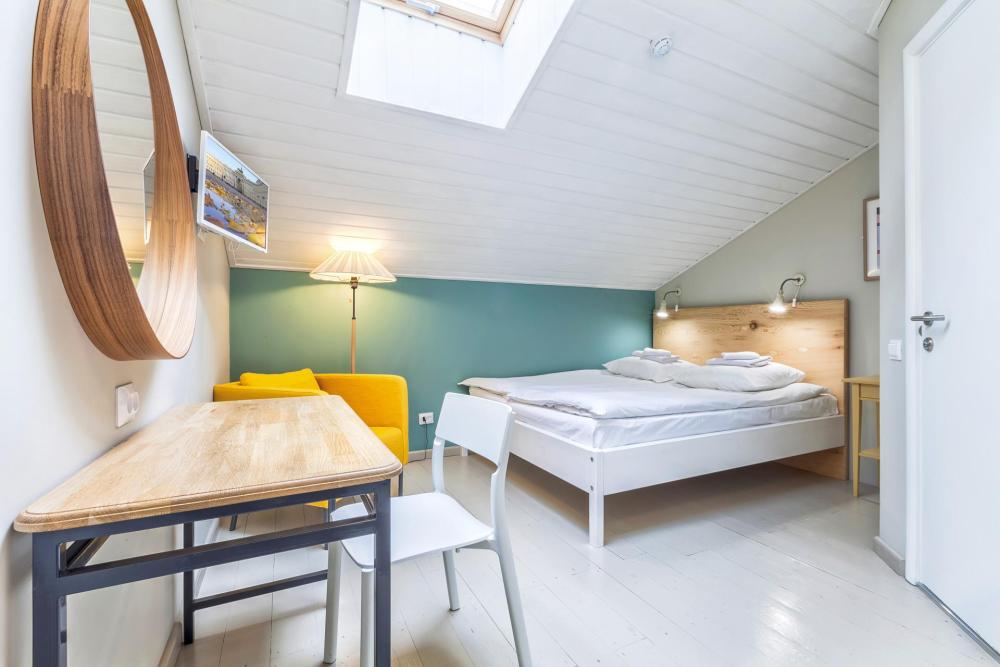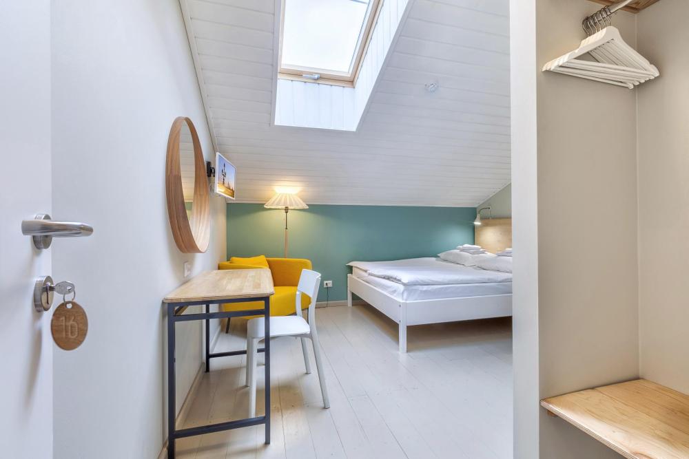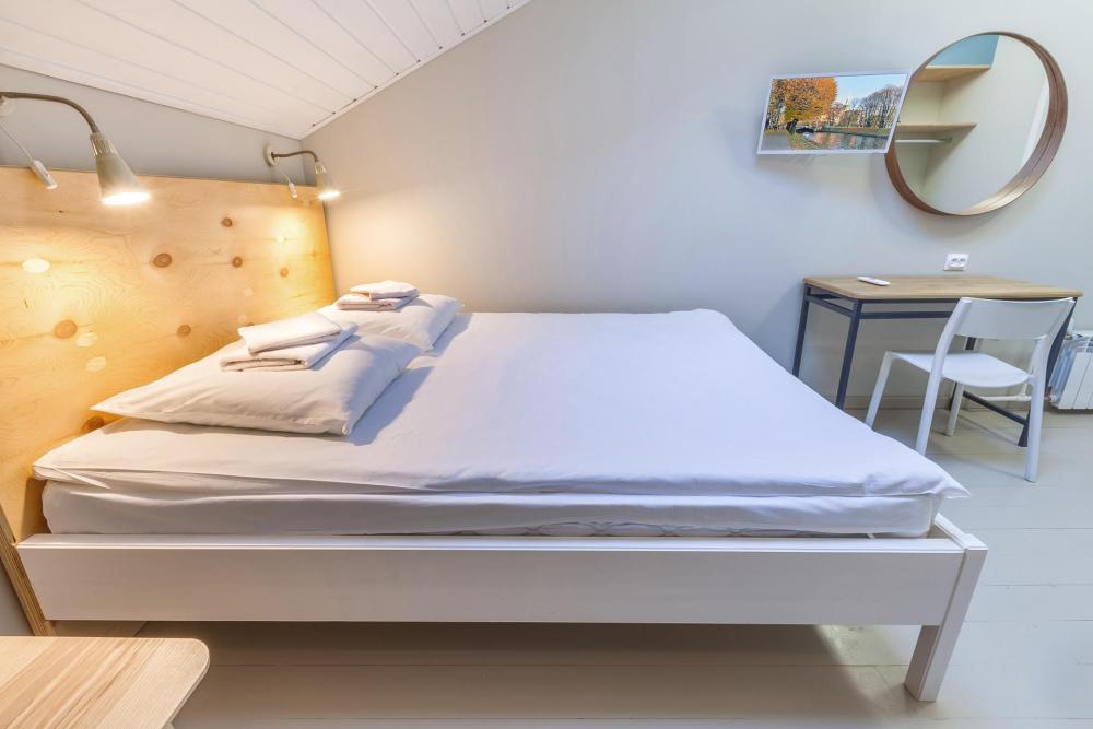 В номере: двуспальная кровать, стол, стулья, полки для одежды, зеркало, ТВ. Удобства (душ, туалет) находятся в номере.